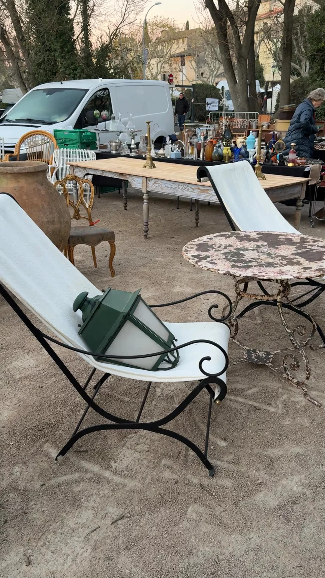 The kind of chairs that make you stay longer than you meant to. This pair of French garden lounge chairs, found in Villeneuve, features sculptural black iron frames with elegant scroll arms and low, reclined silhouettes, newly dressed in soft mid century bouti fabric that drapes gently across the seats and backs. Designs like this became popular in the mid 20th century for terraces and winter gardens, combining durable metalwork with relaxed, sling style comfort suited to long afternoons outdoors. Today they are just as compelling indoors as they are outdoors bringing an easy, Provençal rhythm to your space.