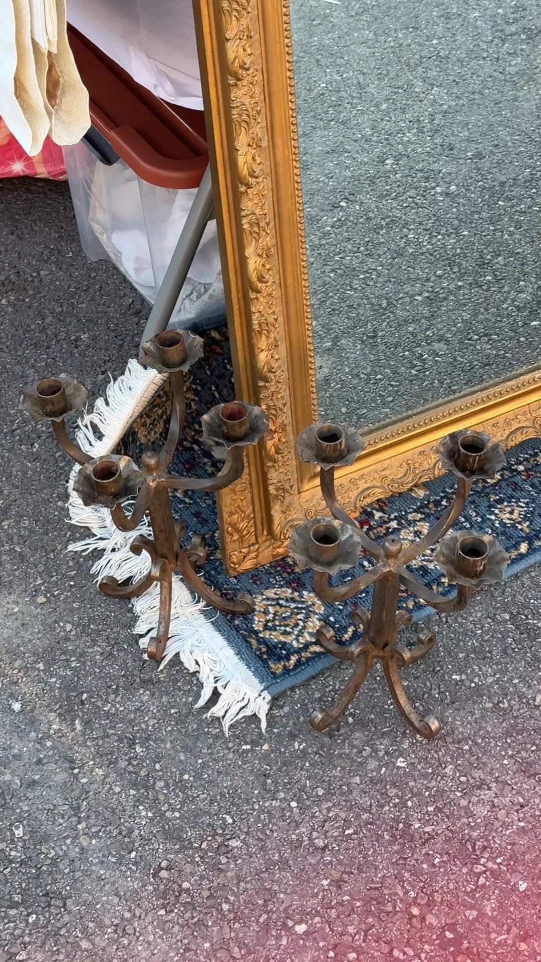 Some evenings call for candlelight rather than overhead lighting. This wrought iron candelabra, found in the Beziers, is shaped with four gently curving arms rising from a central stem, each cup set on a crimped bobeche that catches wax as it falls, all anchored by a scrolling tripod base that keeps it steady. Pieces like this were common in provincial homes before widespread electricity, forged by local blacksmiths who balanced function with just enough flourish to elevate the everyday. Sylvie sets it at the center of a dining table lighting all four at once so the iron softens in the glow and the whole room shifts with it.