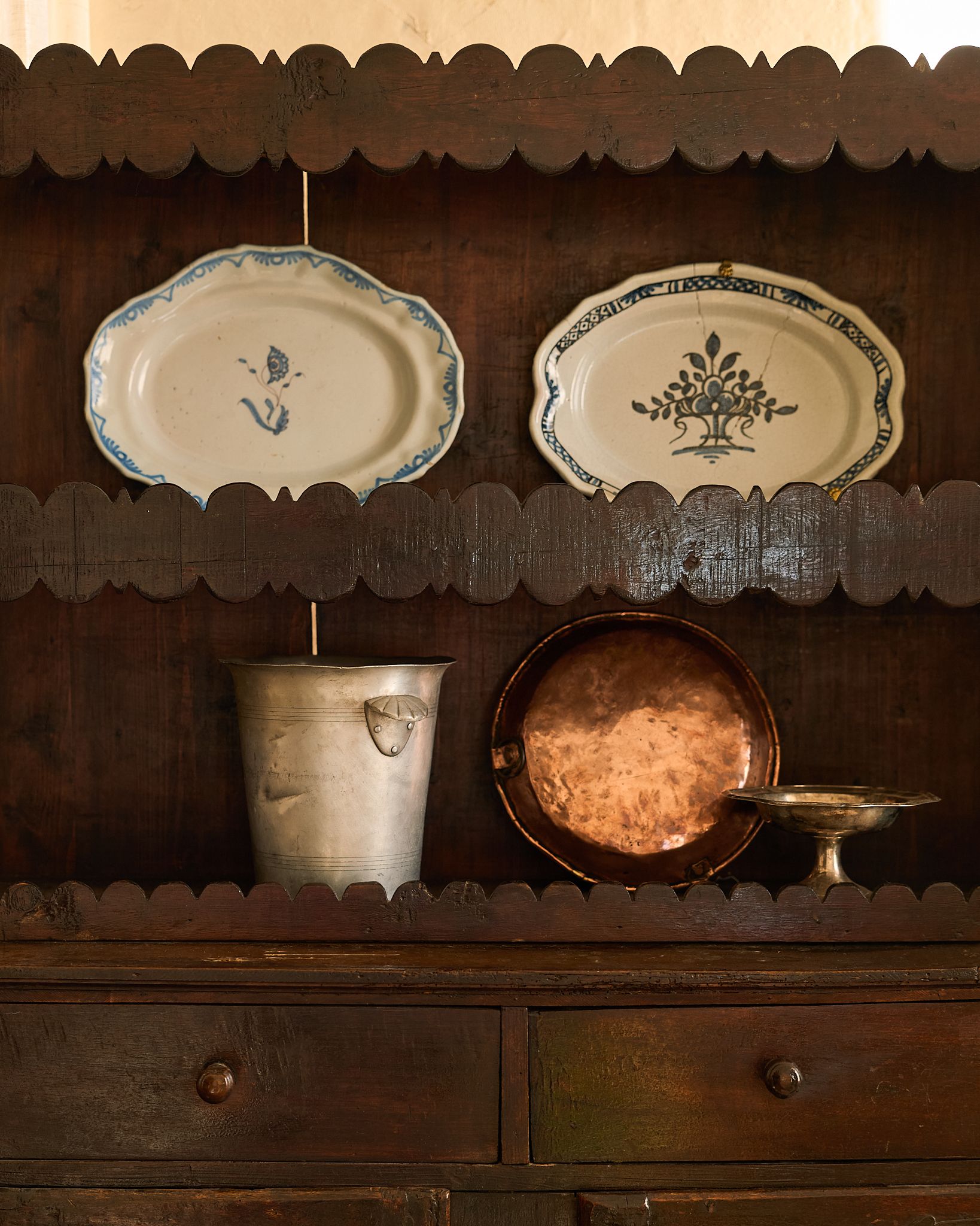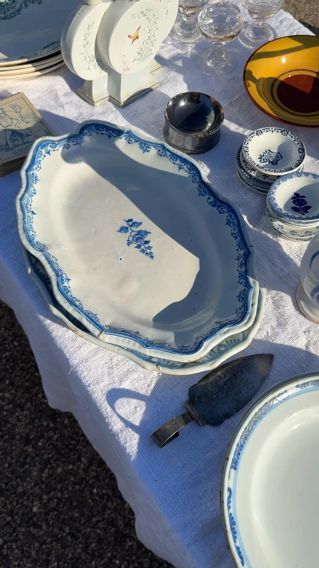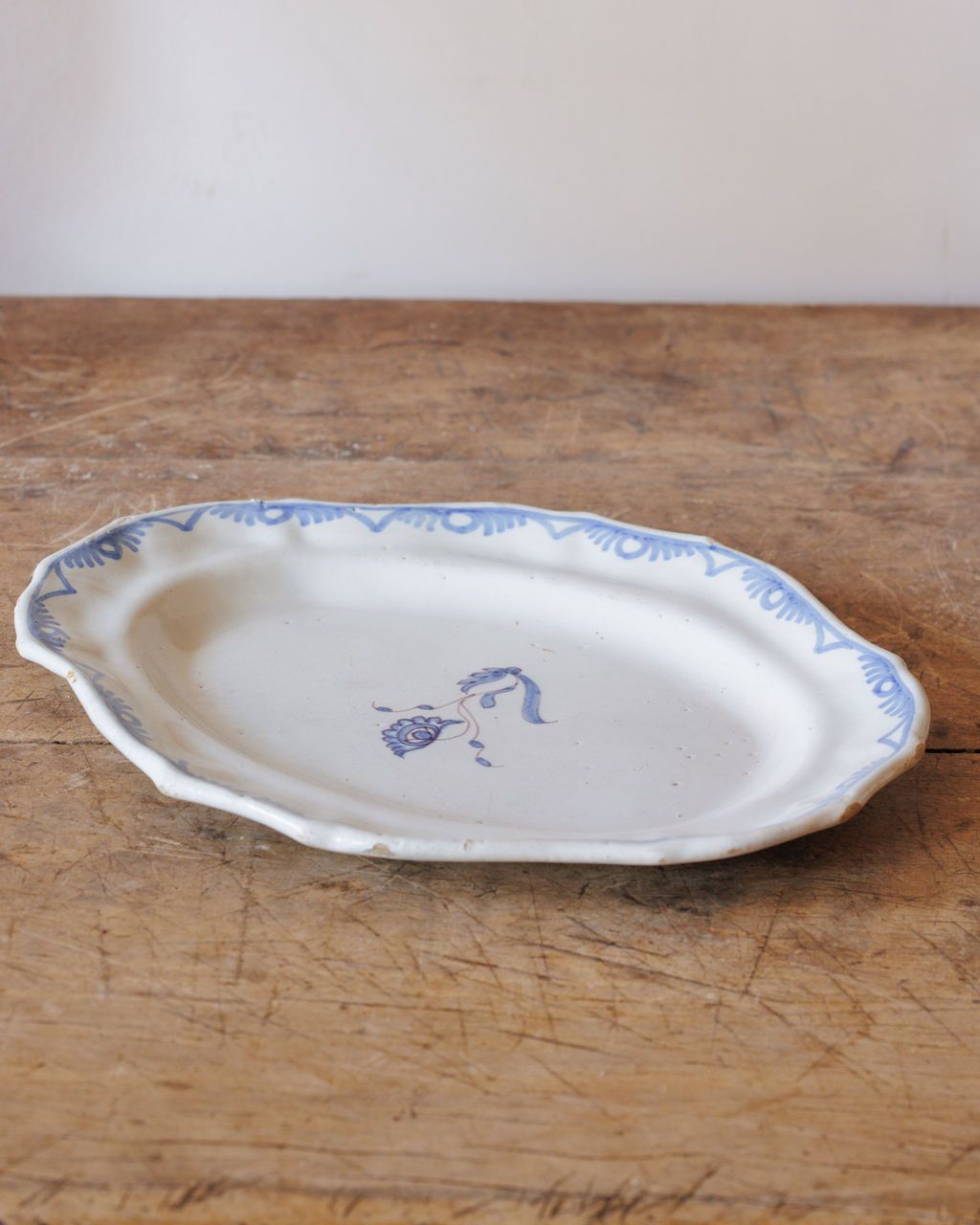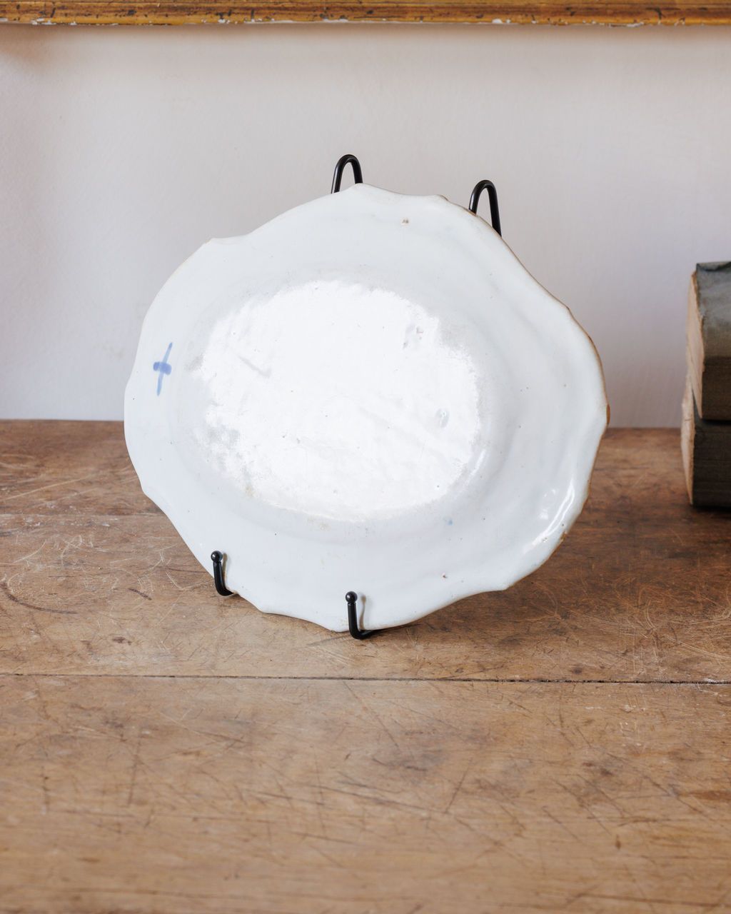 Found in Carpentras, this 18th-century faience plate was made in Moustiers-Sainte-Marie, the Provençal pottery village whose workshops became famous in the 1600s and supplied commissioned tablewares to aristocratic and royal households across France. The hand-painted floral spray and shaped rim are classic to the region, and you can see the brush move in the cobalt decoration. There is light wear to the glaze and small firing irregularities from the kiln, all consistent with age. Sylvie stacks these into a plate wall or rests one on a kitchen shelf where the blue picks up nearby linens and ceramics. Exactly as pictured.
