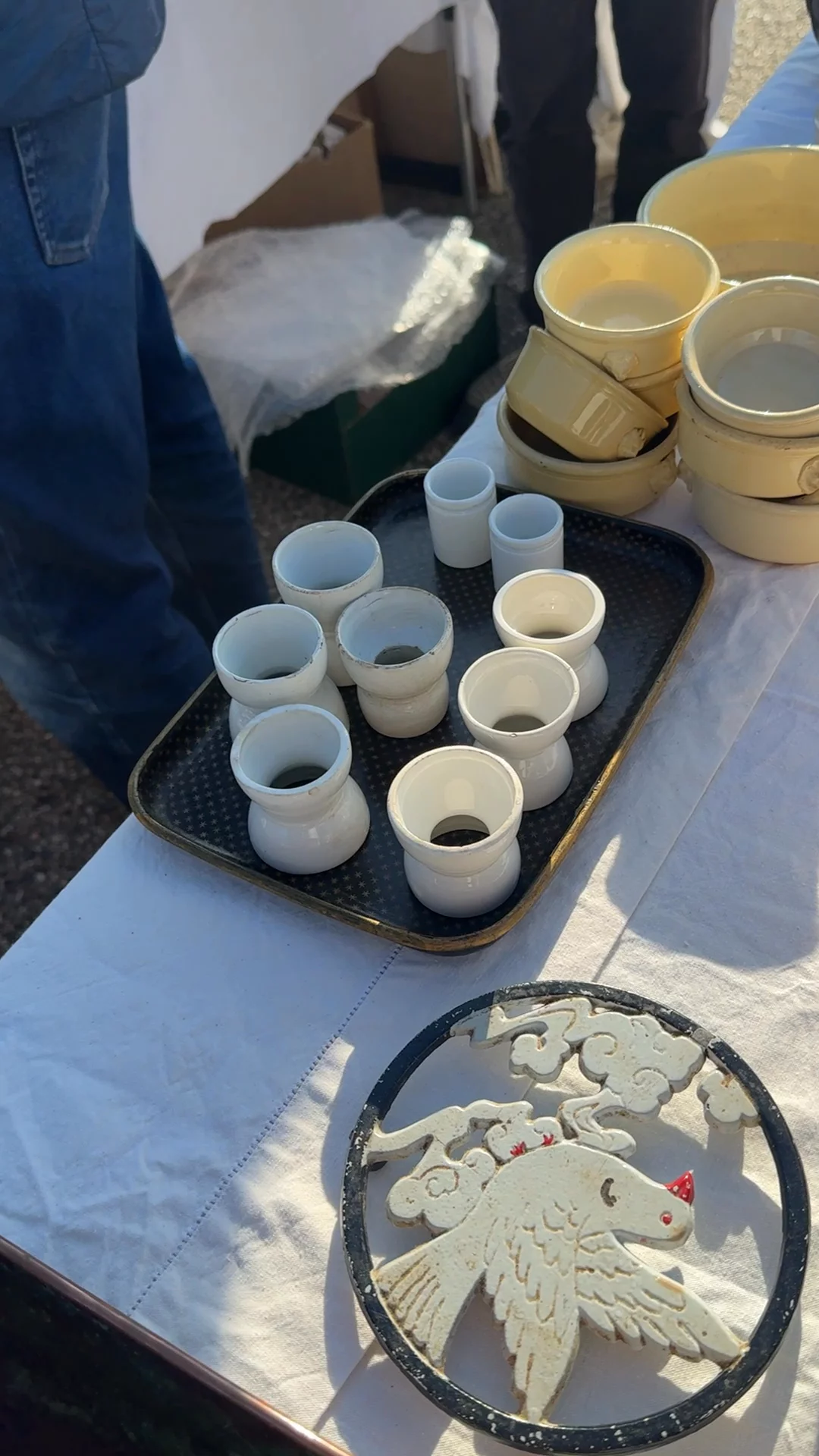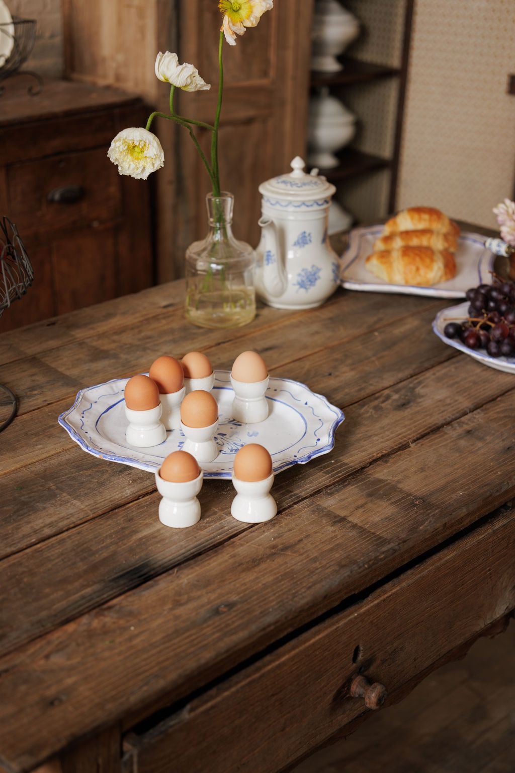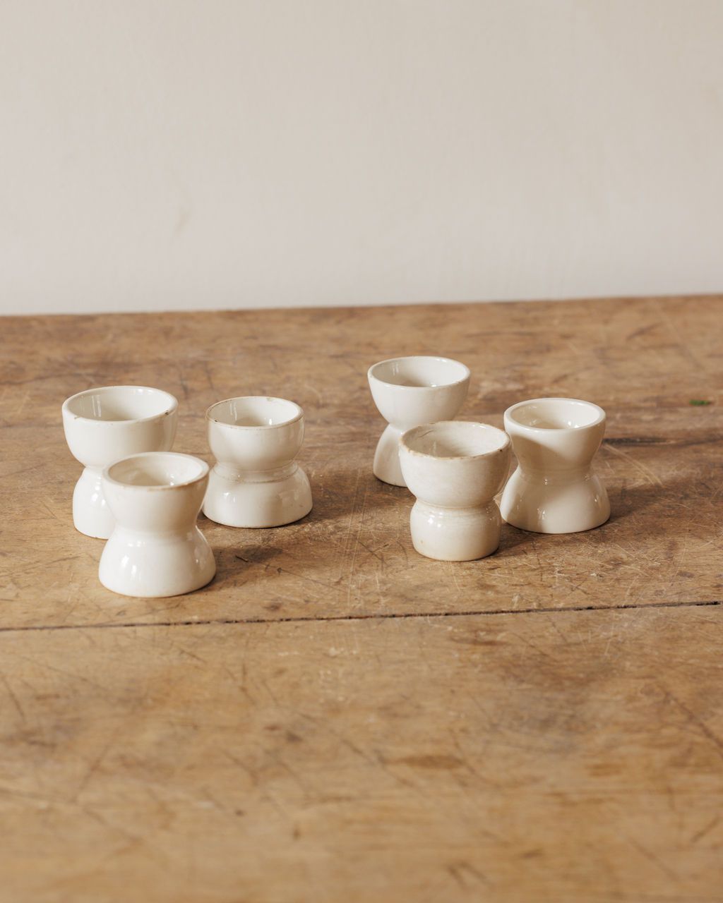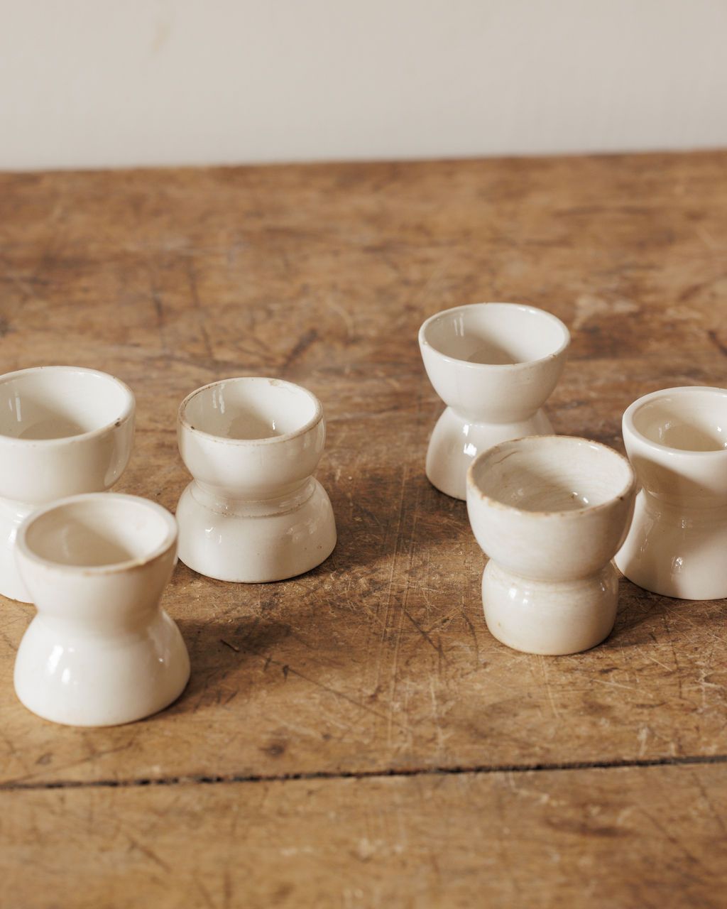 Breakfast deserves a little ceremony. These French ceramic egg cups, finished in a simple white glaze and found in Carpentras, were made to cradle soft boiled eggs at the morning table, a ritual perfected in French kitchens throughout the twentieth century where a quick tap of a knife sliced the cap clean off and toast soldiers went straight for the yolk. Their gently flared bases and classic proportions keep things steady and unfussy, exactly as intended. Sylvie loves them lined up on a blue and white plate for an unhurried weekend breakfast with good butter, strong coffee, and a stack of toast waiting its turn.