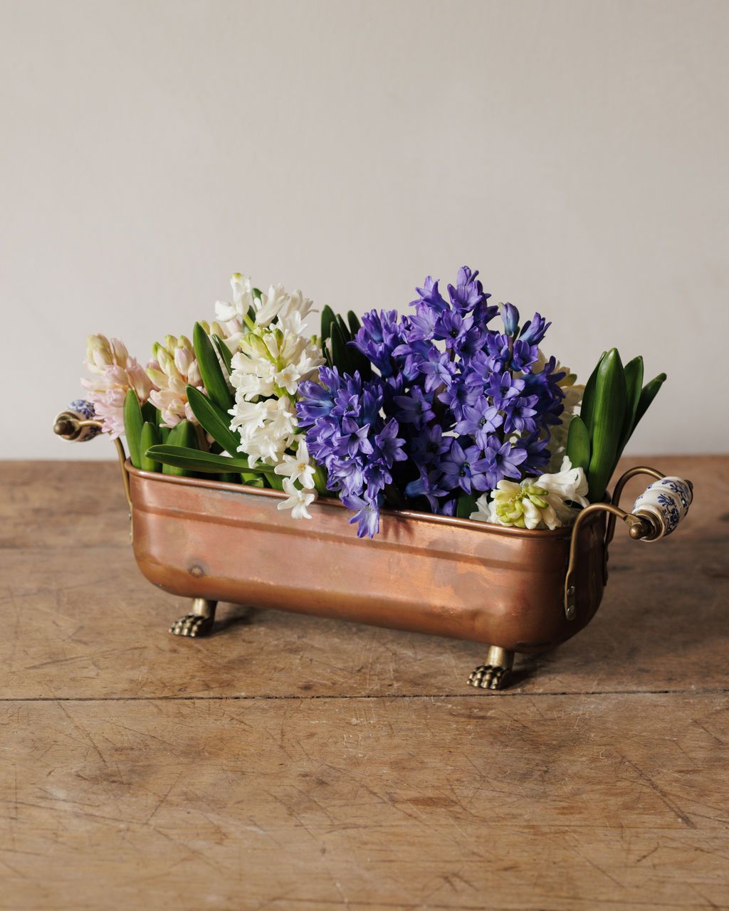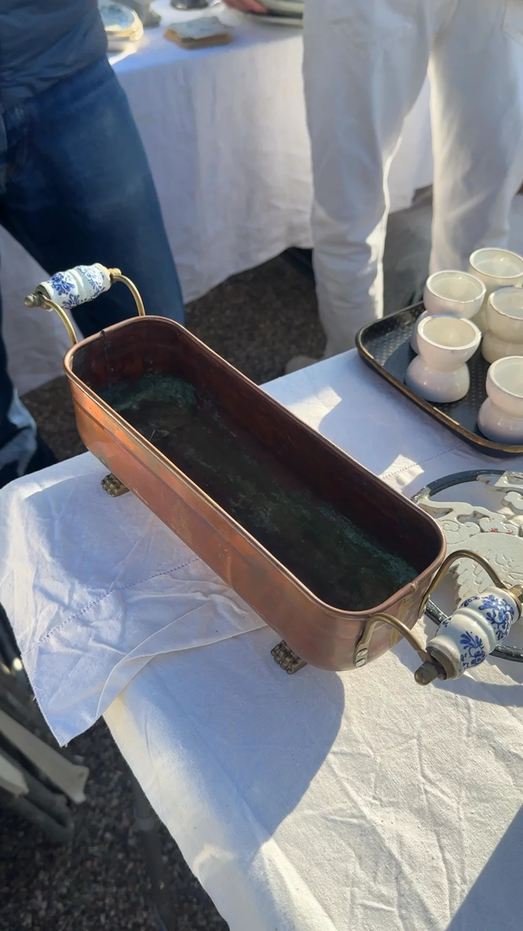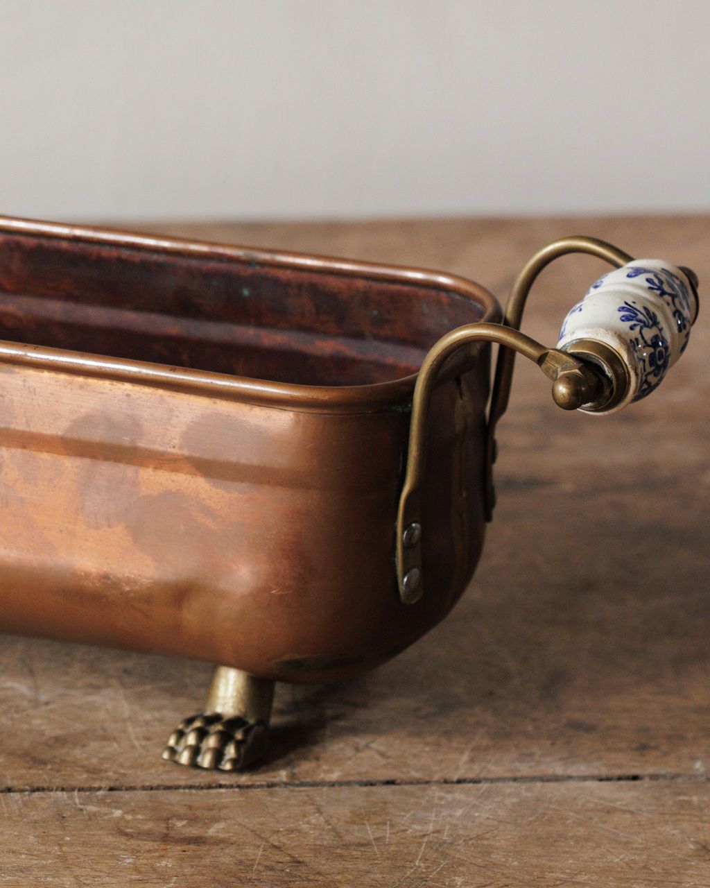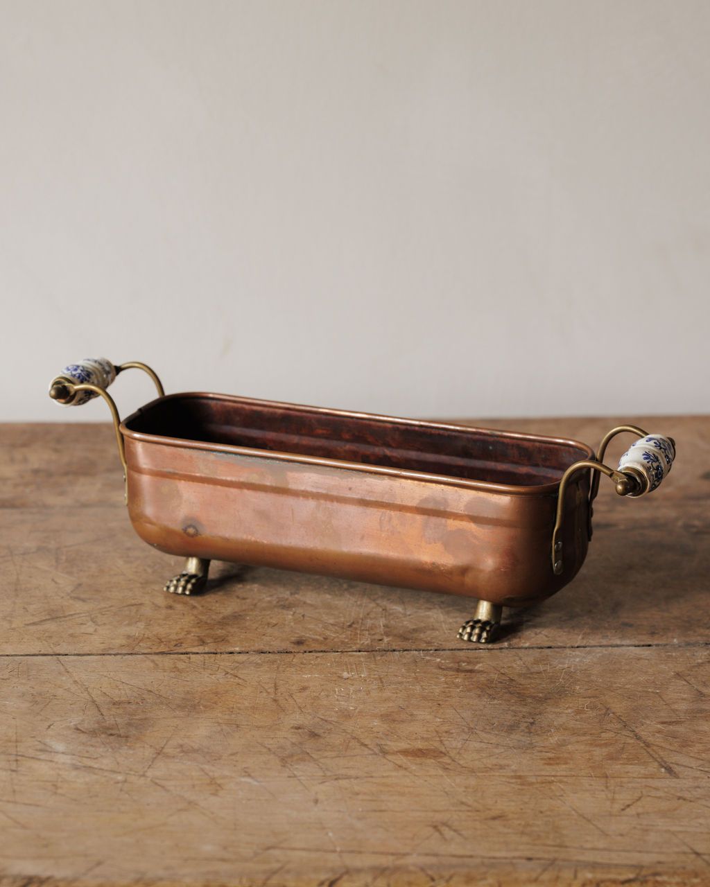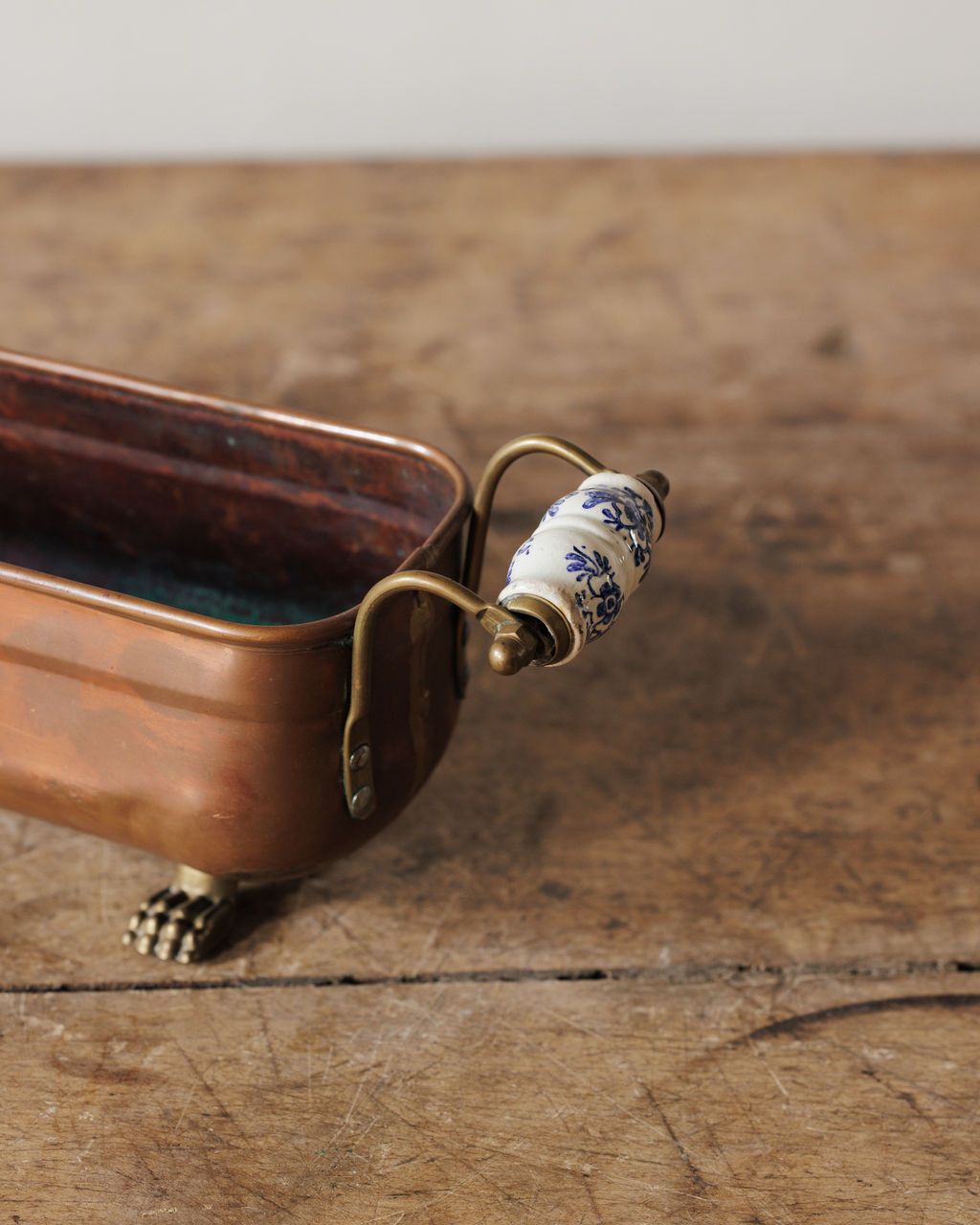 A little copper moment for the center of the table. This French jardinière, found in Carpentras, is made from warm, softly aged copper and raised on petite decorative feet that give it just enough lift. Originally used to hold potted plants or fresh cut flowers indoors, it would have brought a touch of polish to a dining table or mantel, especially in the late nineteenth to early twentieth century when copper accents were a favorite in provincial homes. The simple rectangular form is balanced by curved side handles with ceramic grips, adding both function and a bit of flourish. Sylvie loves it filled with clustered bulbs in early spring, letting the green leaves and bright blooms play against that rich copper glow.