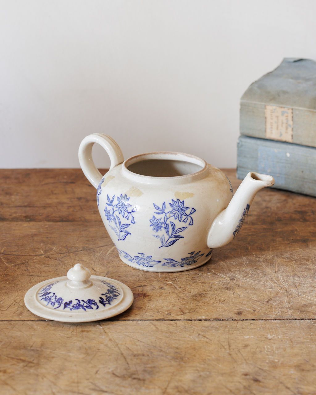 A small pot with serious heritage. Made in the Drôme region of France, this Saint-Uze teapot comes from one of the country’s most storied pottery traditions. The Saint-Uze workshops, founded in the early 19th century, became known for their creamy stoneware bodies and delicate blue transfer motifs- instantly recognizable and now deeply collectible. This petit example bears the classic floral pattern and gentle glazing that gave Saint-Uze its reputation for refinement. Once used for afternoon tea in a provincial home, it now looks perfectly at ease on an open kitchen shelf or set beside mismatched cups for an everyday ritual.