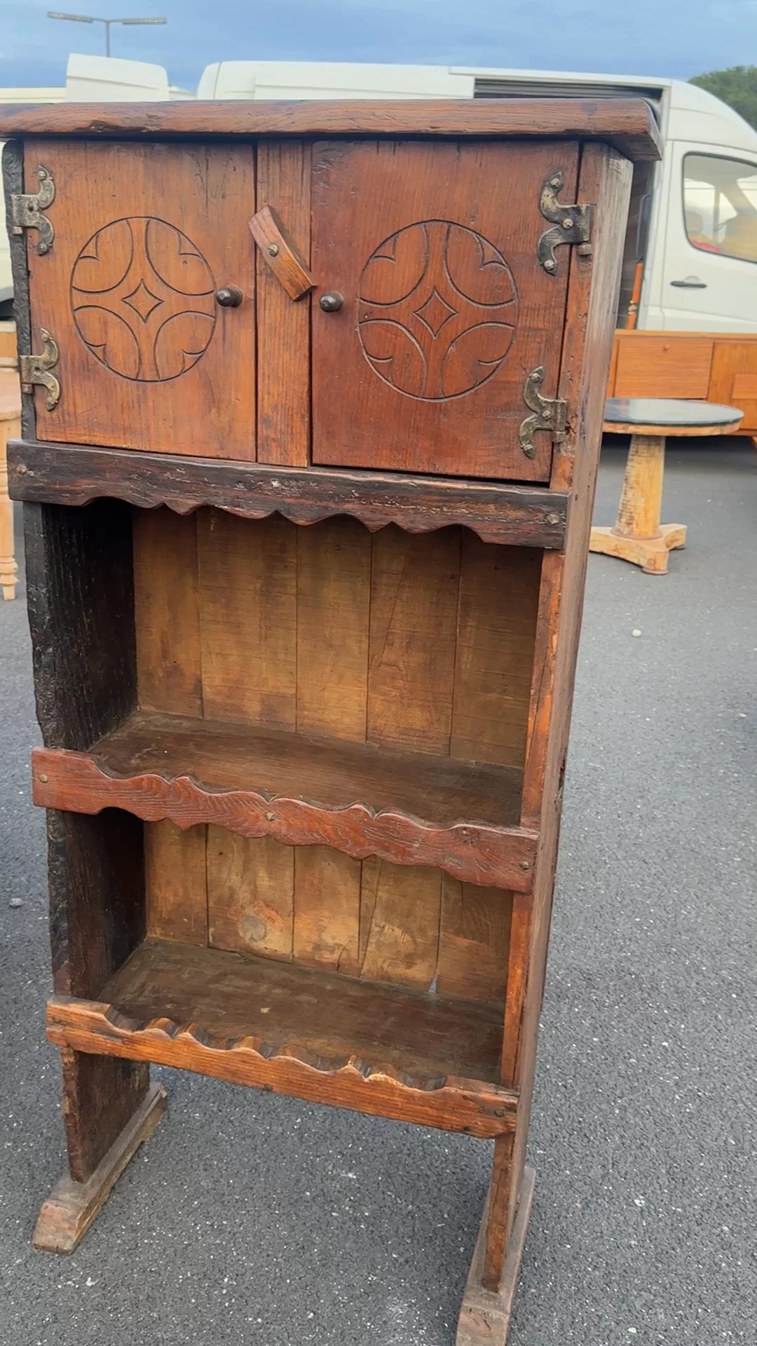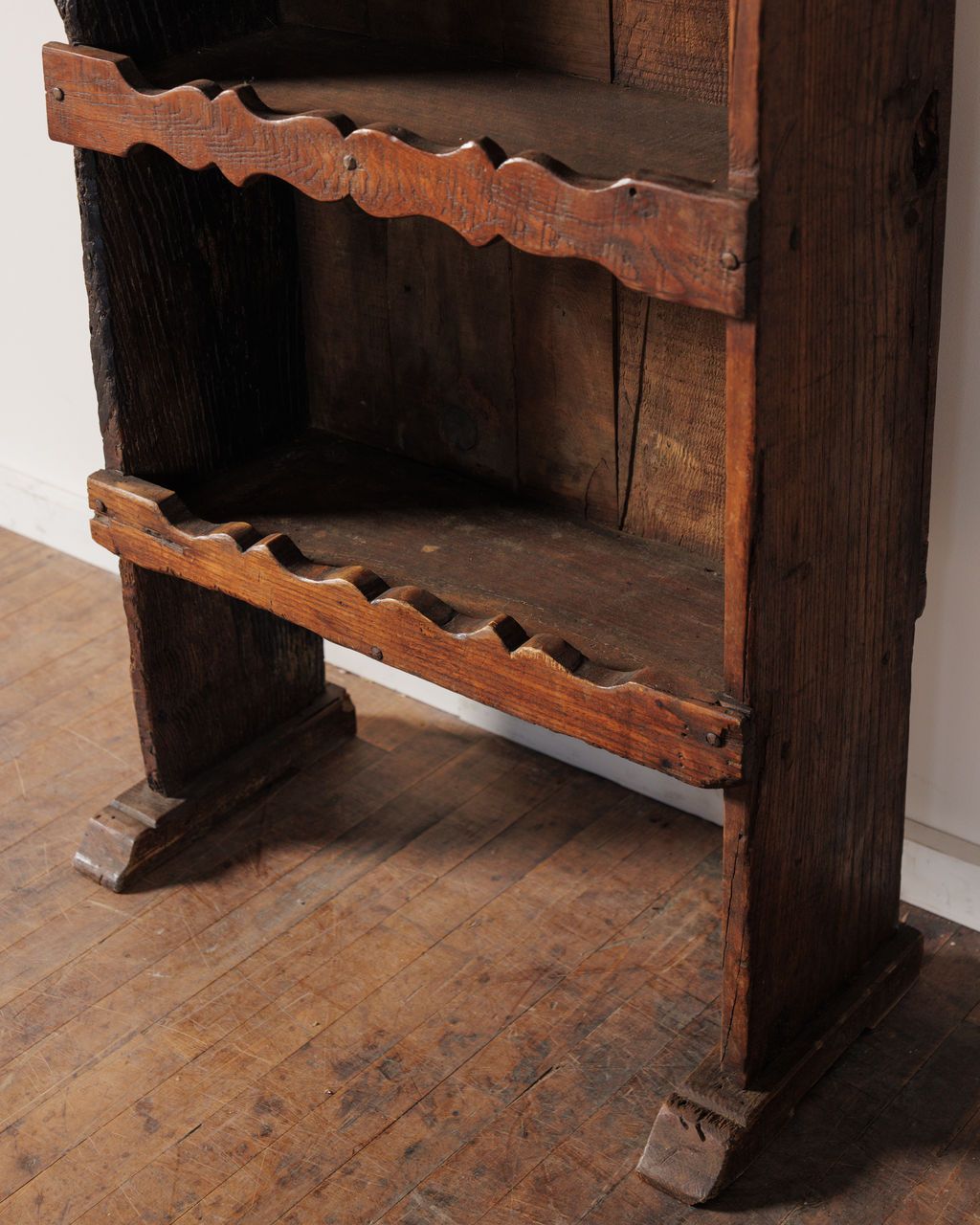 This one comes out of the rhythm of Alpine homes. Found in the Alps and dating to the 19th century, it was built for the “stube,” the main living space where cooking, eating, and daily life all happened. The upper cabinet kept more sensitive goods tucked away - flour, linens, anything worth protecting - while the open shelves below held what stayed in rotation. It’s all solid wood, built locally and meant to last, with carved door panels and scalloped edges that nod to regional craft. The wear sits right where it should. Sylvie keeps it in a kitchen or dining space, stacked and slightly overfilled.