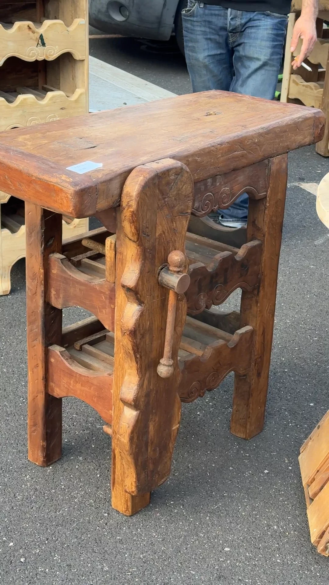 A workbench that lived two lives in the winery. Found in Bordeaux, this sturdy wooden bench once served both as a practical work surface and a place to store bottles, a common dual-purpose piece in vineyard workshops where space and utility mattered. The thick plank top and functional front vise were used for repairs and everyday tasks, while the built-in racks below kept bottles of wine close at hand. Its dark wood, carved details, and deep patina show the wear of years spent in a working cellar. Sylvie loves it now as a wine rack and console where bottles, glasses, and a vase of flowers feel perfectly at home.