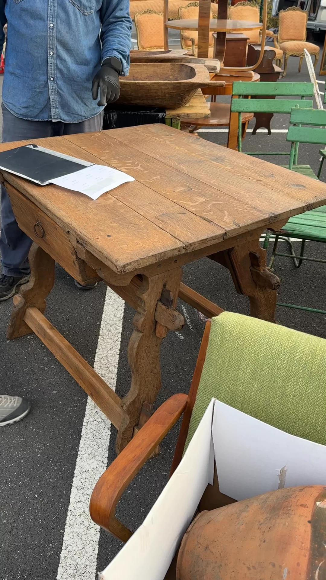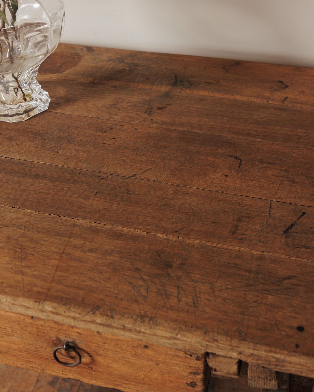 You don’t see this kind of construction unless it was meant to be taken apart, moved, and put back to work again. Found in Béziers and originally from Spain in the 19th century, this oak table follows the tradition of mesa de campo - built in separate elements so it could be carried between rooms or even between houses, then slotted back together with everything locking firmly into place. The base is all joinery and intention, with pegged stretchers and shaped legs that hold the structure without relying on nails, while the single drawer sits deep and practical, made for tools, cloths, or whatever stayed in constant rotation. Sylvie loves it in an entryway, keys dropped at the corner, a bag set down for a moment that turns into hours, the surface quietly collecting the first and last things that pass through the door.