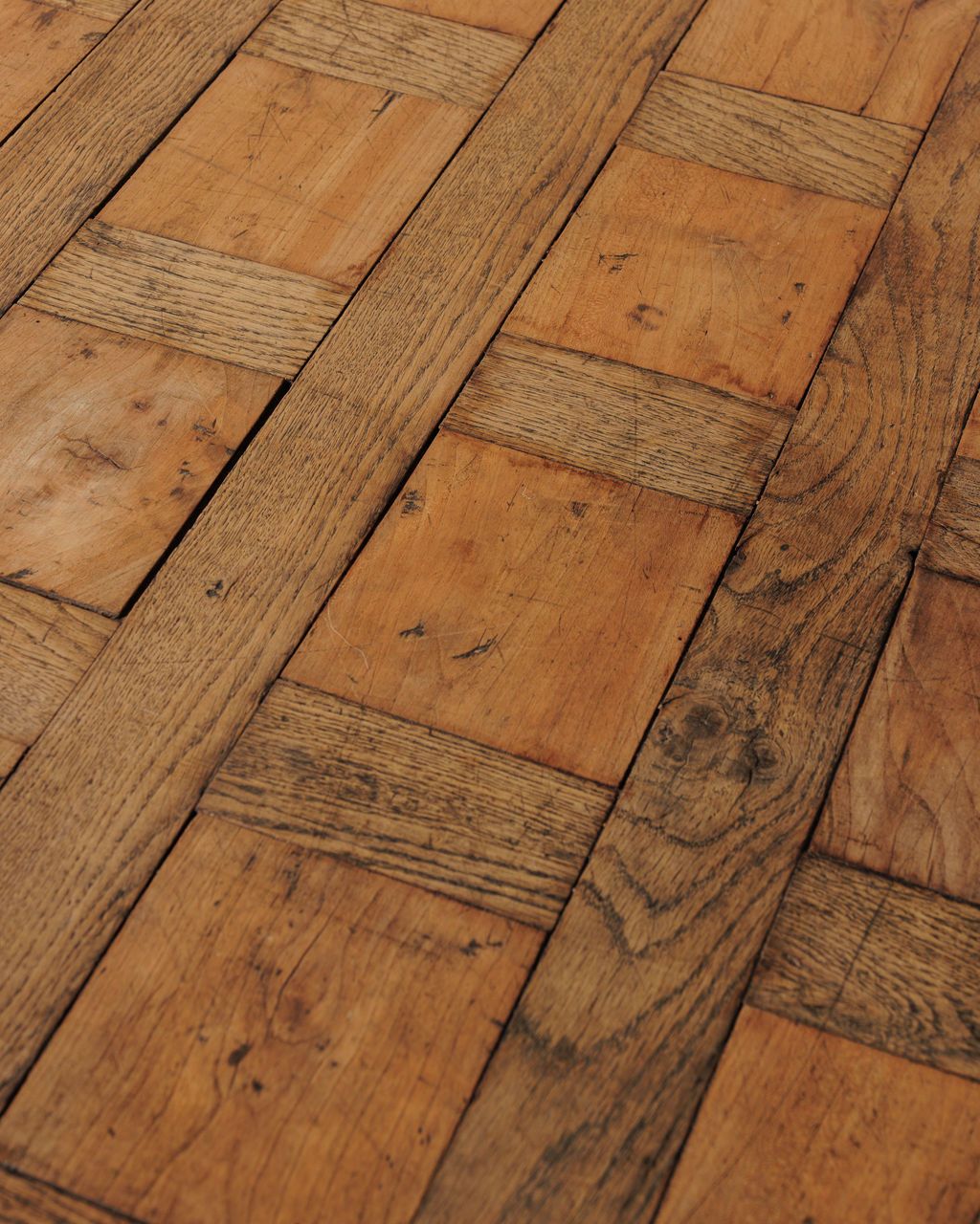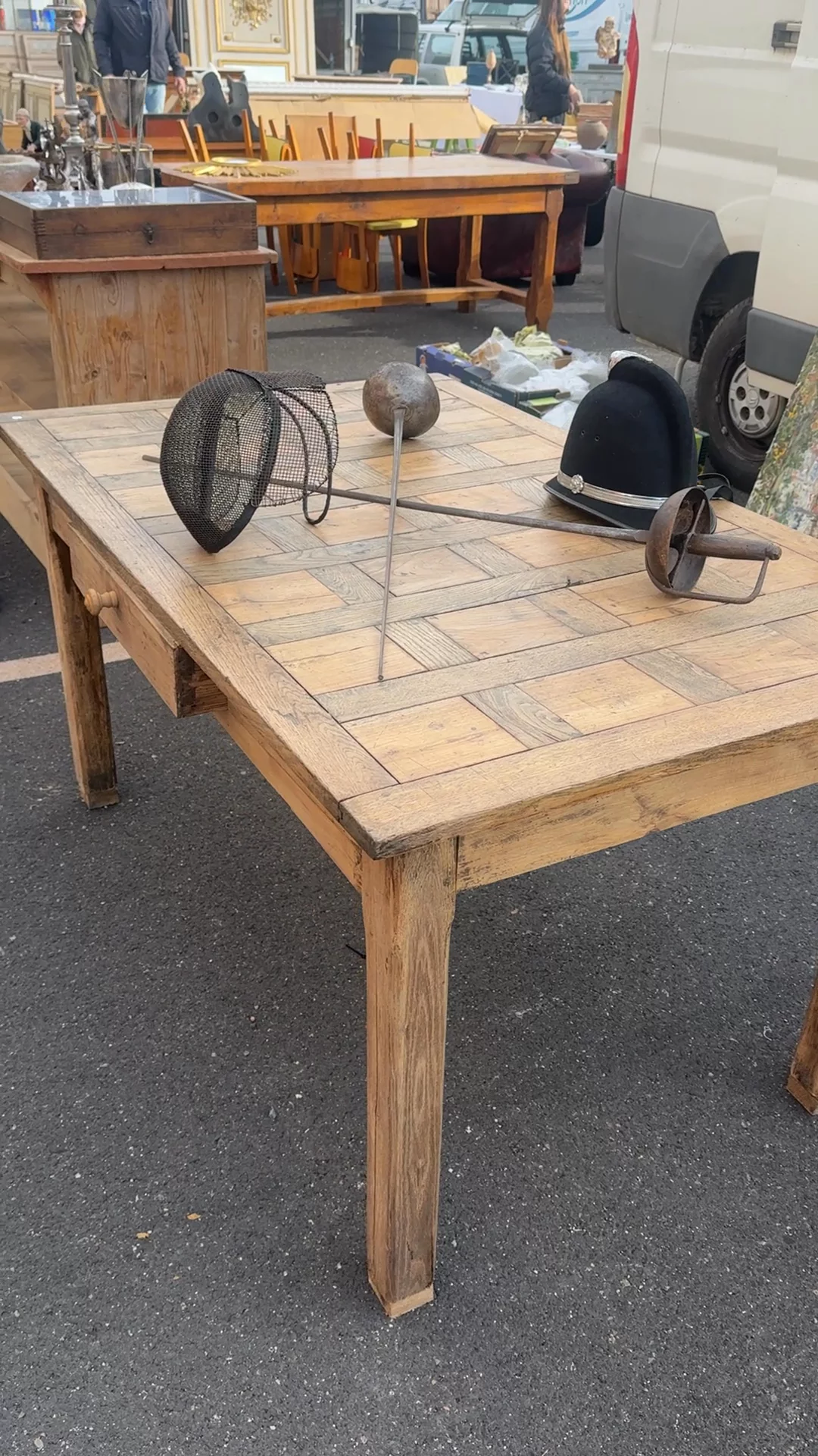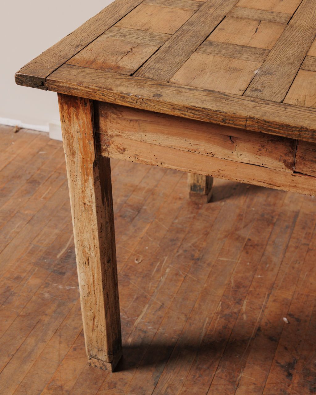 This 19th-century farm table, found in Béziers, has a worn parquet top made from narrow planks set in a simple pattern. A single center drawer with a wooden knob sits just beneath the edge, and straight legs keep it steady. Tables like this stayed in constant use. Meals were prepared here, linens folded, and neighbors lingered long after supper. The surface slowly recorded it all. Sylvie uses it as a dining table or kitchen work table, where the patterned top and softened pine make everyday routines feel a little more grounded.