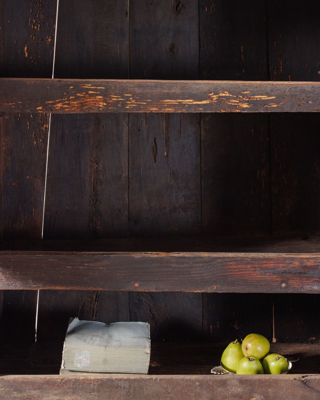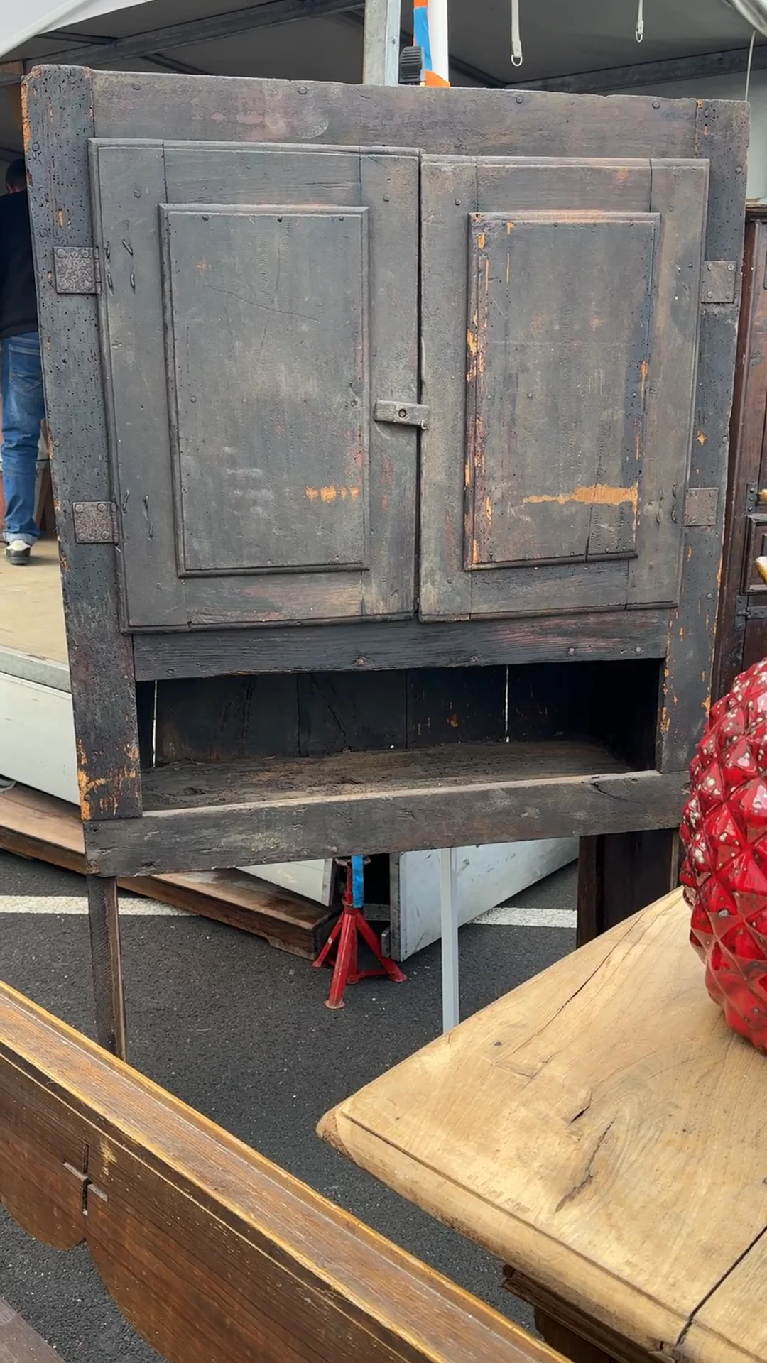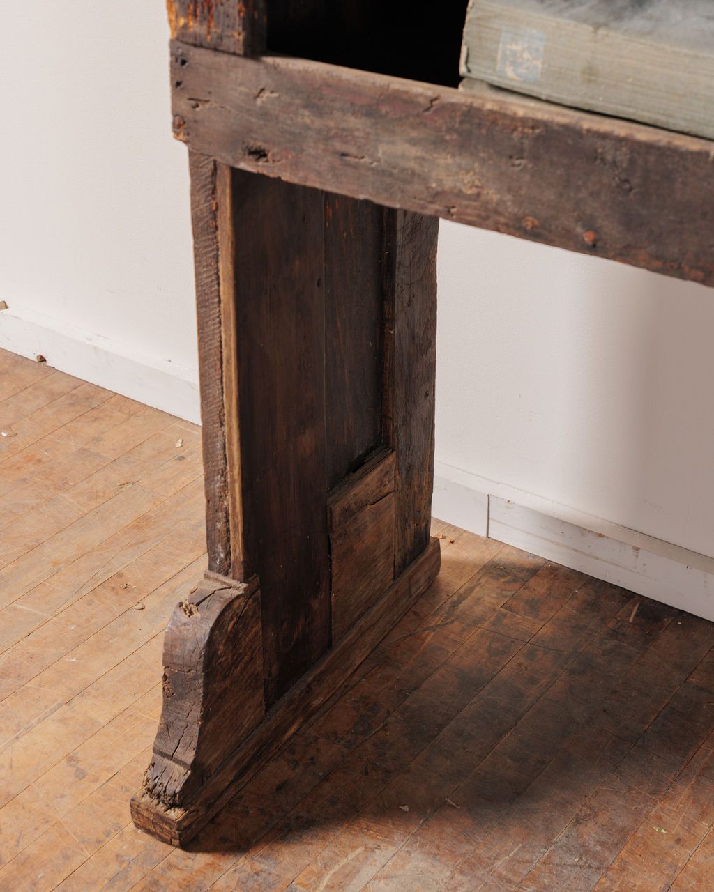 This breathtaking 19th century Portuguese cupboard is crafted from thick, hand joined wood with a deep, almost blackened patina that reveals flashes of warm undertones at the edges and corners. Two upper cabinet doors with simple iron hardware sit above an open shelf, all supported by tall, sturdy legs that give the piece an architectural presence. Originally used for practical storage by the hearth, it would have held pantry goods or household essentials within easy reach. Today it works beautifully as a statement piece in a kitchen or dining room, where its raw finish brings depth and character to the room.