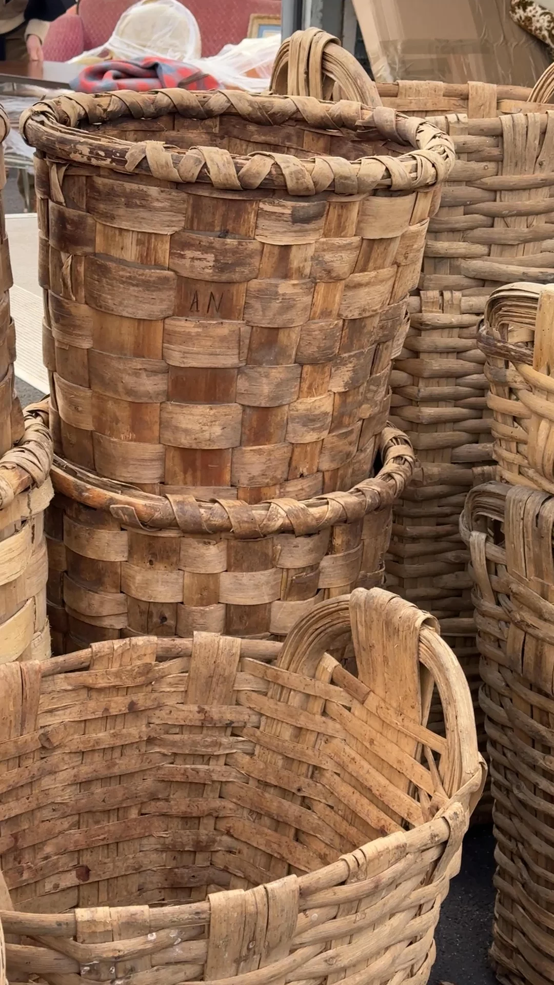 Hardworking baskets with a story to tell. These tall Portuguese grape harvesting baskets are woven from sturdy strips of wood and were once carried through vineyards during harvest. Workers often carved their initials into the sides so they could keep track of how much fruit they gathered during the day, small marks that still remain on some of the baskets today. Sylvie loves them repurposed as oversized laundry baskets or filled with blankets beside the sofa.