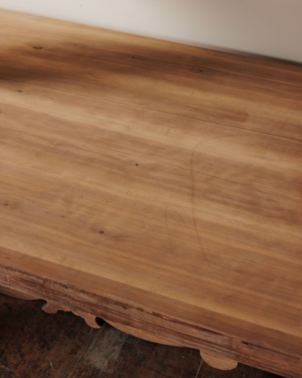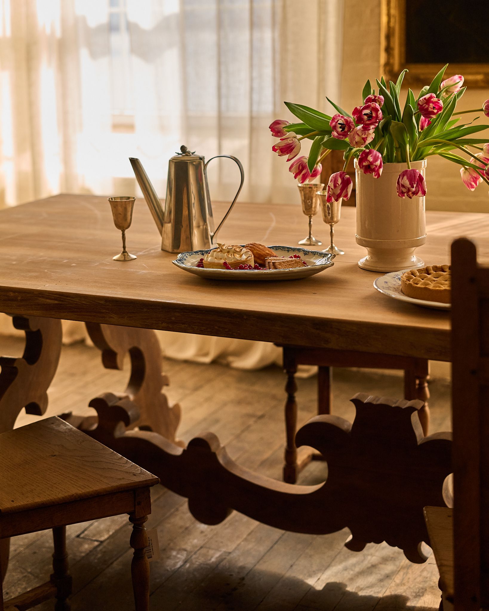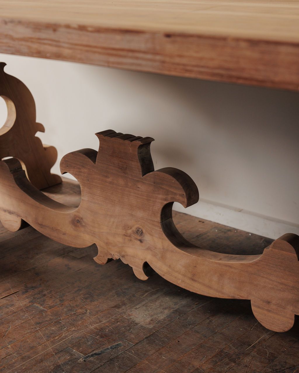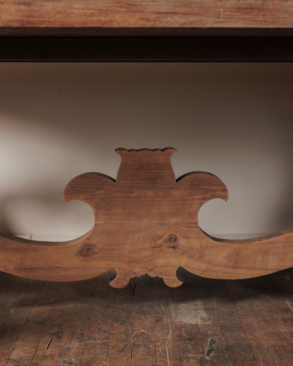 A table made for long meals and longer conversations, the kind that stretch well past sunset. Built in the Spanish refectory tradition and found in Spain, this 19th c. walnut dining table has been sanded back to its raw wood, revealing a wide, plank-built top with visible joinery and a soft, matte finish. Beneath it, the base is where the story really sits, with sculpted trestle ends and a deeply carved central stretcher that anchors the whole piece with weight and intention, all in solid walnut nearly two inches thick. Tables like this descend from medieval refectory forms, originally used in monasteries where long, narrow tables allowed rows of diners to sit together while servers moved freely alongside, a design that carried into Spanish domestic life with more sculptural, Baroque-influenced bases. Sylvie keeps it in a dining room that opens to the garden, set with a ceramic pitcher, a loaf of bread torn by hand, and a scattering of lemons that never quite make it to the plate.