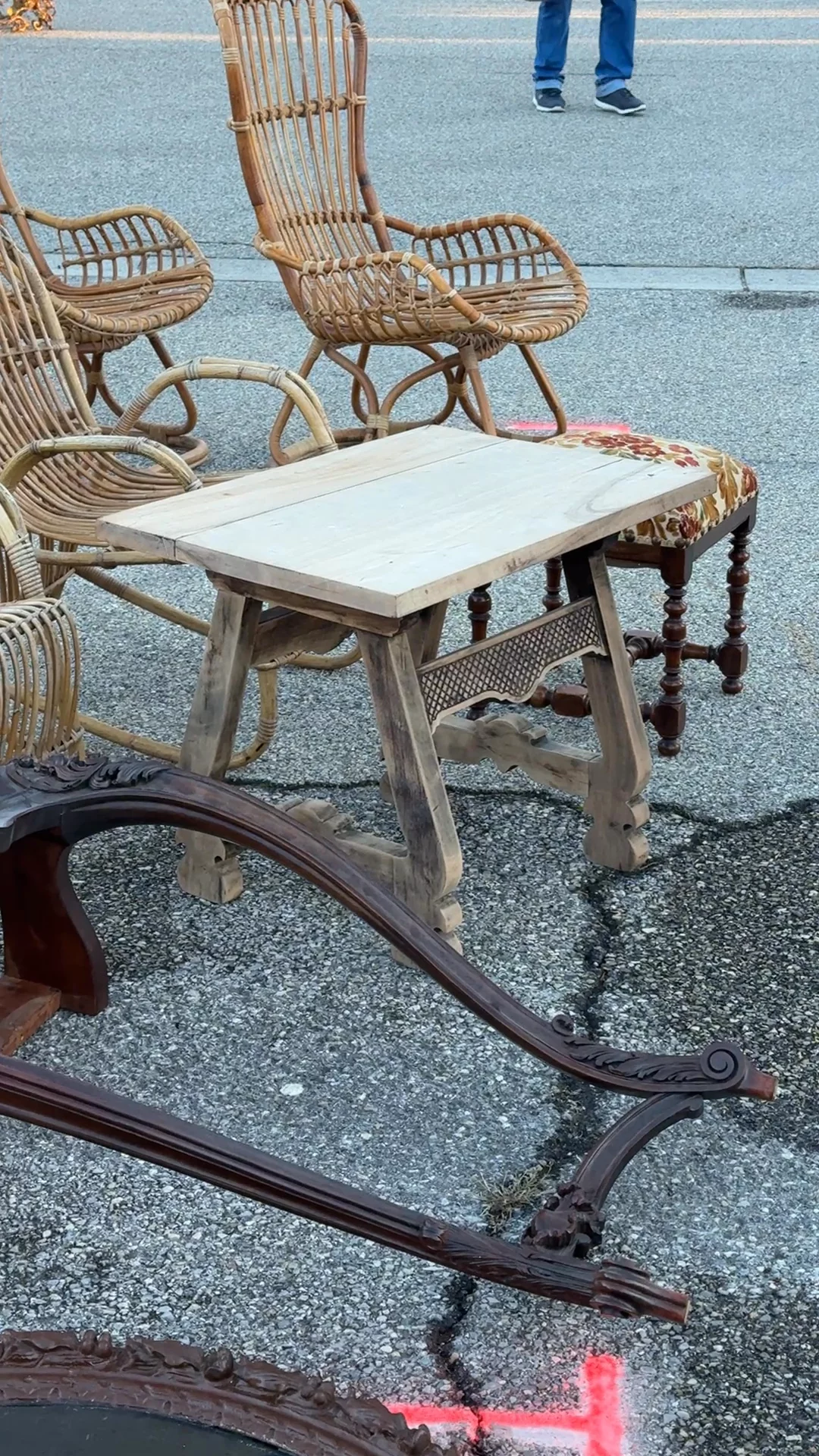 Hola, hermosa! Found in Montpellier and dating to the early 20th century, this side table follows a form rooted in much earlier Spanish trestle construction, where stability came from angled legs tied together with a central stretcher rather than relying on heavy mass. Tables like this evolved from farmhouse and refectory pieces, scaled down over time into smaller side tables while keeping the same joinery logic and stance. Sylvie loves it next to a sofa with a single lamp and nothing else, let the base be the thing you notice.