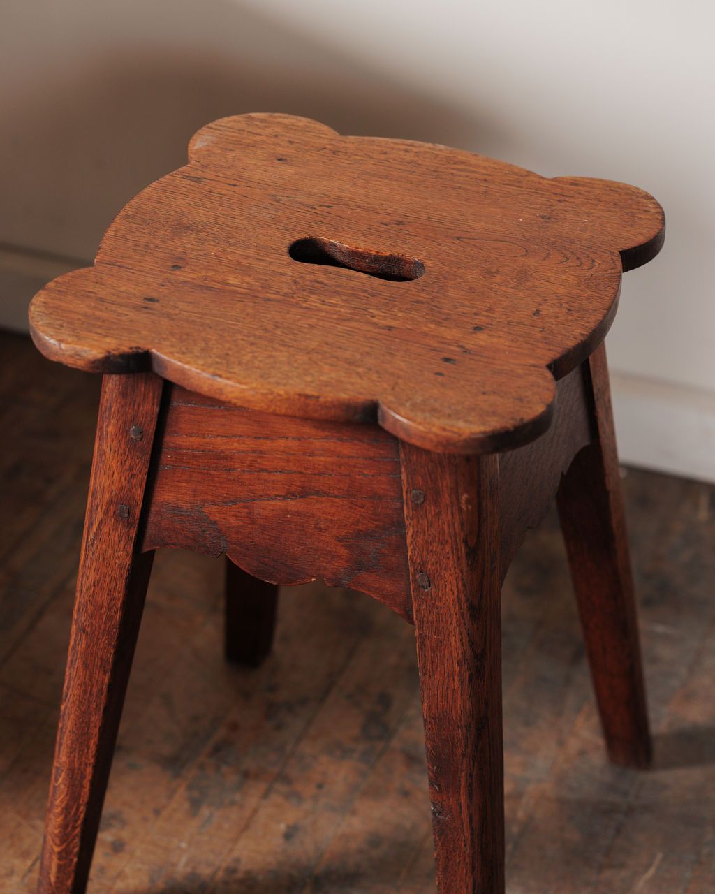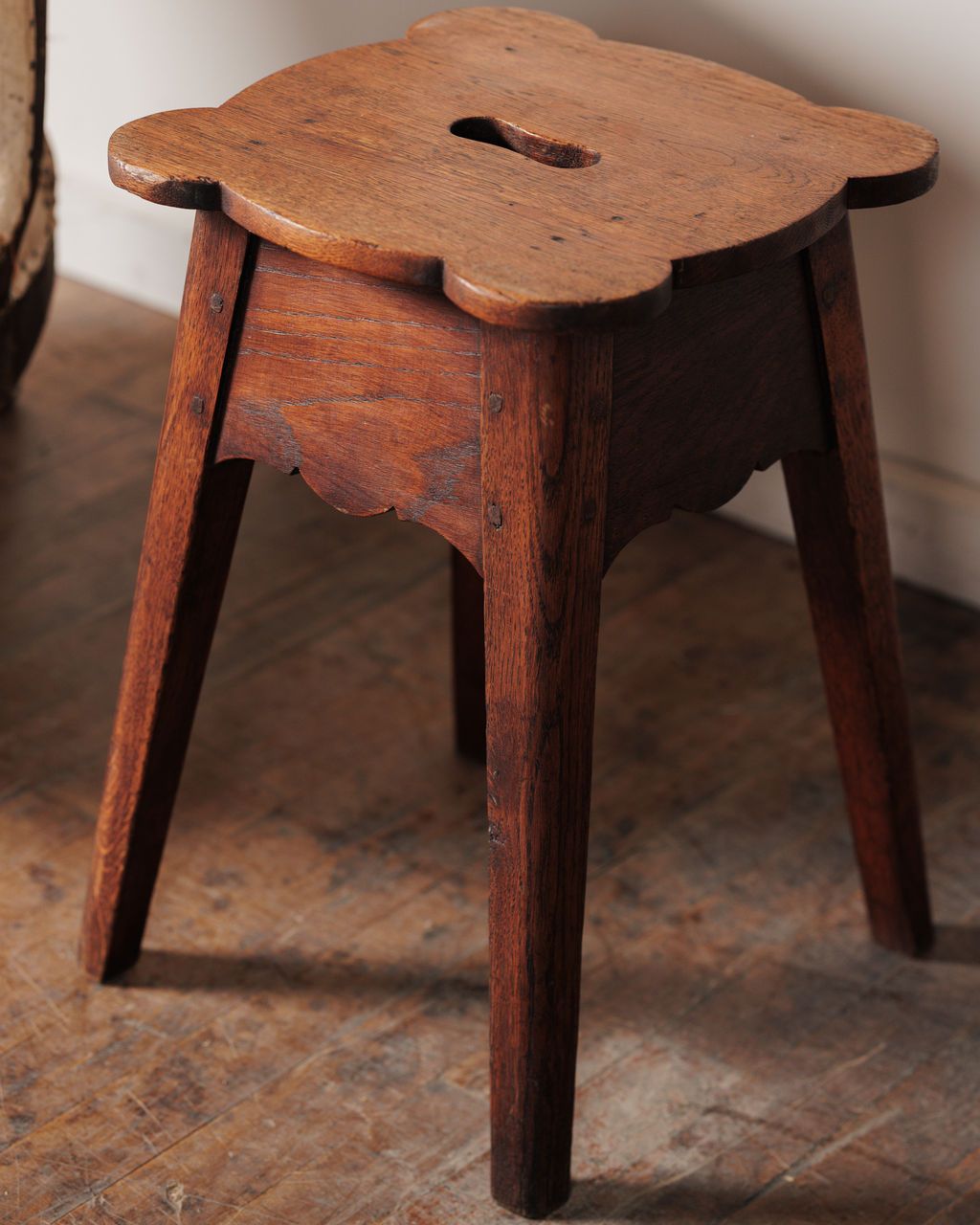 Pulled up beside a deep armchair, this is the kind of stool that quietly holds your place for an afternoon, a cup of tea within reach, a book you’re not quite ready to put down. Made from dark, fumed oak, the scalloped top and carved apron reflect a long tradition of simple European utility furniture, where small, portable stools were shaped with just enough detail to elevate the everyday. The cut-out handle at the center was designed for easy carrying from room to room, a practical feature that still feels thoughtful now. Sturdy and well-balanced with tapered legs, it works just as easily as a side table as it once did as a seat. Sylvie loves it exactly here, close to a generous chair, doing its quiet job beautifully. Two available, sold separately.