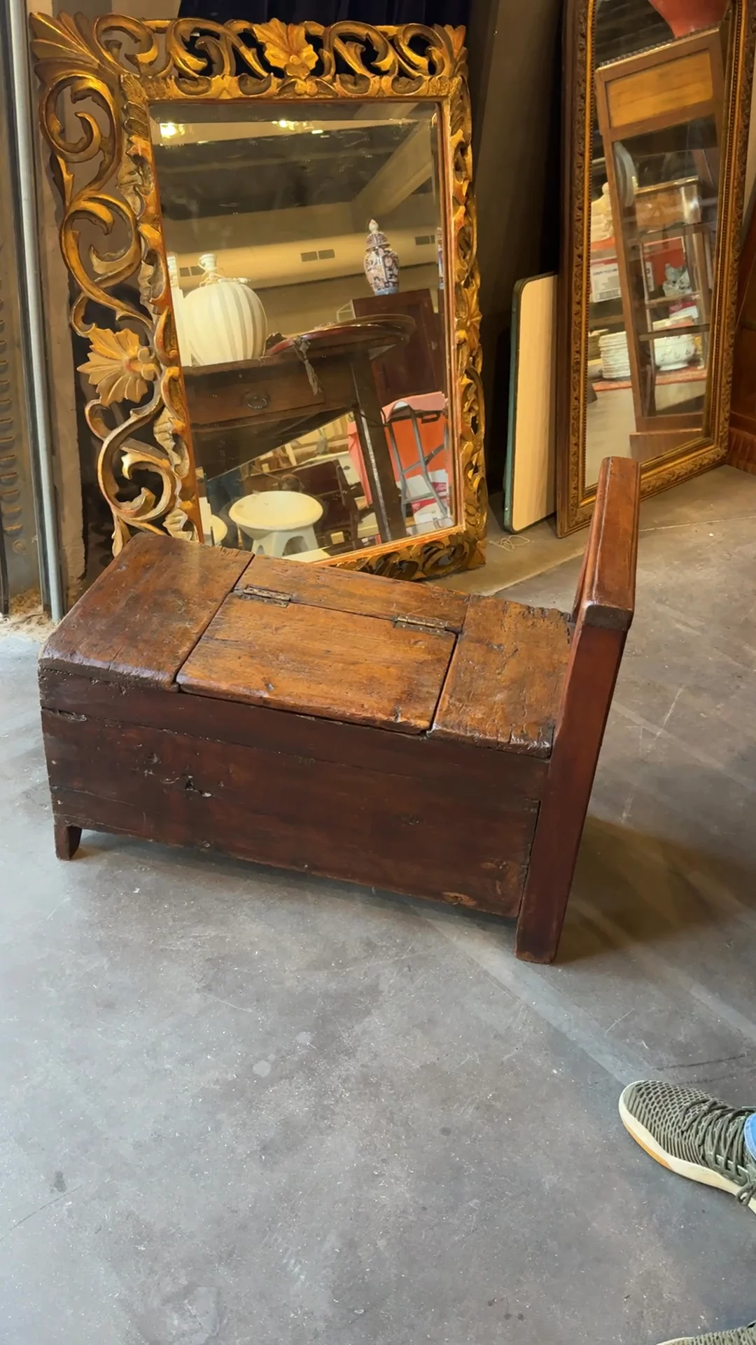 Discovered in Avignon, this rare shoe polisher’s bench is built from solid wood with a tall back and a lift-top seat set on its original metal hinges. Inside is a deep compartment that once held brushes, tins, and polishing cloths. It would have lived in an entry or workshop, ready for the daily routine of shining boots before leaving the house. Today it works naturally as a hallway bench with hidden storage.