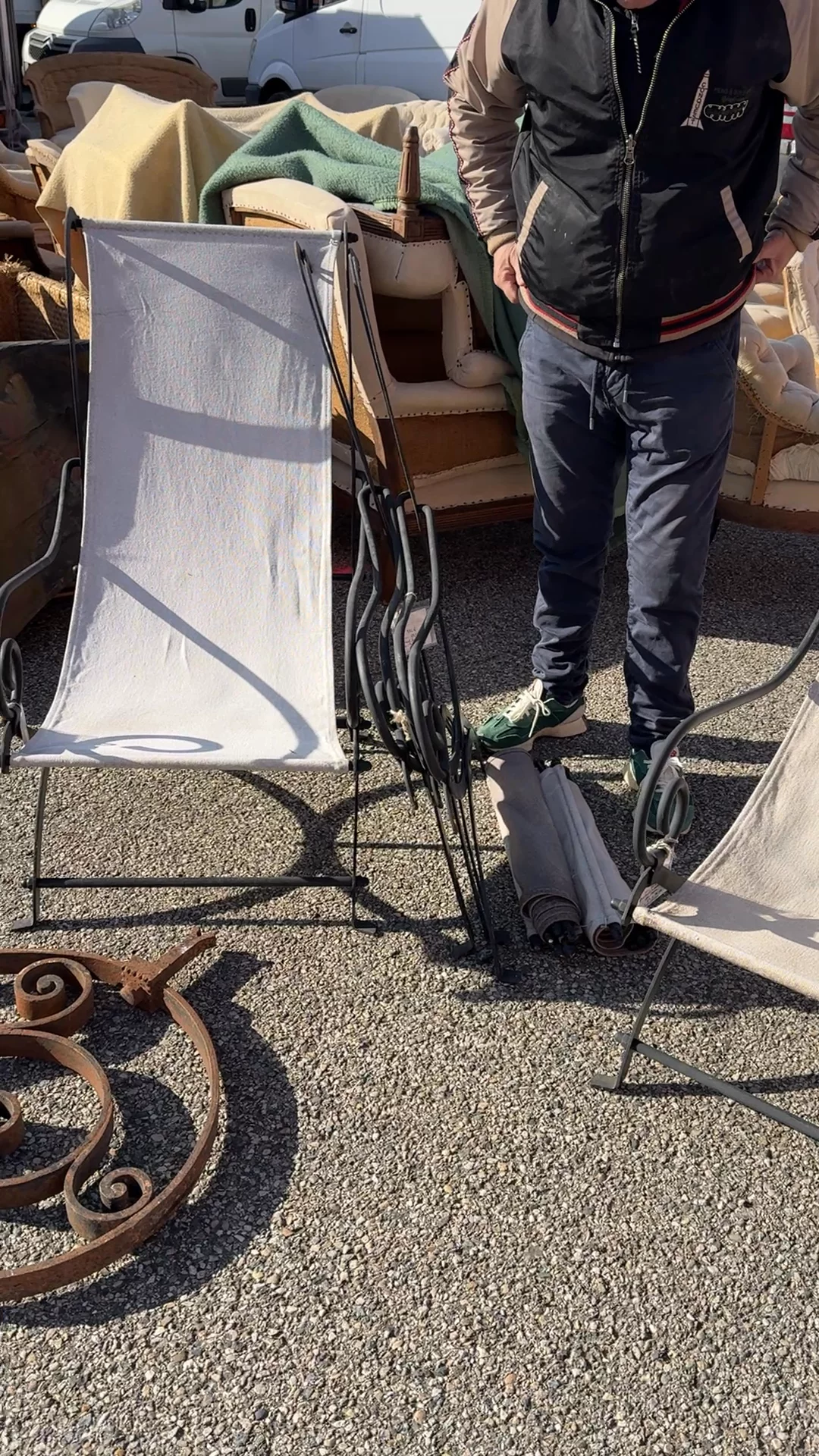 This is how the French do lounging. A vintage wrought iron garden chair with a sling seat in cotton canvas, designed to recline just enough to keep you there longer than planned. Pieces like this were made for terraces and shaded gardens, where afternoons stretched out and comfort mattered as much as form. The frame has that classic scrollwork we love, sturdy while the seat is surprisingly relaxed and easy. We have four available, sold individually. Sylvie would pull one onto a patio or tuck it into a sunny corner with a book and a drink that doesn’t require getting back up anytime soon.