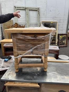 A charming French nightstand with a bit of contrast built right in. The lighter wood frame is paired with darker paneled drawers, creating a two-tone look that highlights the carved details on the fronts. Simple metal pulls add a sturdy, practical touch, while the turned legs and stretcher base give the piece that classic provincial feel. Sylvie loves it beside a bed or couch with a stack of books and a small lamp.