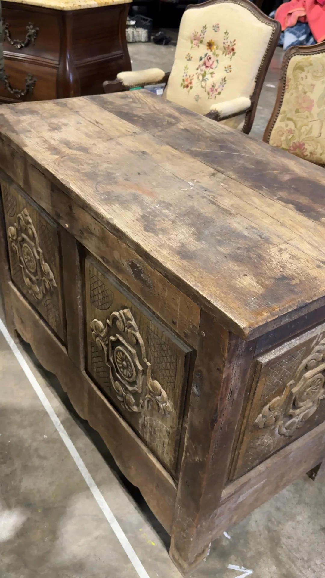 Those carvings are doing all the talking. This 19th century walnut chest features beautifully hand carved front panels with bold floral medallions and geometric details, a style often seen on provincial French storage chests that held household linens, clothing, and valuables before closets became common. The finish has worn off this piece and it has areas of dark staining and pitting from years of use, giving the surface the kind of texture only history can produce. The thick top still opens like a traditional trunk, revealing generous interior storage, while the sturdy frame reflects the practical construction of furniture built to last generations. Sylvie loves it as a sideboard or entry piece where the carved fronts instantly draw the eye.