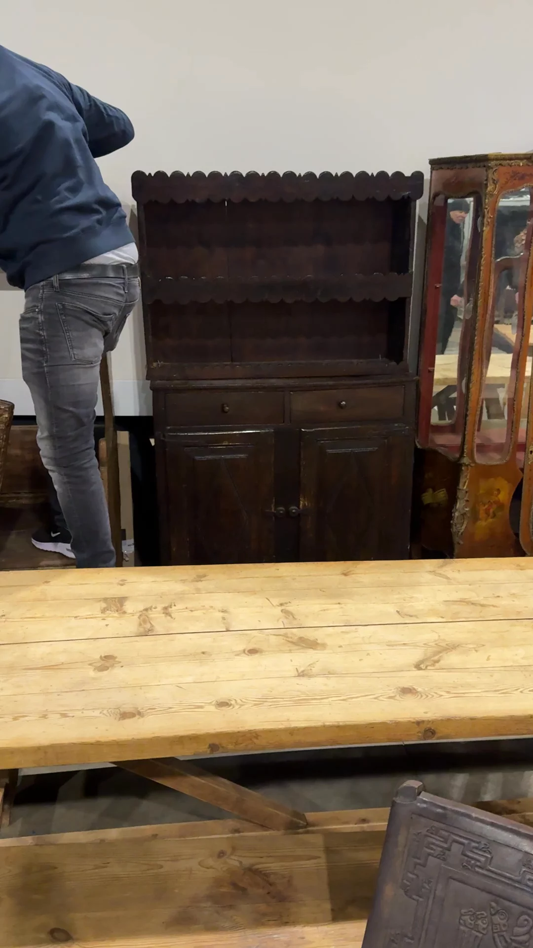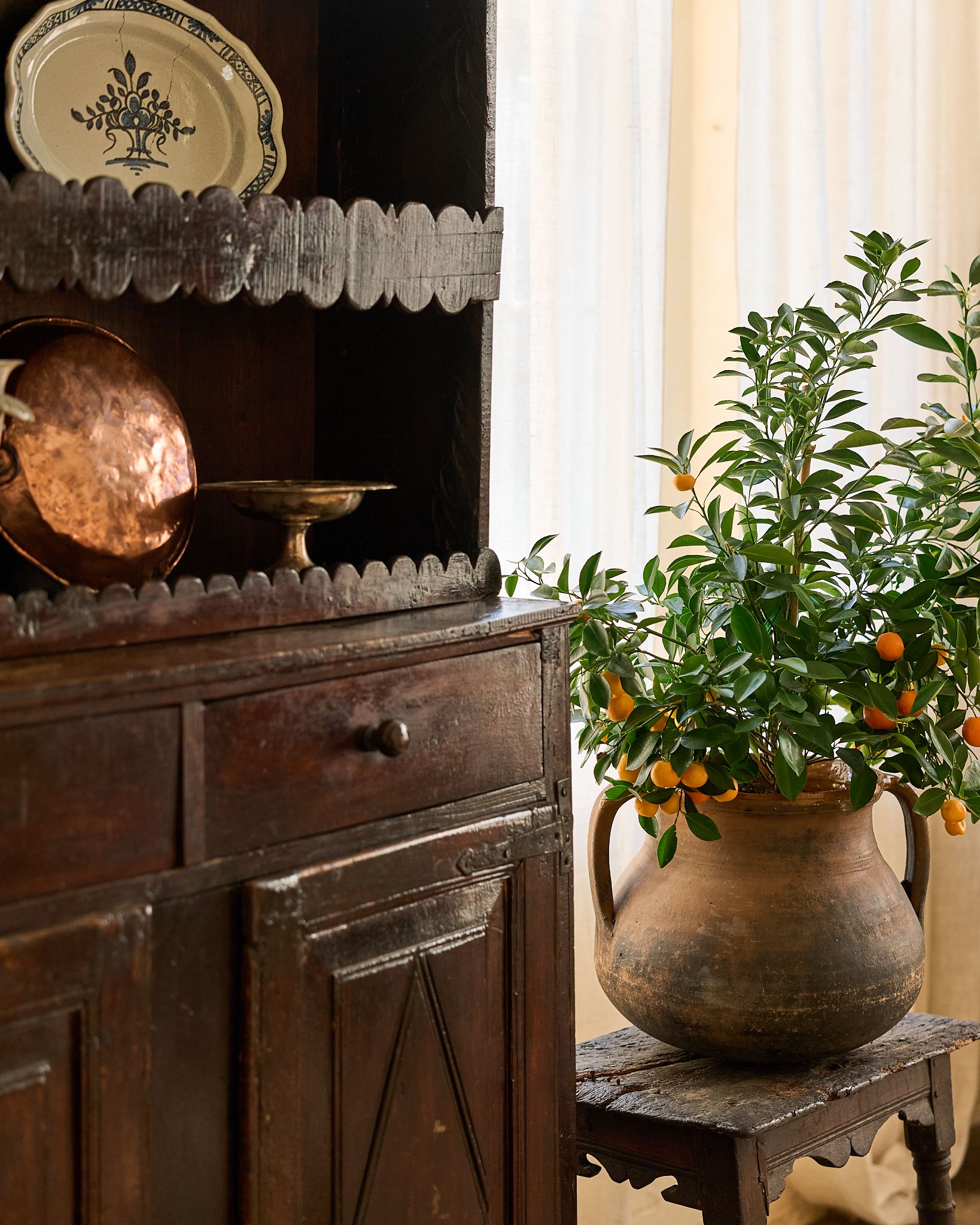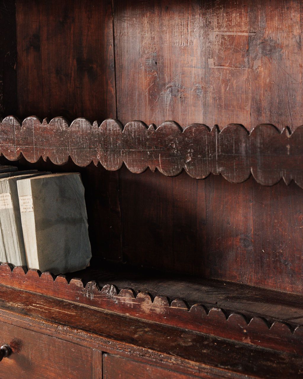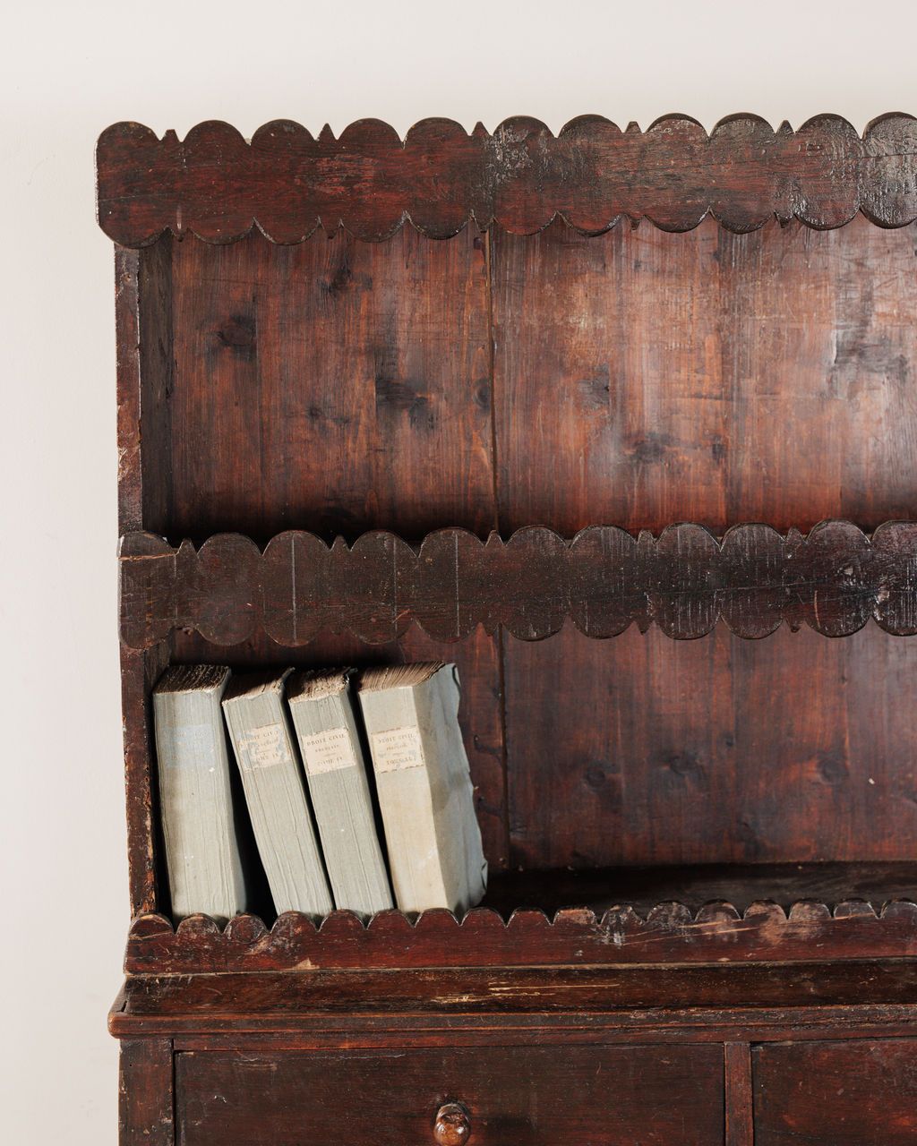 Found in Montpellier and originally from Catalonia, this 18th-century armari de cuina amb prestatges was built for a working kitchen at the center of the home. The lower cupboard kept staple goods and linens protected, the drawers held smaller tools, and the open shelves above stayed in daily rotation with ceramics and tableware. It’s solid wood with pegged joinery and hand-forged hardware, the darker tone built up over time from use and proximity to a fire. The diamond panels and scalloped edges are classic Catalan details, simple and repeated. Sylvie keeps it filled with stacked plates, jars, and folded linens, everything close at hand for whatever is cooking.