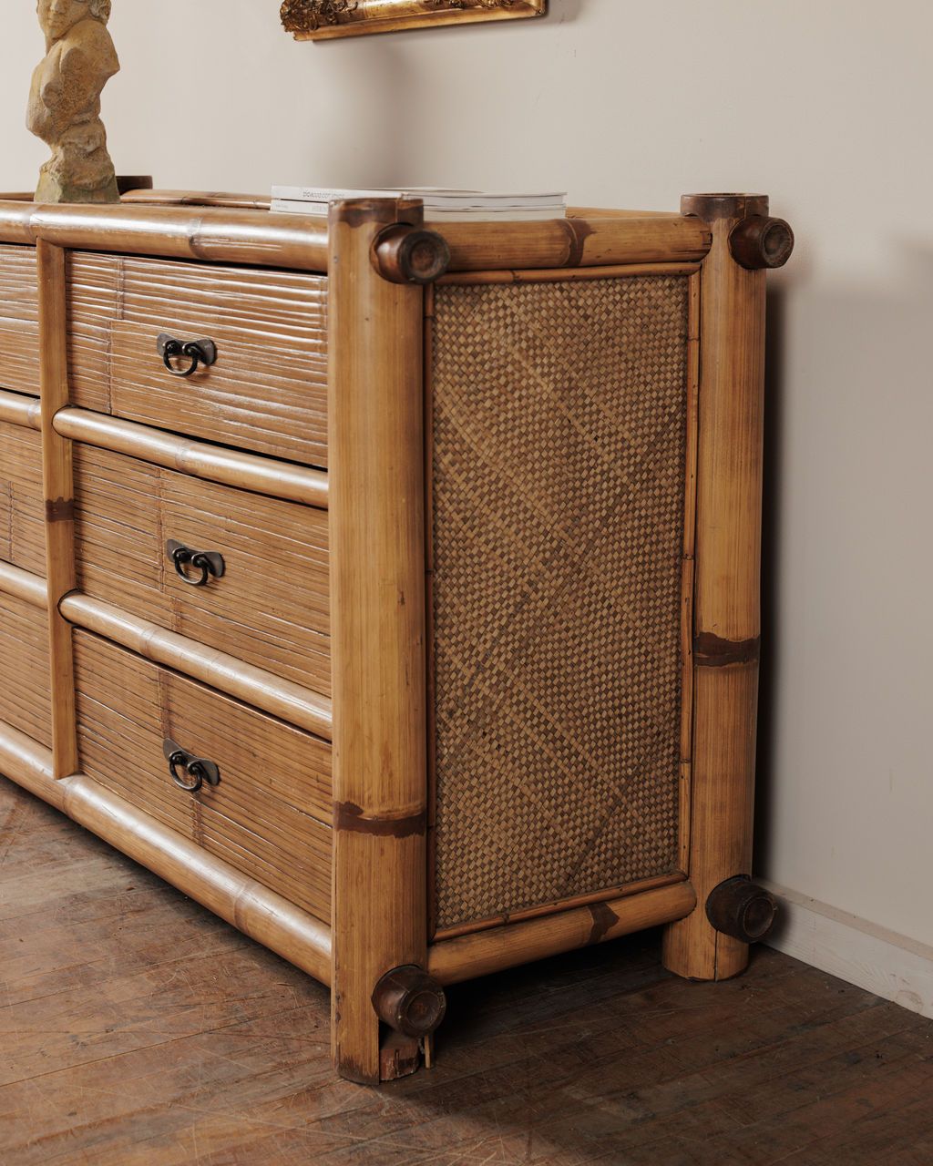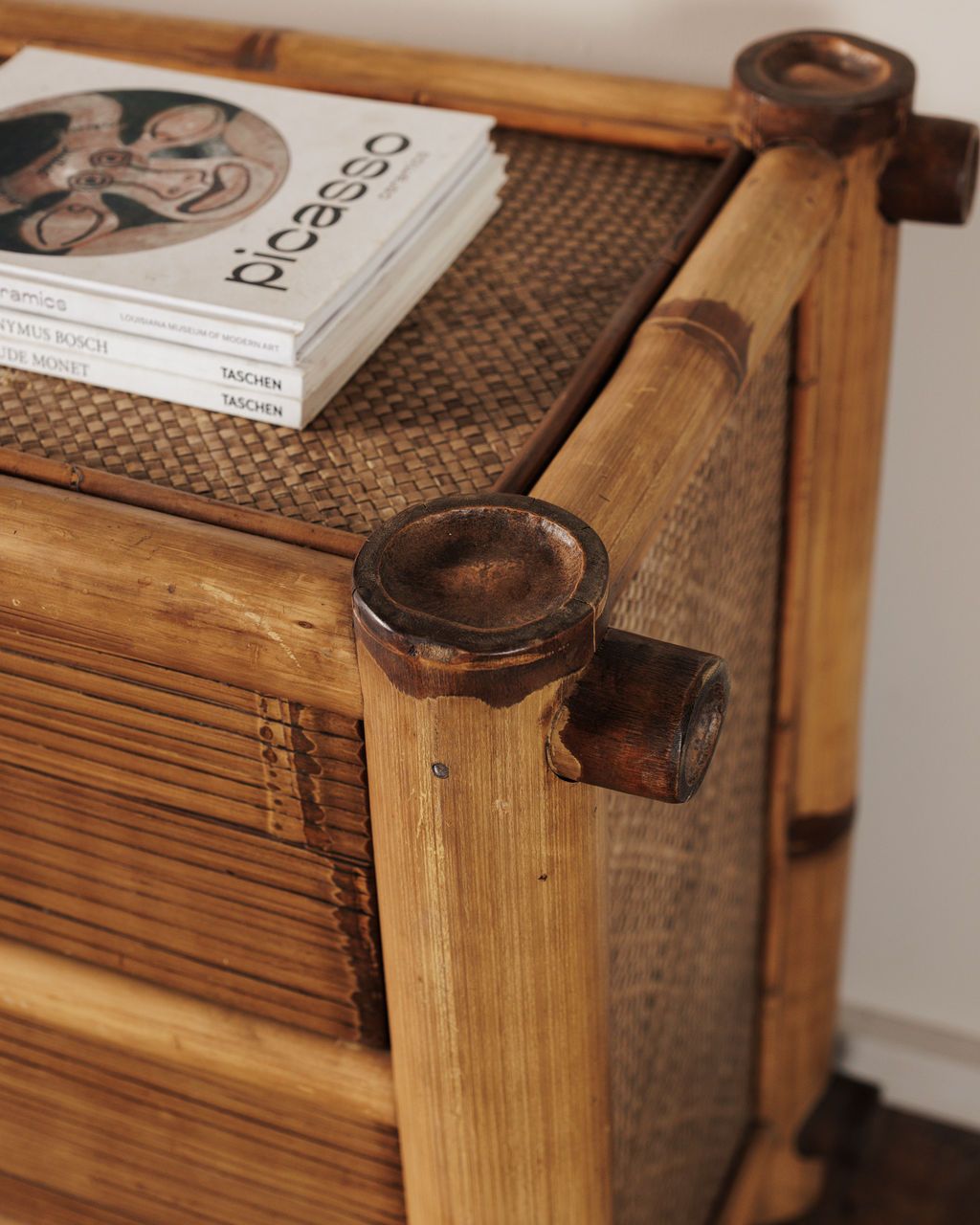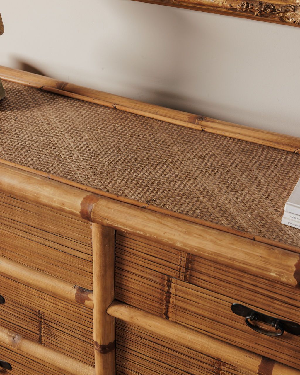 There’s something a little Riviera about this one. Found in Montpellier, it’s built from bamboo with woven panels across the top and sides, part of a mid-century shift when French interiors started leaning into lighter, more relaxed materials. Makers pulled from colonial trade routes and travel influence, bringing rattan and bamboo into everyday spaces as a counterpoint to heavier wood furniture. The frame is formed from thick bamboo poles with visible nodes, while the drawers are lined in narrow slats and finished with simple dark metal pulls. It’s structured, but still easy. Sylvie sees it in a sunlit room with open windows, holding a stack of books and a glass of water within reach.