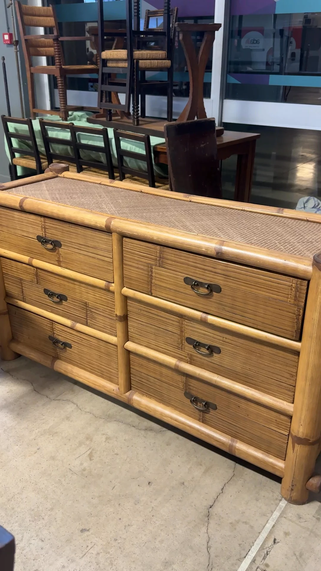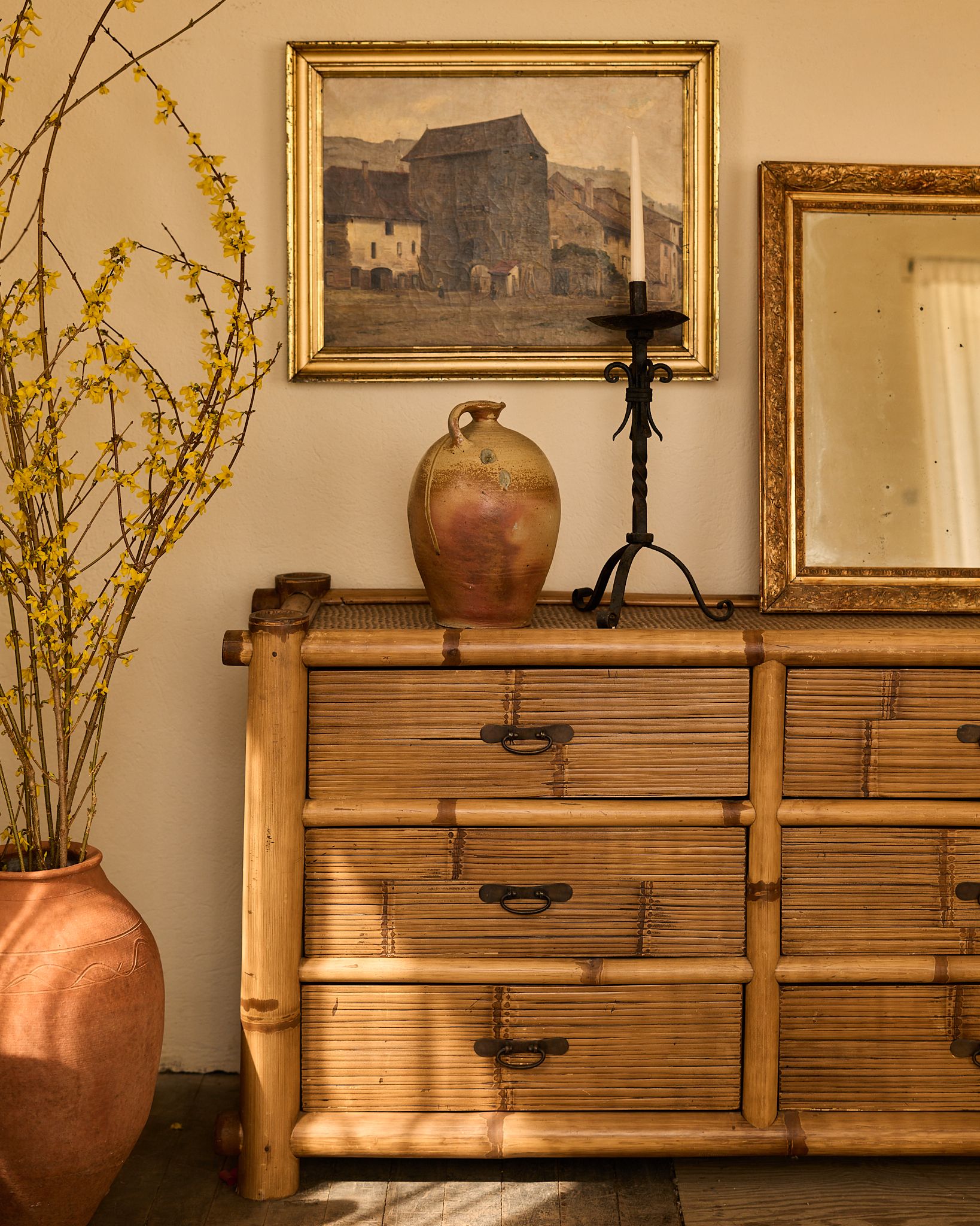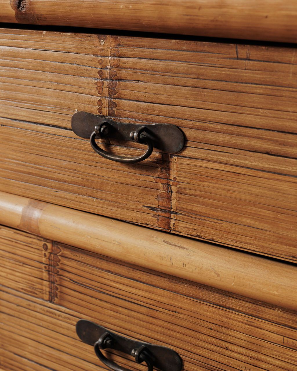There’s something a little Riviera about this one. Found in Montpellier, it’s built from bamboo with woven panels across the top and sides, part of a mid-century shift when French interiors started leaning into lighter, more relaxed materials. Makers pulled from colonial trade routes and travel influence, bringing rattan and bamboo into everyday spaces as a counterpoint to heavier wood furniture. The frame is formed from thick bamboo poles with visible nodes, while the drawers are lined in narrow slats and finished with simple dark metal pulls. It’s structured, but still easy. Sylvie sees it in a sunlit room with open windows, holding a stack of books and a glass of water within reach.