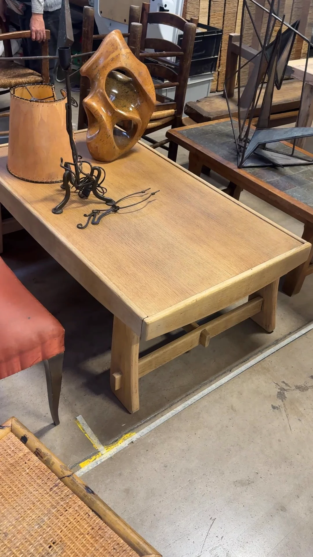 This 1960s oak coffee table was found in Montpellier and has that grounded, low profile common to midcentury French interiors. The wide plank top sits on thick cut legs with a simple stretcher beneath, built solid and close to the floor so people gathered around it rather than perched at a distance. Sylvie loves it as an anchor for a living space layered with books, ceramics, and an evening glass of wine.