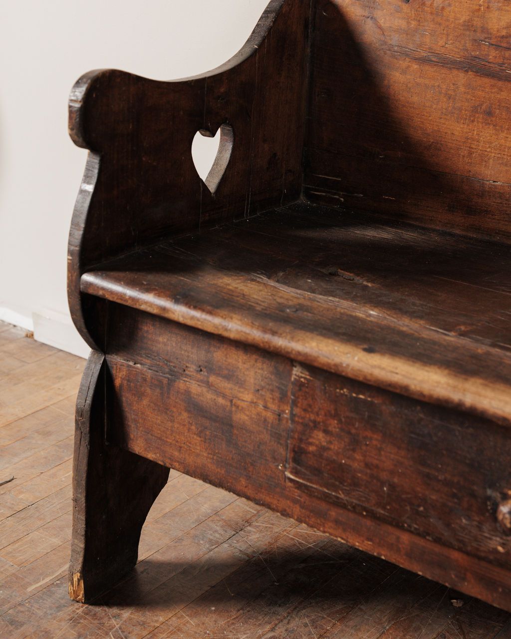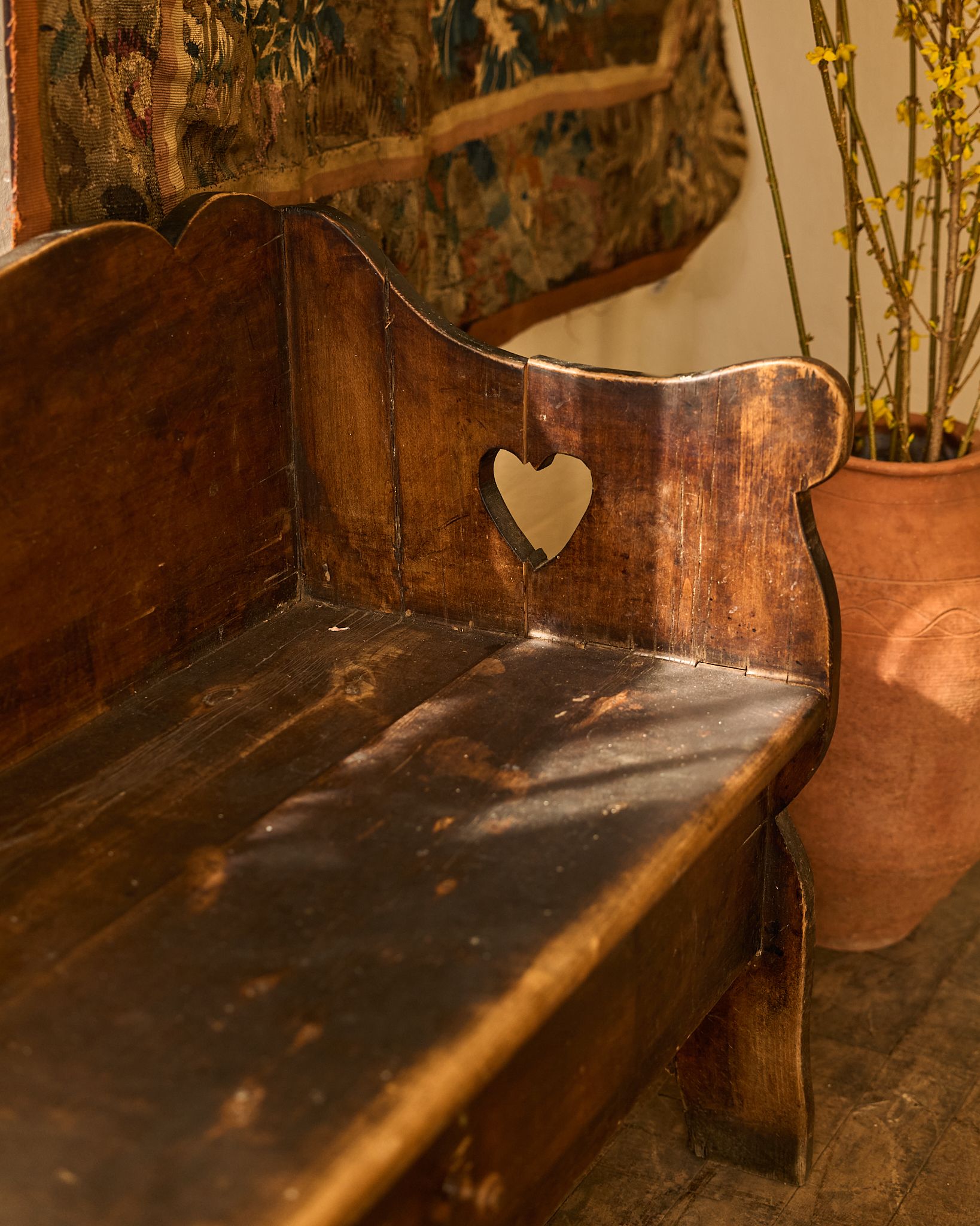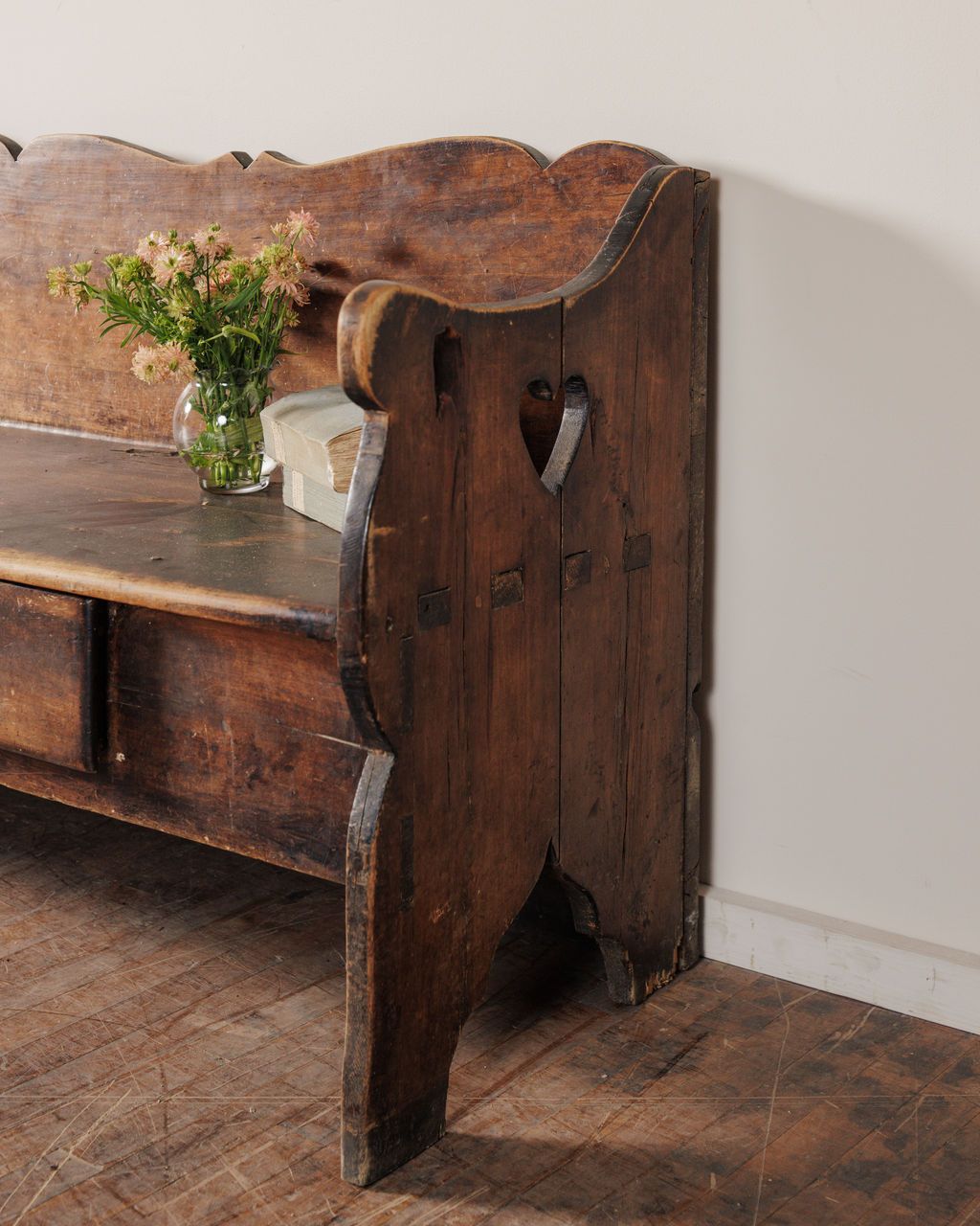 This one came out of a small Alpine church, where everything was built by hand and meant to last. Found in Avignon and dating to the 19th century, it would have sat along the nave, holding the same families week after week. The form is simple but not plain - the scalloped back, the cut-out sides, small details that soften what is otherwise a very grounded piece. Built from solid wood and used constantly, the wear sits exactly where it should. Sylvie places it along a wall or at the foot of a bed, where it still feels quietly anchored.
