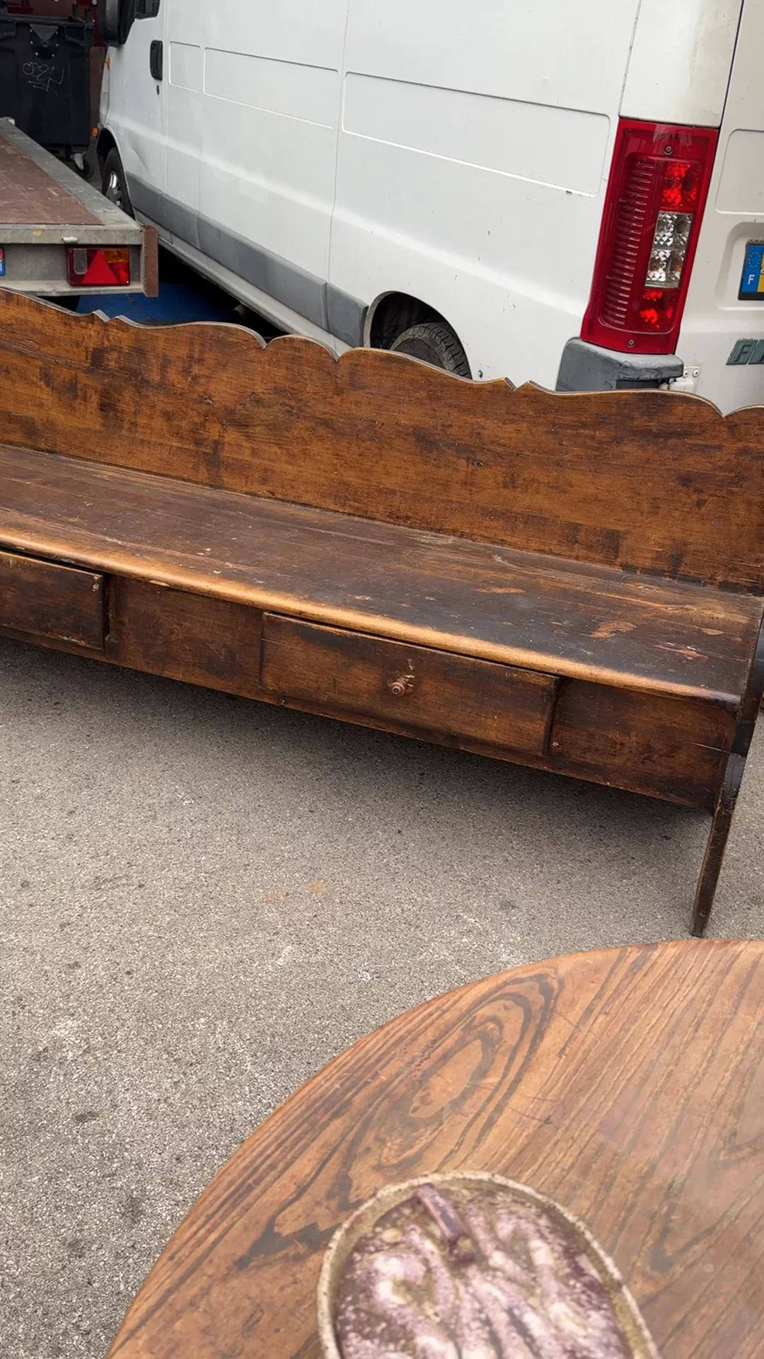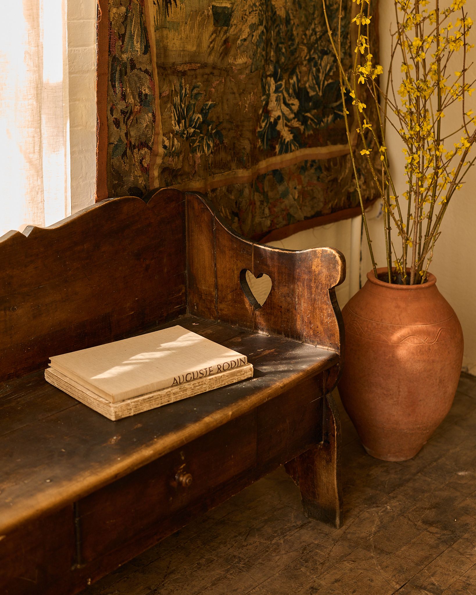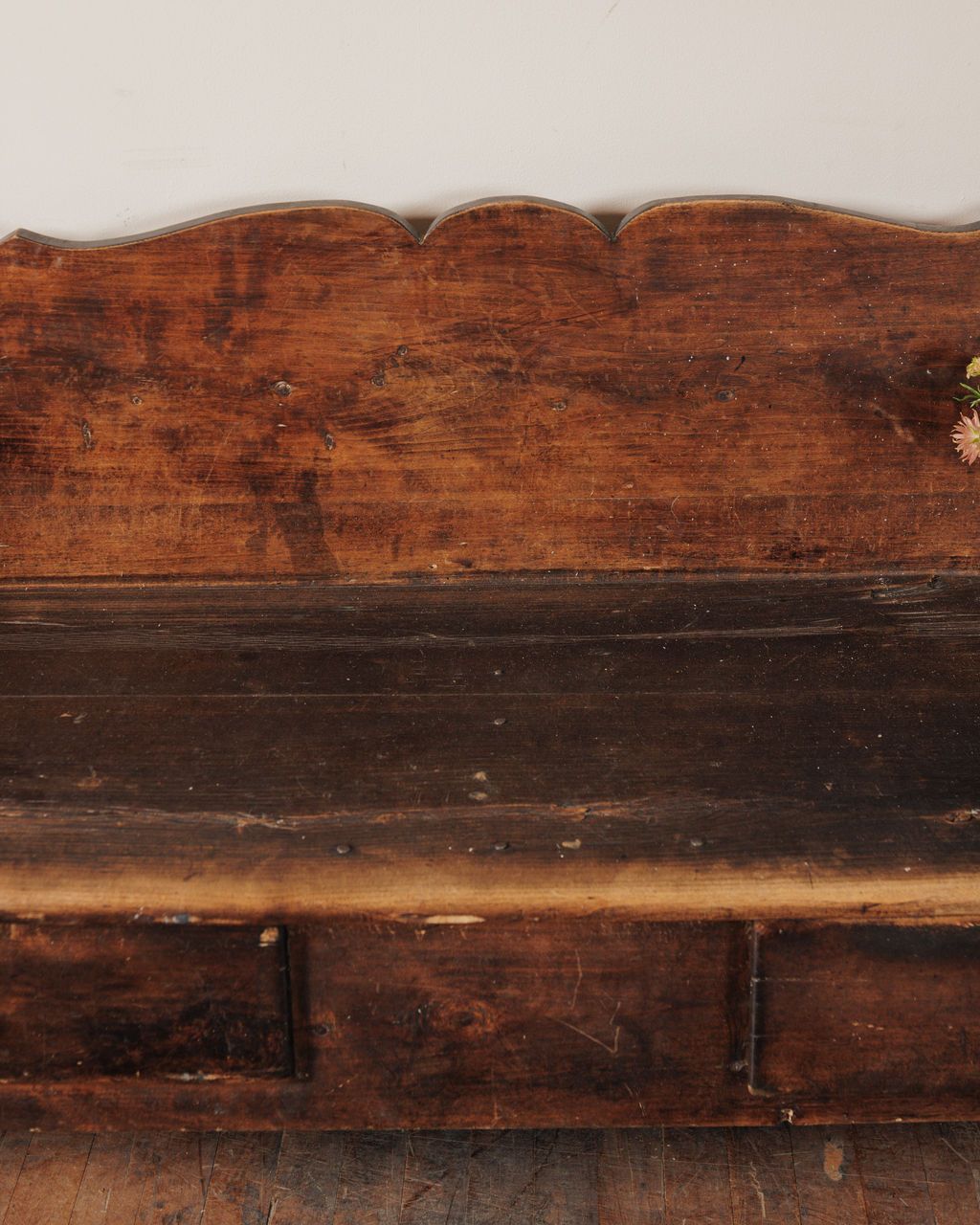 This one came out of a small Alpine church, where everything was built by hand and meant to last. Found in Avignon and dating to the 19th century, it would have sat along the nave, holding the same families week after week. The form is simple but not plain - the scalloped back, the cut-out sides, small details that soften what is otherwise a very grounded piece. Built from solid wood and used constantly, the wear sits exactly where it should. Sylvie places it along a wall or at the foot of a bed, where it still feels quietly anchored.