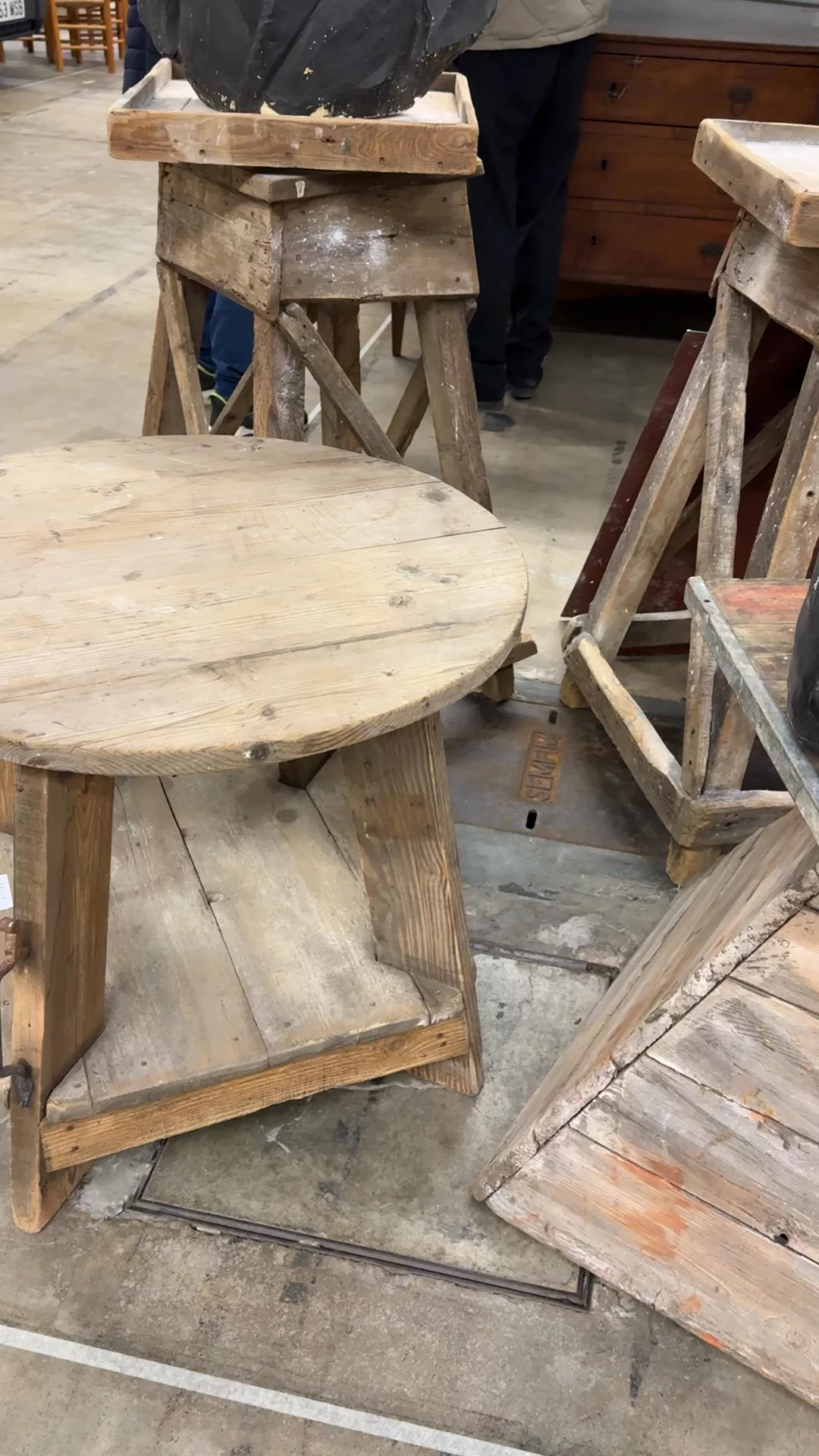 A working table straight from an artist studio. This Italian sculptor’s table is built from raw pine that has naturally greyed with age, its sturdy, utilitarian construction made to support heavy work in progress. Tables like this were often used in sculptors’ studios as pedestals for clay or plaster models, giving the artist a stable surface to walk around while shaping a piece from every angle. The round top lifts off and reattaches using slots cut into the base for easy transport or adjustment, and the metal hardware on the leg hints at the practical modifications common in workshop furniture. Sylvie loves it as a sculptural side table where its honest construction and studio history become part of the room.