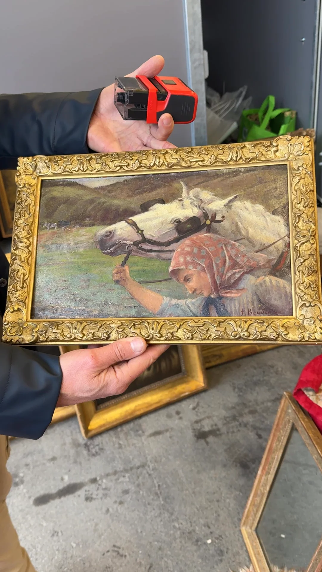 This is the kind of painting that feels pulled straight from the countryside it came out of. Found just outside of Lyon and dating to the 19th century, it shows a woman leading a single draft horse across open land, caught mid-step rather than posed. Scenes like this became more common in French painting in the mid to late 1800s, when artists began turning their focus toward rural life and the people working it, rather than historical or mythological subjects. The palette leans into soft greens and earth tones, with warmer color held in the foreground and the frame is deeply carved and gilded, likely added to elevate what was originally a more regional work, something that would have felt familiar to the home it hung in. Sylvie hangs this above a console and pairs it with something simple below, a bowl, a stack of books, nothing that competes, so the scene holds your attention.