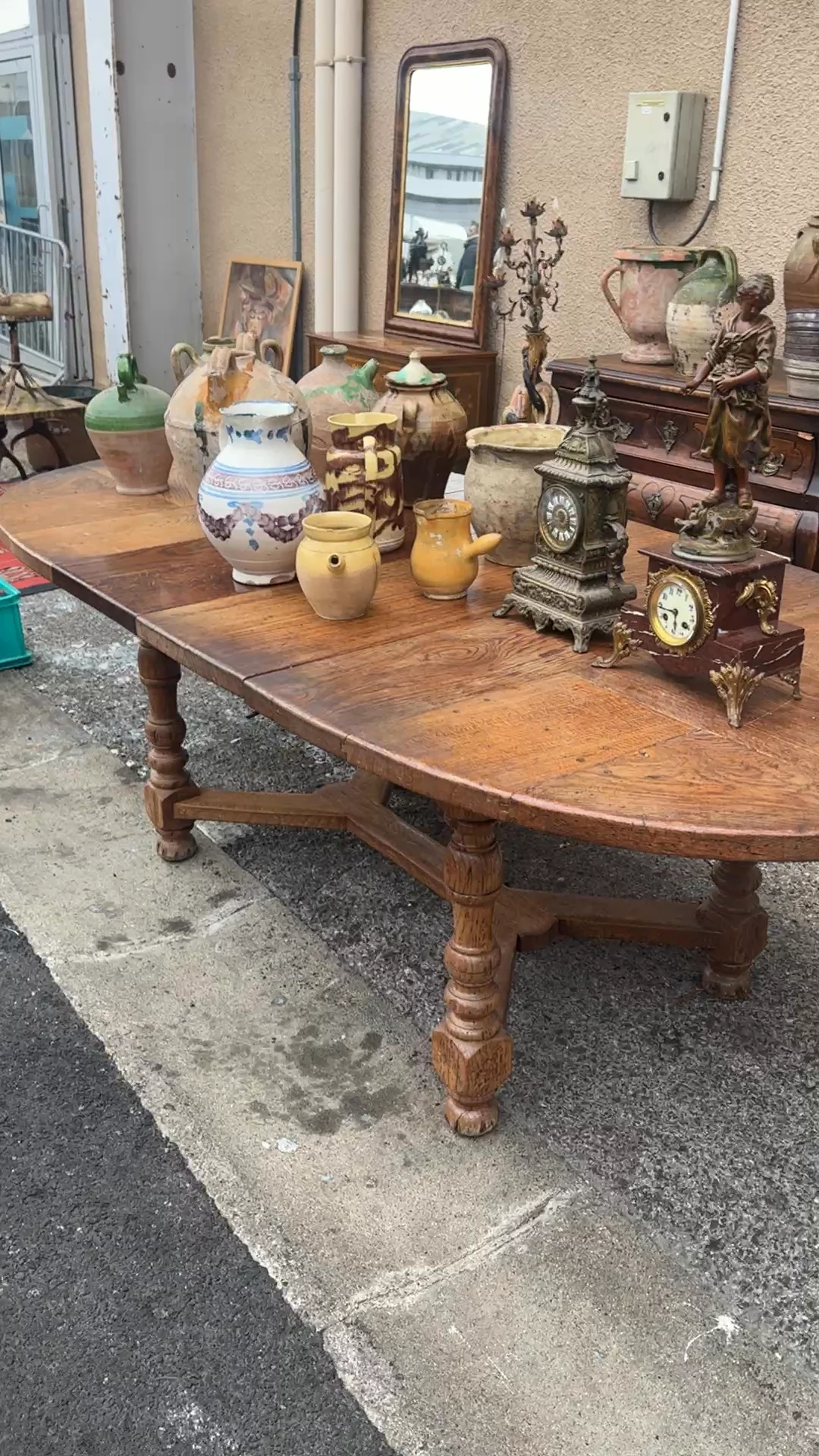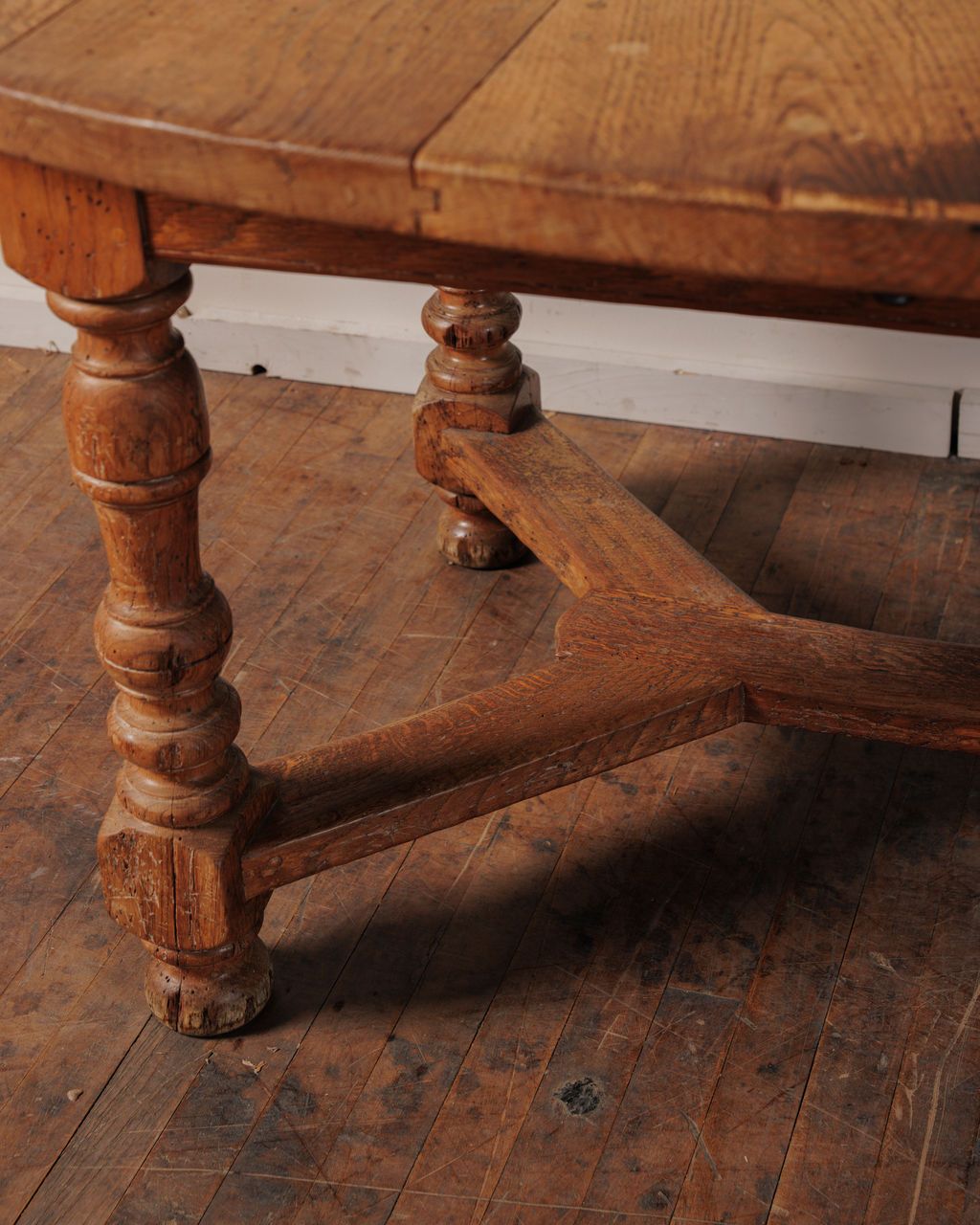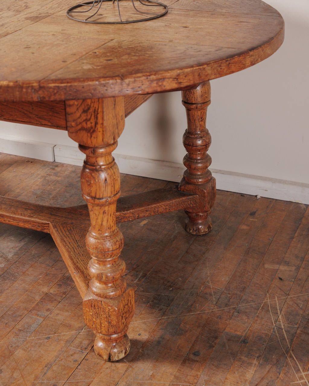 Sunday roasts, extra chairs pulled in, one more place set at the last minute. This 19th century oval dining table extends with two leaves, transforming from a generous round into a long, elegant oval built for a crowd. The leaves, having been used less frequently over the years, sit slightly darker than the central top, a subtle record of how the table evolved with its family. Crafted in solid wood with turned legs and a cross stretcher base, it is both sculptural and deeply practical, sturdy enough for daily life and special occasions alike. Originally made to adapt to gatherings of varying size, it still does exactly that, ready to expand whenever the guest list grows.