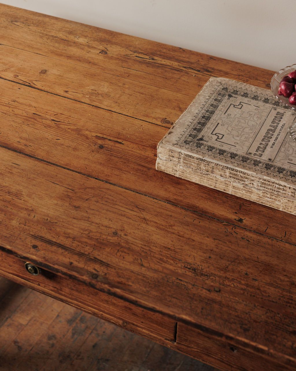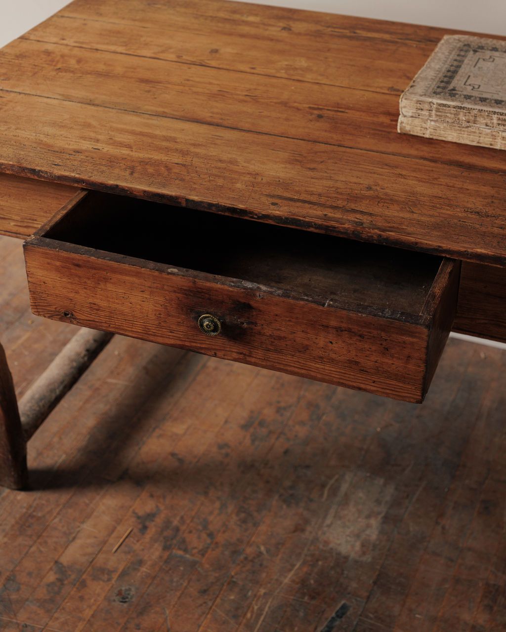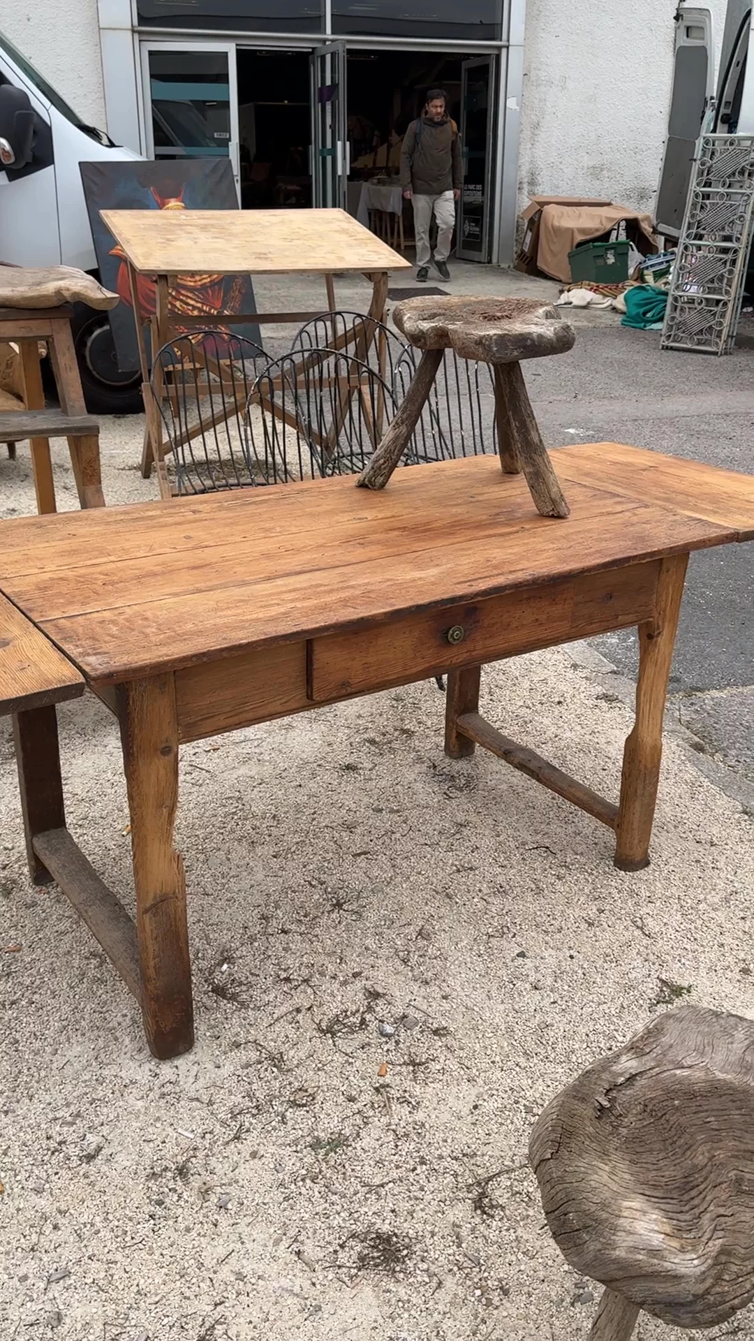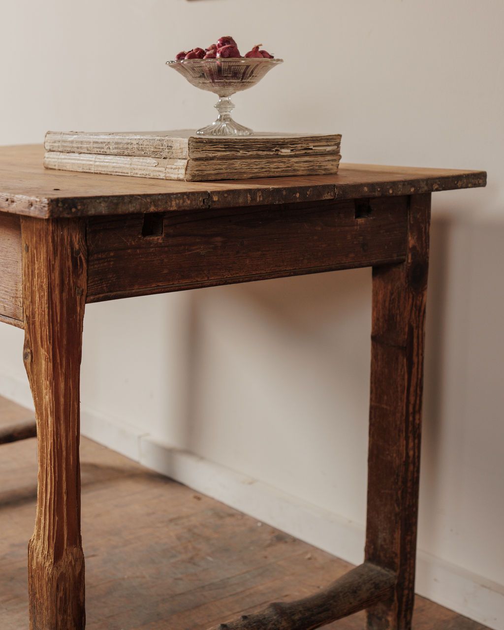 There’s no hiding what this table has been through, and that’s exactly the point. Found in Montpellier and originally from Catalonia, this kitchen table was built to be extended, worked on, and used hard, its two removable leaves pulled in and out depending on how many people it needed to hold. The top carries the marks of that rhythm, shifting, expanding, closing again, while the base tells a quieter, more physical story. The legs are worn down low and uneven, not from time alone but from years of contact, feet, movement, and the constant push and pull of daily life around it. The stretcher sits low, smoothed by use rather than design, holding everything together as it always has. Sylvie loves it opened up and in use again, holding a full table the way it was built to, with nothing about it feeling precious or still.