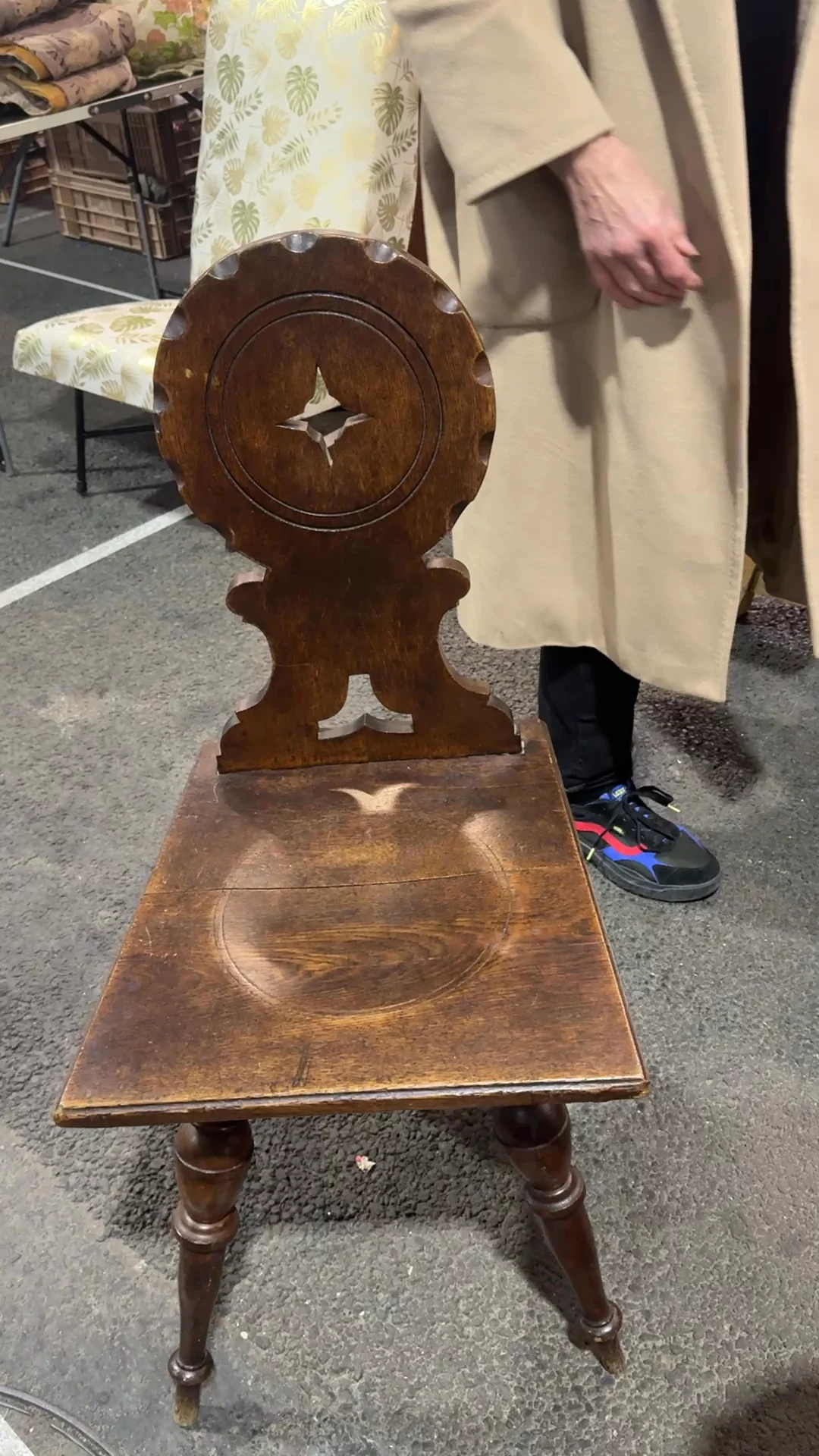 This is the kind of chair you spot from across the room and immediately start rearranging things for. Found in Alsace and dating to the 19th century, it’s carved from dark-stained hardwood with a bold circular backrest, centered by a star cut-out and ringed with simple geometric detailing. It comes out of a regional tradition where everyday furniture carried a strong point of view, shaped through carving and silhouette rather than excess. Originally made for the table, but Sylvie pulls it slightly off the wall or pairs it with a small piece so it can fully hold its own.