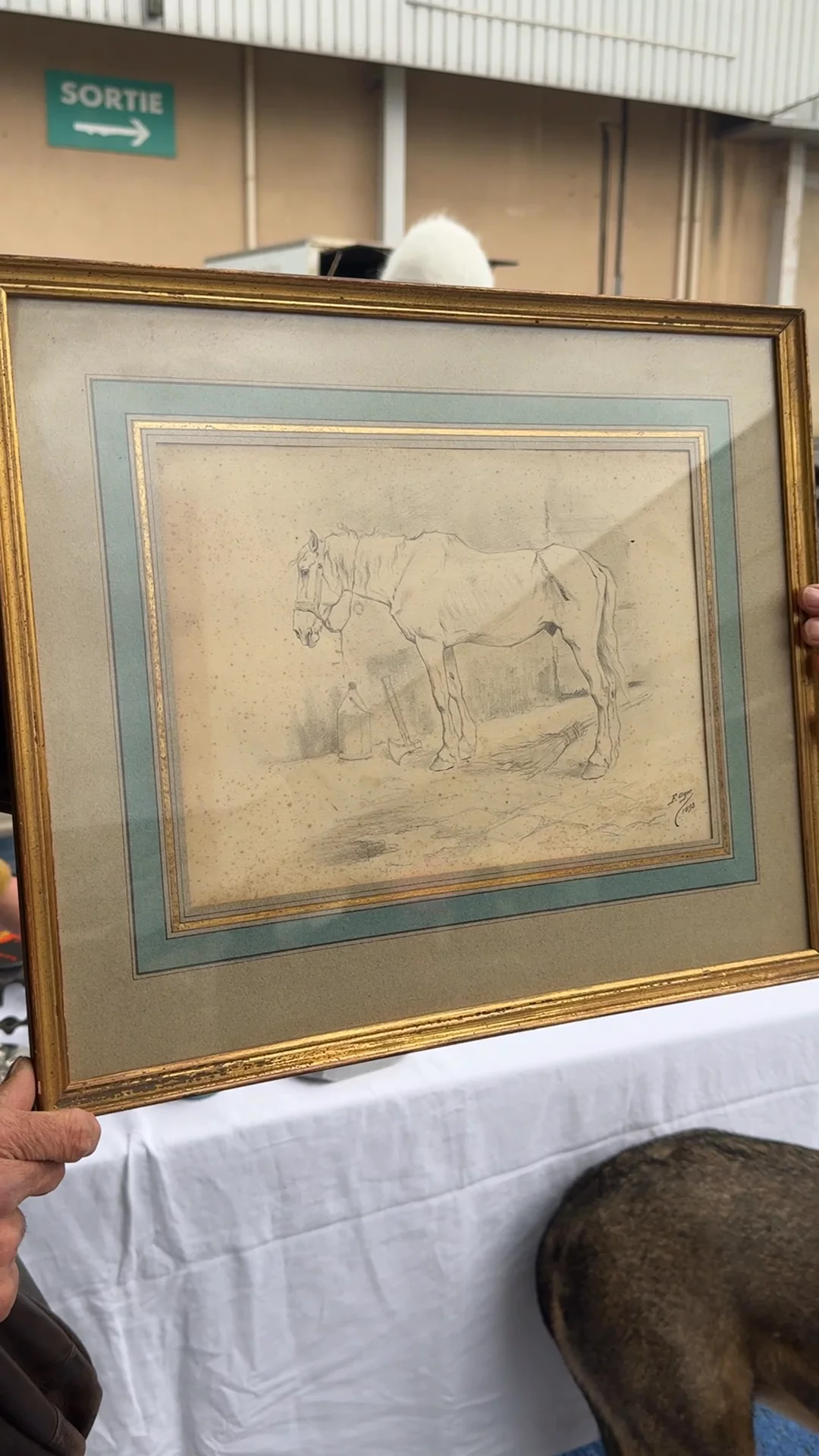A quiet study of a working horse. This 19th century pencil drawing captures a horse standing at rest, with simple farm tools nearby, a jug, an axe, and a broom sketched lightly in the background. The delicate line work and observational style give the piece the feeling of a quick study made in the field. Set behind glass with a gilt frame and soft blue matting that highlights the paper beautifully. Sylvie loves it layered among other artwork or hung where that gentle, understated scene can be appreciated up close.