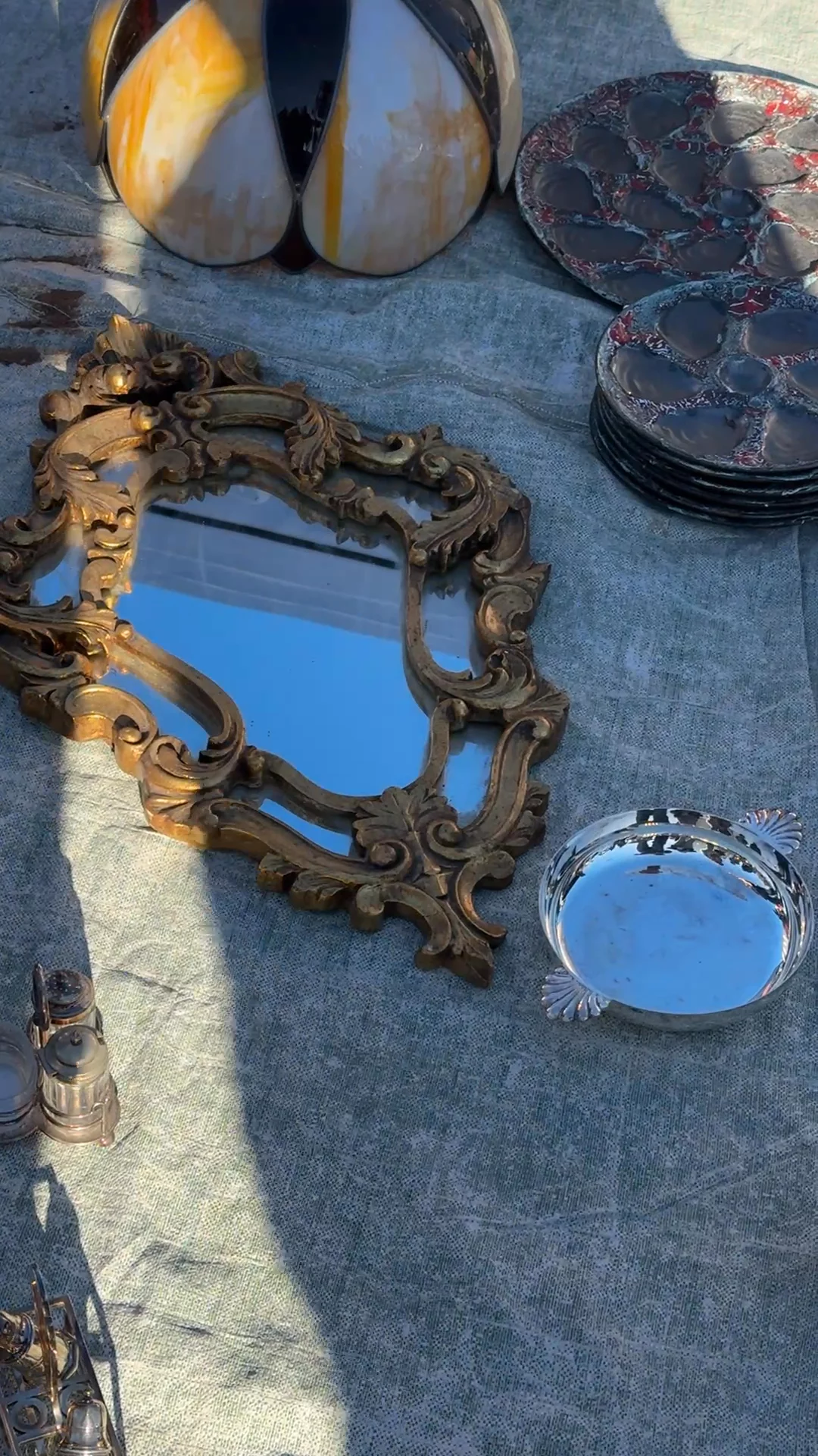 This beautiful gilt mirror was found in Carpentras and dates to the early 20th century. Its form draws directly from earlier Louis XV–inspired designs, with exaggerated scrolls, acanthus leaves, and that open, almost fluid silhouette that feels more carved than constructed. The frame is wood with a gilt finish, shaped in deep relief so the curves catch light from every angle, while the inner mirror sits slightly recessed, giving the whole piece a sense of depth. Sylvie loves it above a bed, where it catches the morning sunshine.