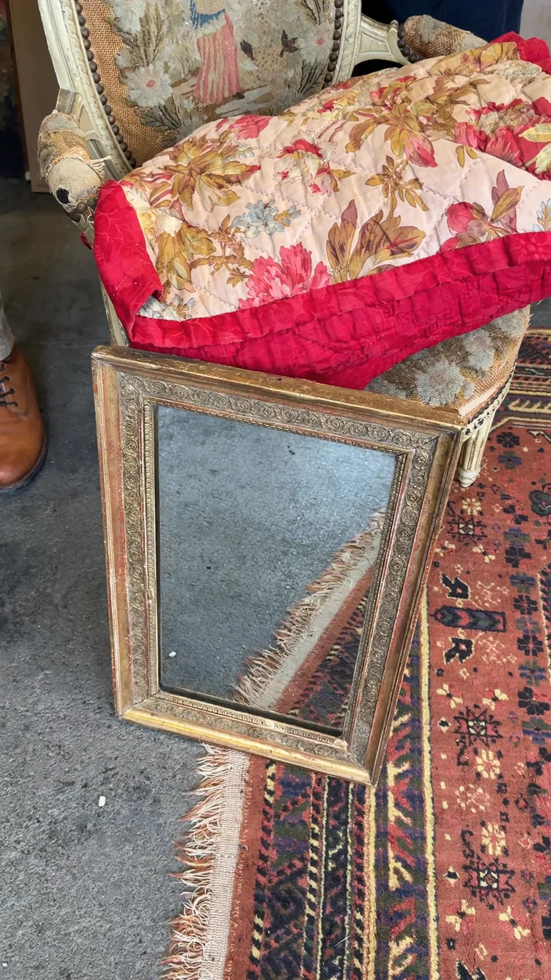 From Montpellier and dating to the 19th century, this gilt mirror was finished using traditional water gilding - gold leaf laid over a base of red bole clay, which gives the surface its warmth and depth. Where the gold has thinned over time, that red begins to show through, a detail tied directly to the original process. The frame is built with a tight band of rosettes and fine beading along the inner edge, set within a broader outer moulding that keeps the proportions clean and structured. Sylvie leans it on a mantel or sets it just above a console, where the gold catches light and shifts throughout the day.