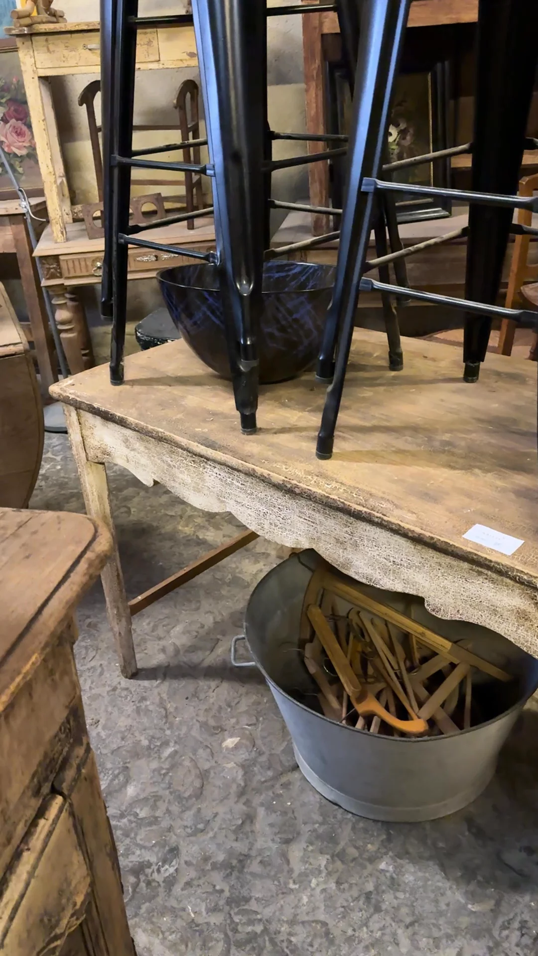 Found in Avignon and dating to the early 20th century, this French desk would have been used for everyday writing - letters, accounts, whatever needed to be put down at the end of the day. The frame is simple and narrow, with a single drawer and a scalloped apron running along the front. The paint has worn back heavily, leaving that soft, crackled surface across the legs and apron, while the top shows the marks of constant use. Sylvie loves it used as it was meant to be - papers spread out, a stack of books off to one side, something half written and left there until you come back to it.