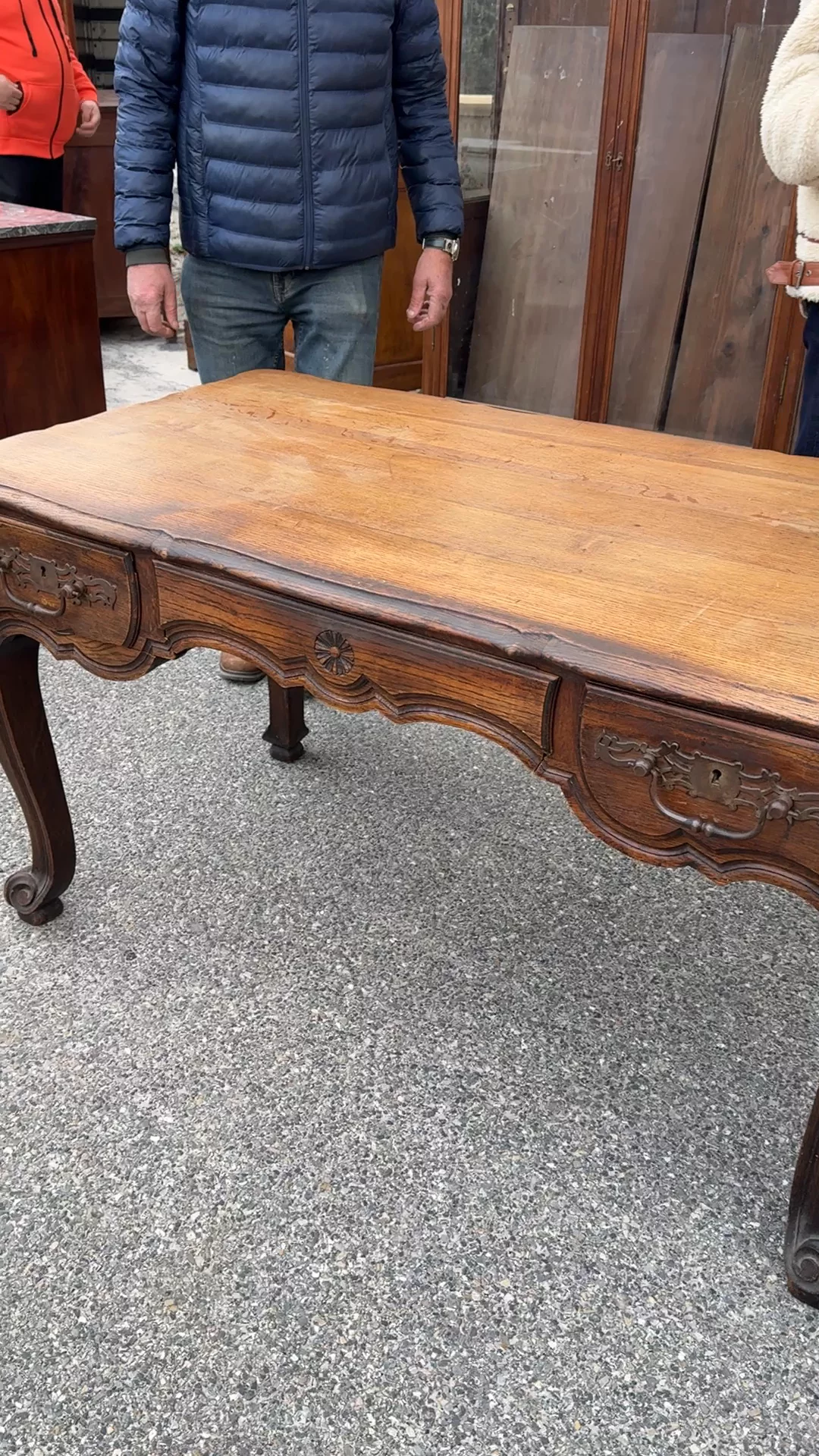 Found in Avignon and originally from Lyon, this 19th century cabriole desk traces back to the long influence of Louis XV furniture, where curved legs and shaped fronts moved pieces like this out of formal salons and into everyday rooms - used for writing letters, keeping household papers, and sitting down at the end of the day. By the early 1900s, workshops in regions like Lyon were still producing these forms, but in simpler versions meant for daily life rather than ornament. The legs hold that classic cabriole line, with a shaped apron and carved detailing across the front, and drawer fronts worn from years of opening and closing. Sylvie loves it in an entry or small room, where it actually gets used - mail stacking up, a book left open, something always set down and not quite put away.