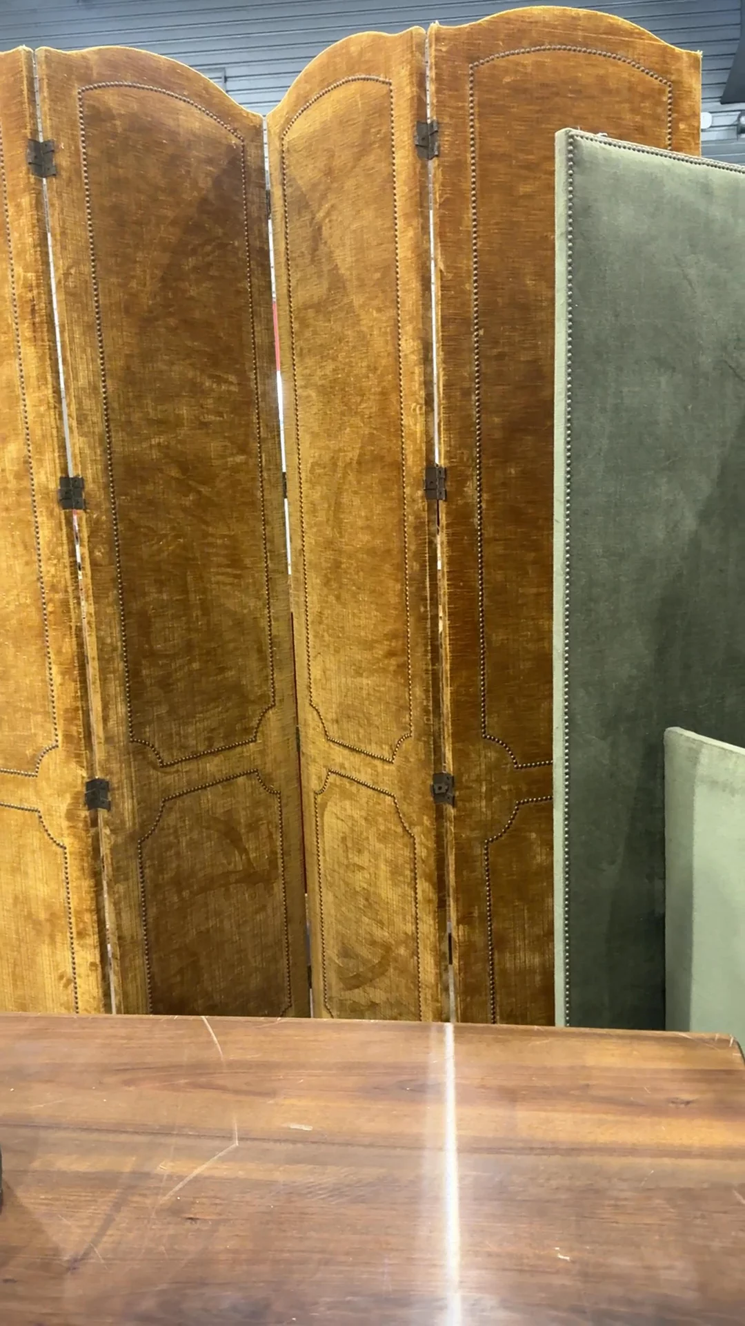 This is one Sylvie always keeps an eye out for. Found in Montpellier and dating to the early 20th century, this folding screen would have originally been used to divide space - creating privacy in shared rooms or shielding heat from a fire. Upholstered in a rich green fabric with nailhead trim tracing each panel, it has that softly worn surface that catches light differently across each fold. Sylvie loves it as a headboard - set just behind the bed where it catches the morning light.