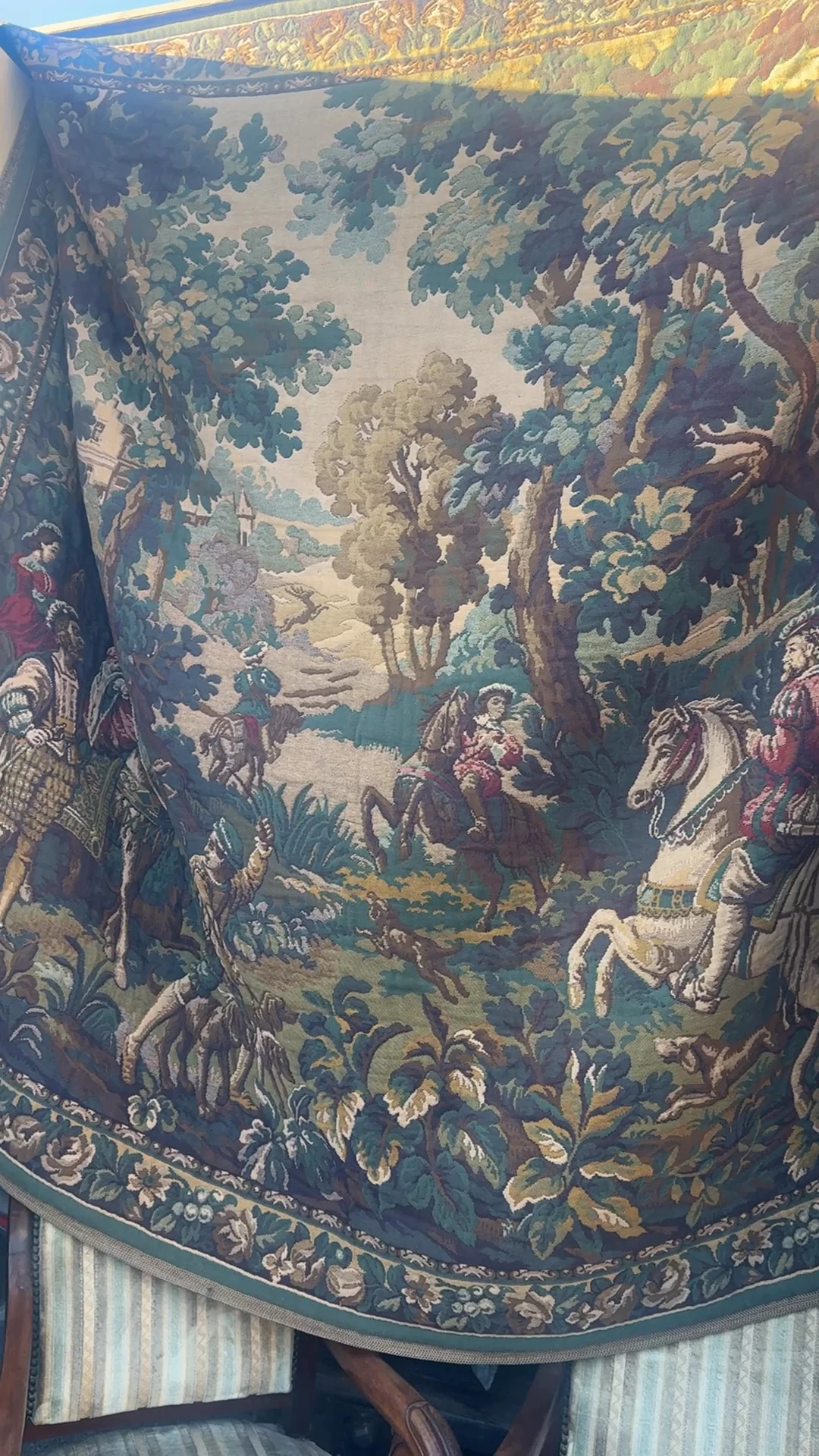 Found in Montpellier and originally from a bastide near Lyon, this early 20th century tapestry draws from much older French weaving traditions, where scenes like this - hunts, gardens, and long countryside rides were used to line walls and hold warmth in large stone rooms. Woven in heavy textile with a deep border framing the scene, it shows a layered landscape of trees, figures, and riders moving through it, all built up in rich greens, browns, and softened blues. Sylvie hangs it where it can take up real space and shine as the anchor to any room.