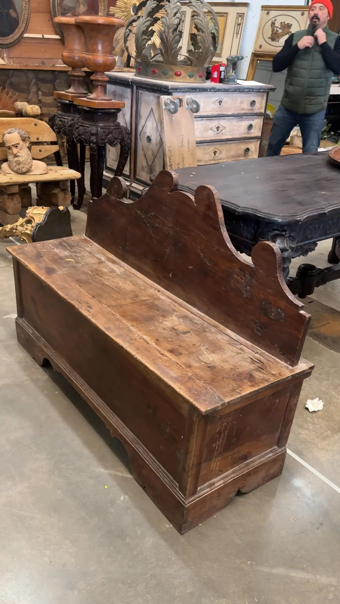 From Tuscany and dating to the 19th century, this chest bench was uncovered in Montpellier, originally serving as a church bench - built for stillness, repetition, and moments of quiet. Pieces like this were often placed along the walls of smaller chapels, offering both seating and hidden storage beneath for books, textiles, or parish essentials. The tall back is what defines it, with its hand-cut, scrolling crest that rises almost like a silhouette against the wall - simple, but intentional. The base is deep and solid, opening to a generous interior, while the wood has darkened over time, marked by wear that reflects its long life. Sylvie loves it in an entryway with a pair of shoes tucked just beneath.