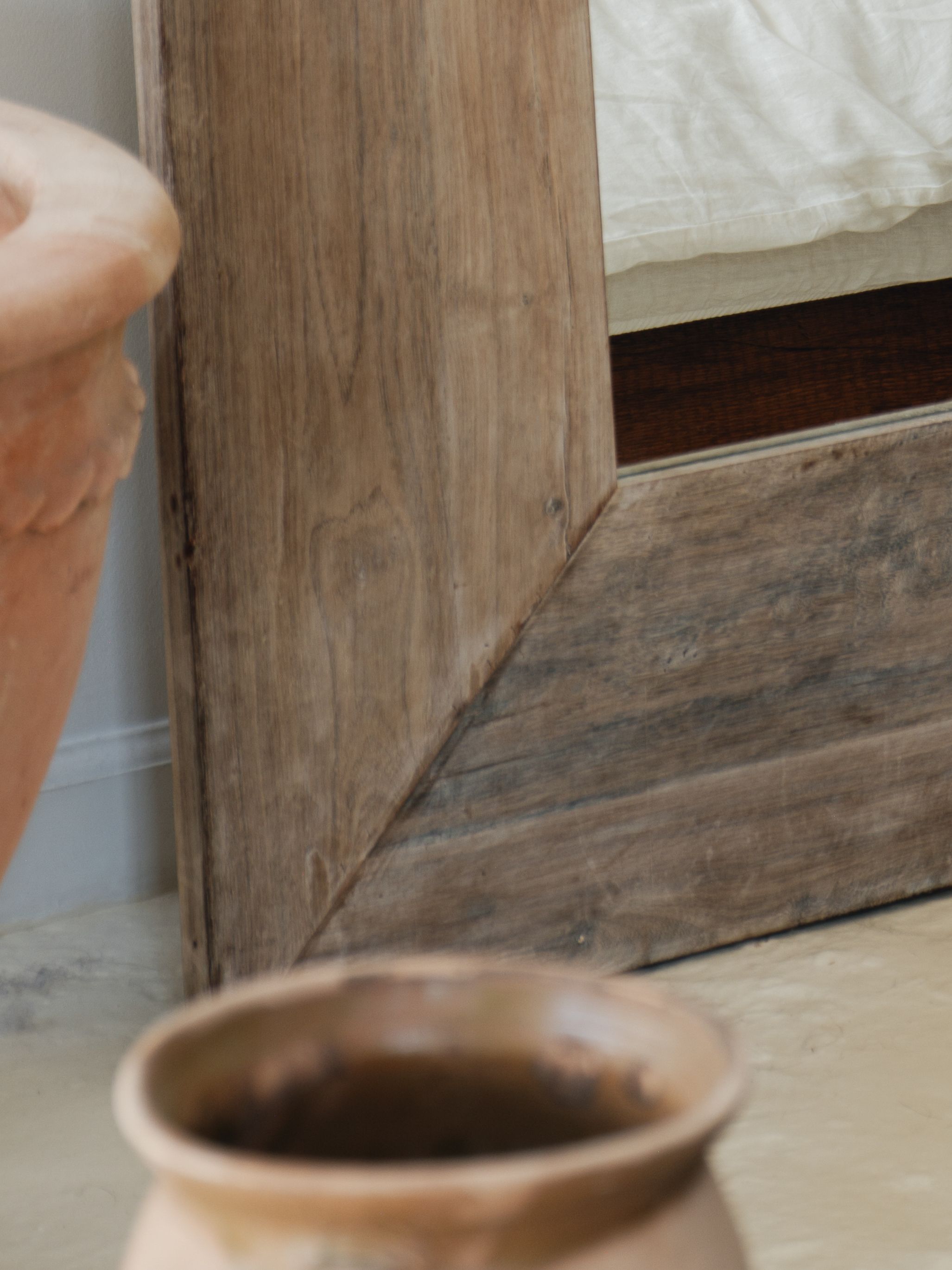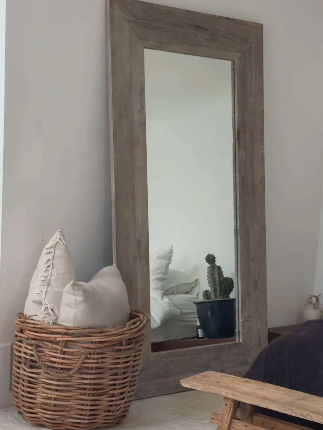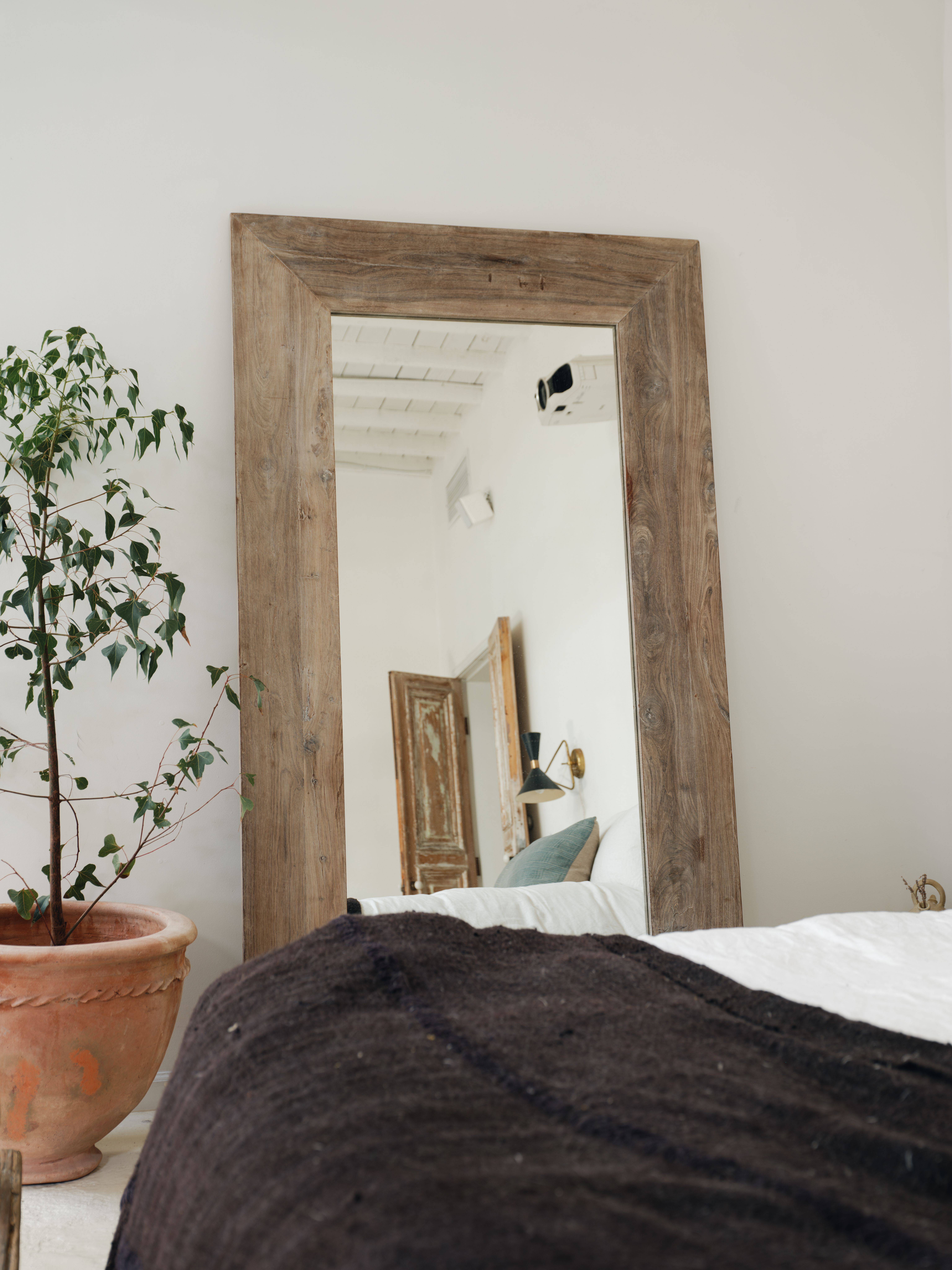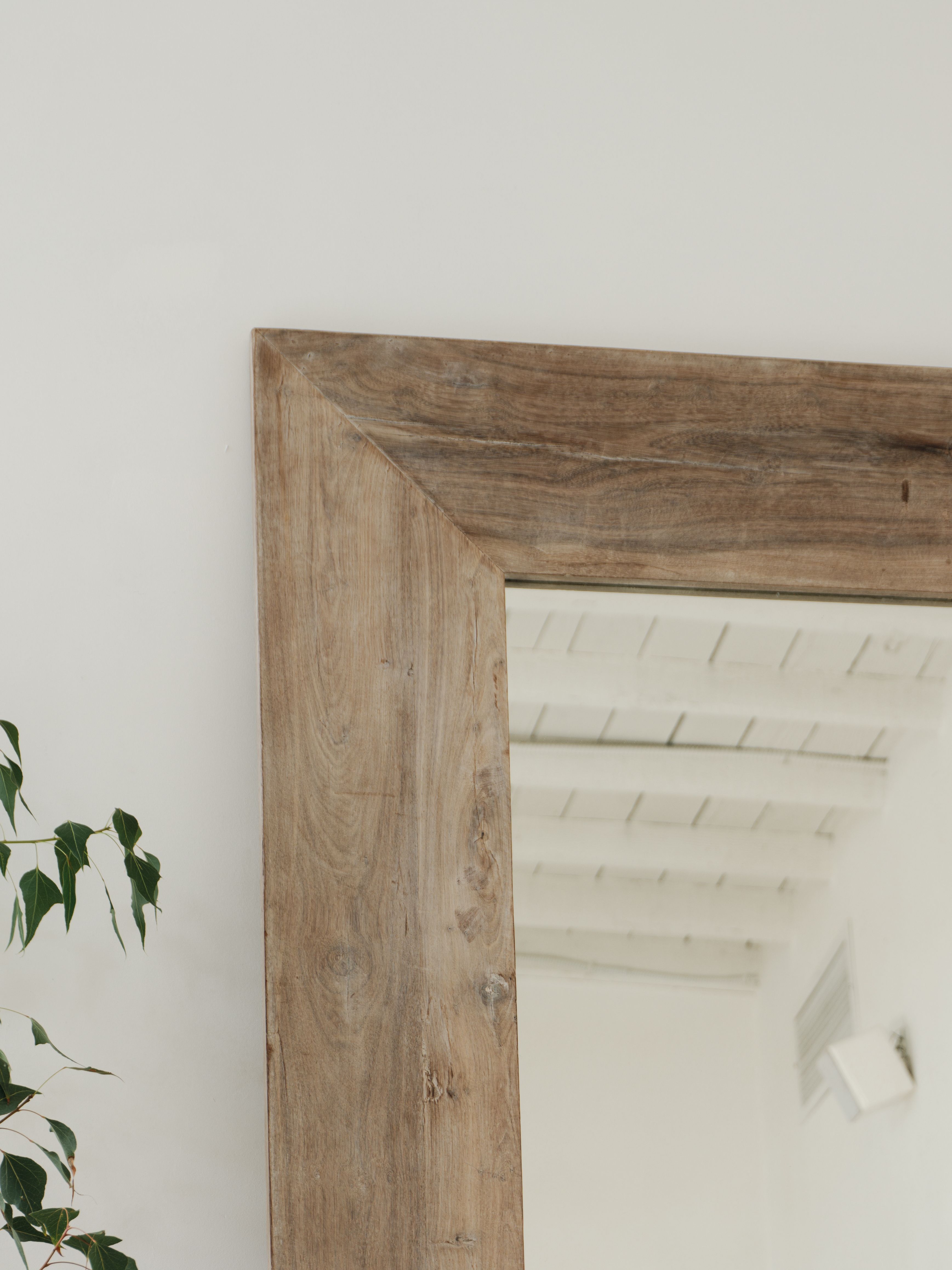 This oversized floor mirror, crafted by artisans from reclaimed mango wood, is both a statement piece and a reflection of thoughtful design. The richly textured frame highlights the natural grain and imperfections of the salvaged wood, giving each mirror its own distinct character. With its generous size, this mirror brings depth and light to any space, whether leaning casually against a wall or standing as a centerpiece.