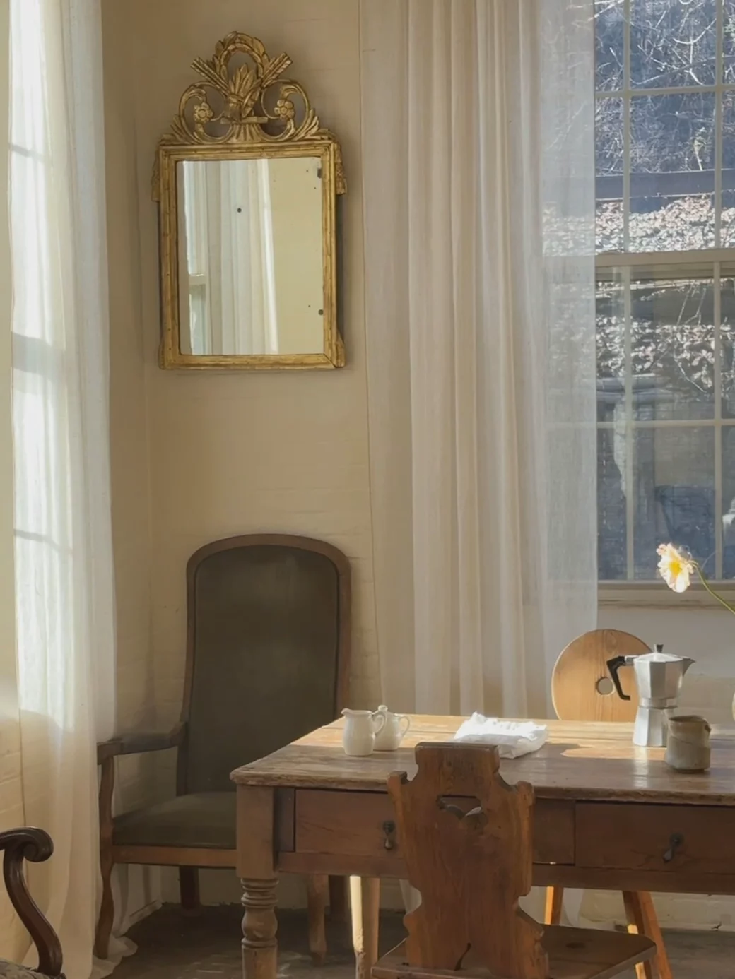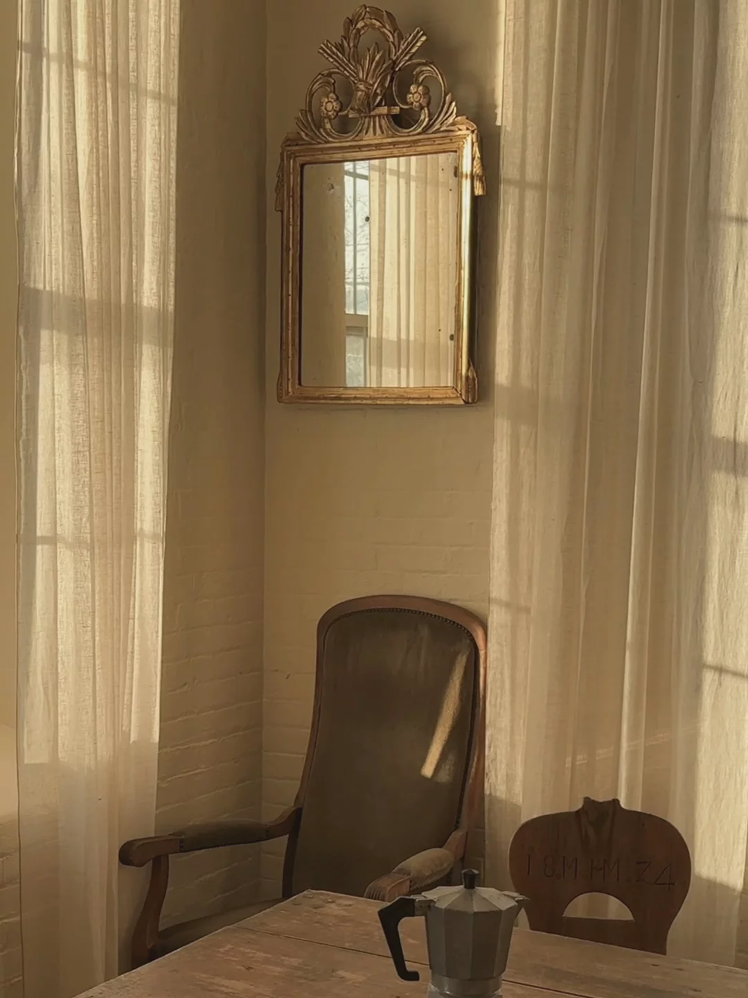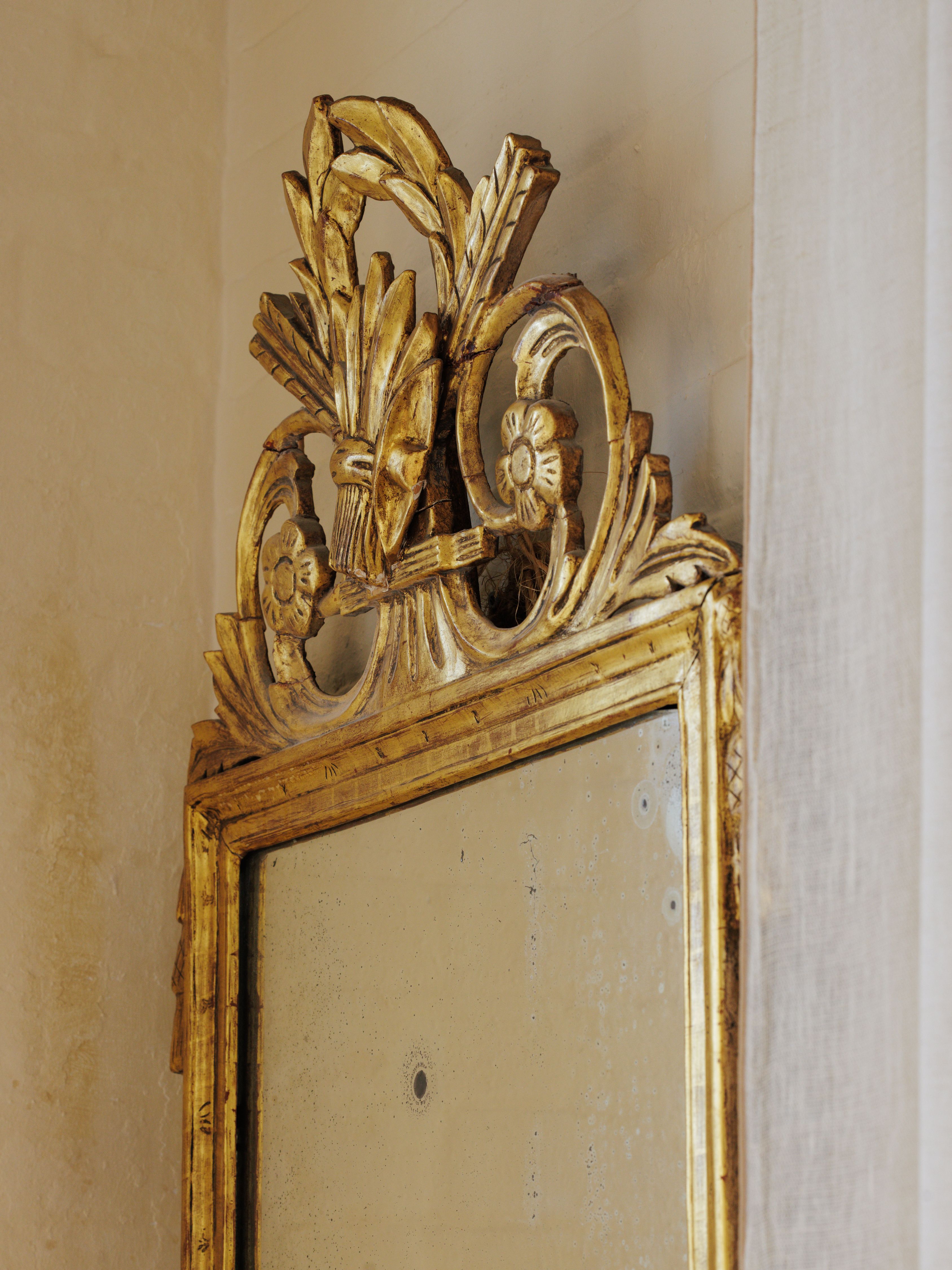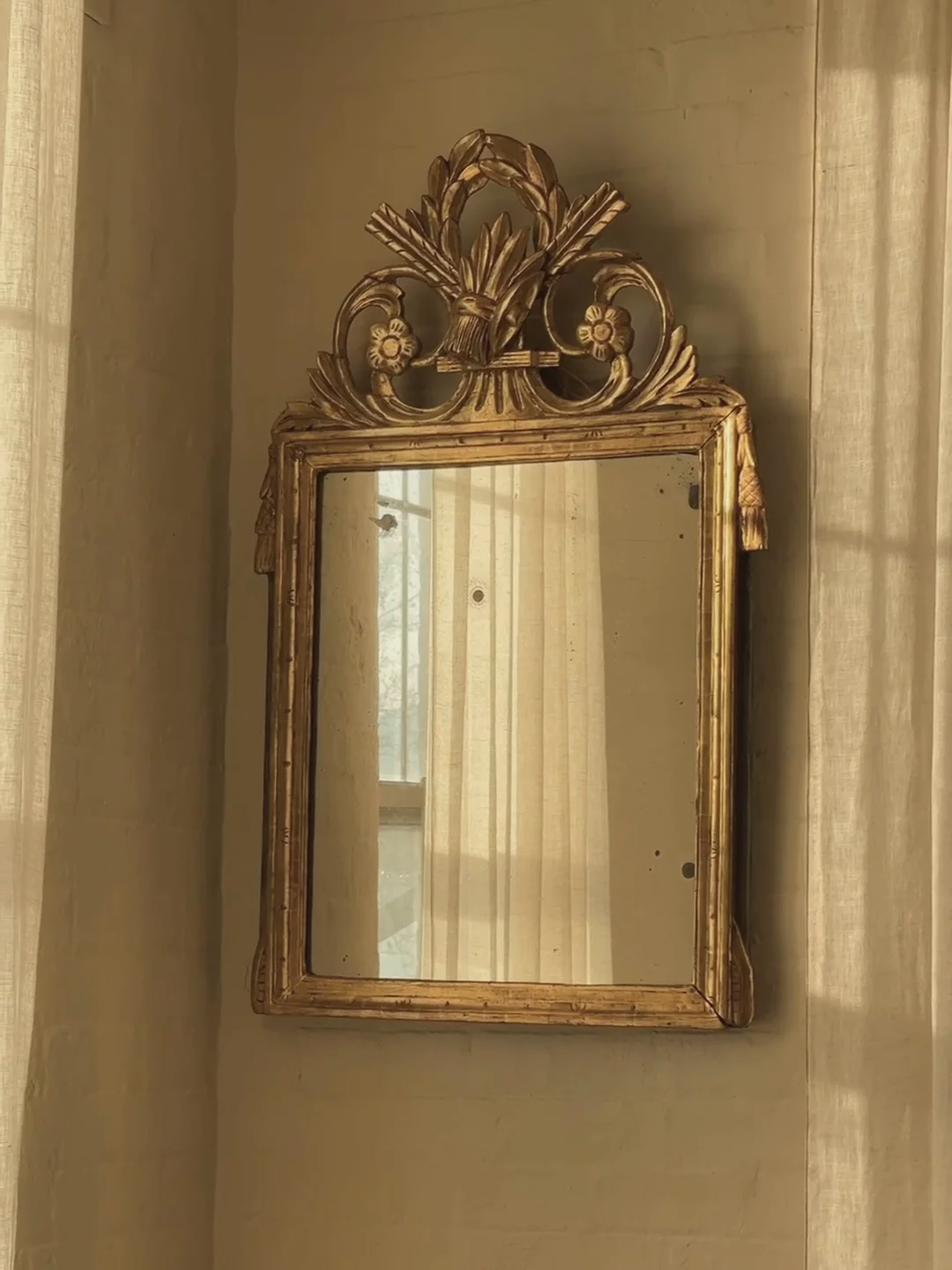 This antique French gilt mirror is breathtaking. Unearthed from a third-generation dealer in Aix-en-Provence. Its hand-carved giltwood frame featuring a sheaf of wheat motif, symbolizing prosperity and abundance—a design that is both deeply symbolic and exquisitely detailed.