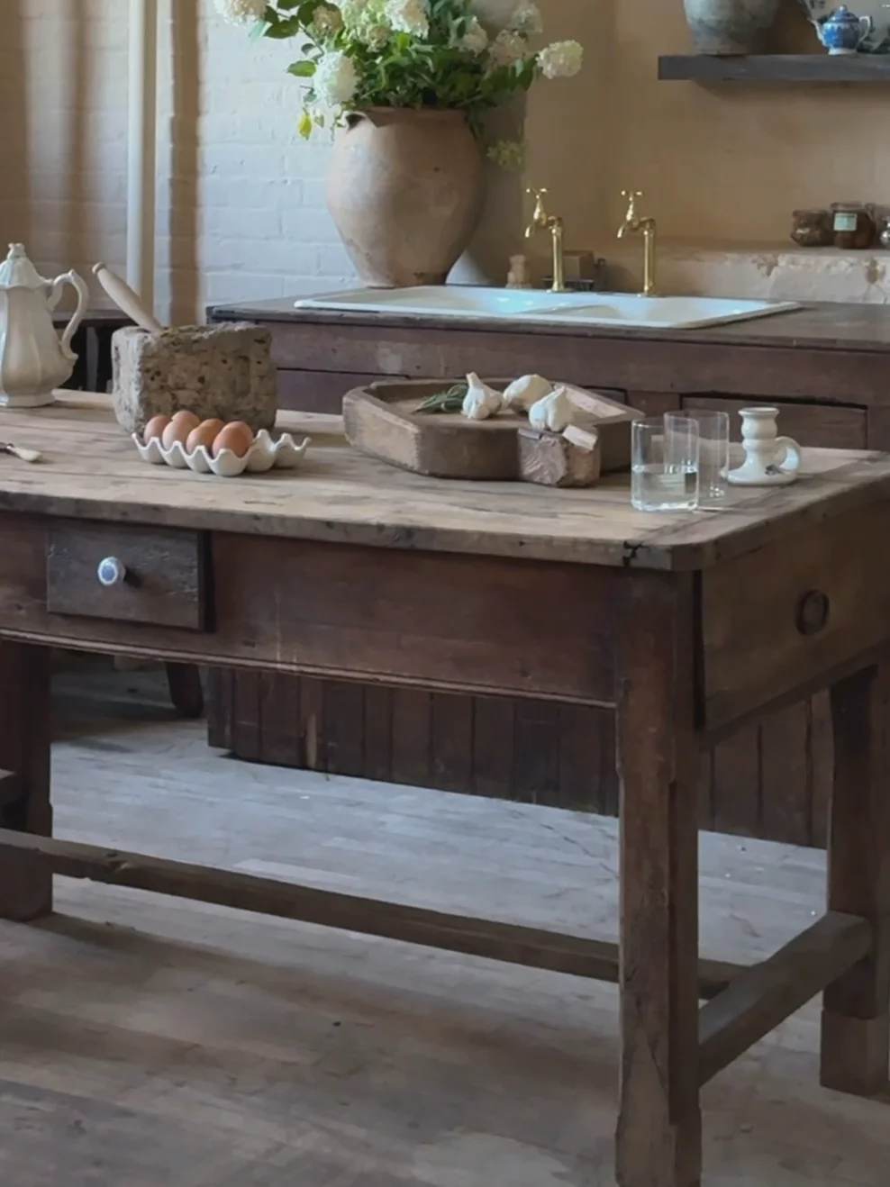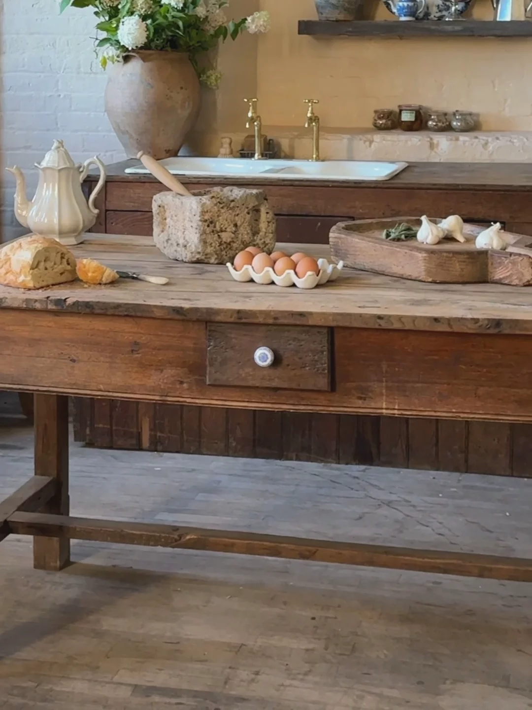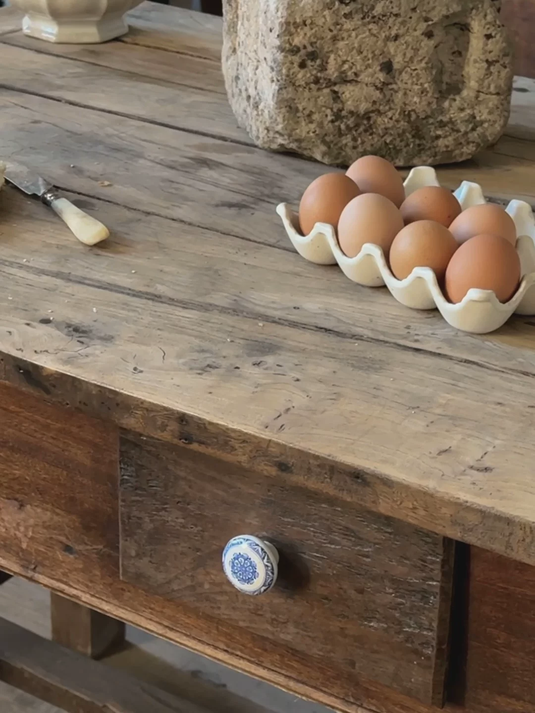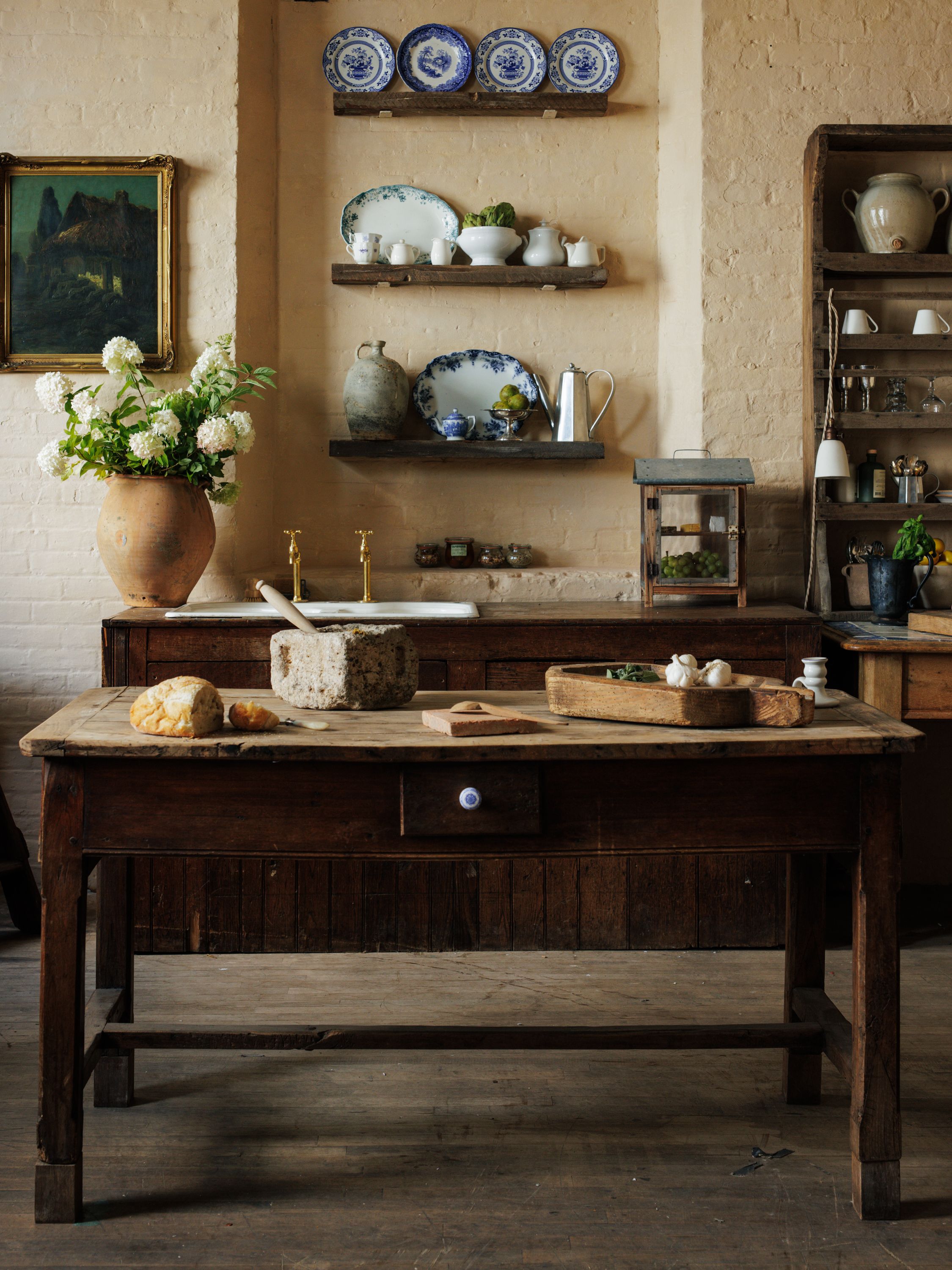 You asked for it, and we delivered. Introducing the French kitchen island, with four drawers and a lot of character. Originating from the French Alps in the 19th century and crafted from dark wood, our favorite quirk of this beauty is her ceramic blue and white drawer pulls. A true one of a kind, exactly as pictured.