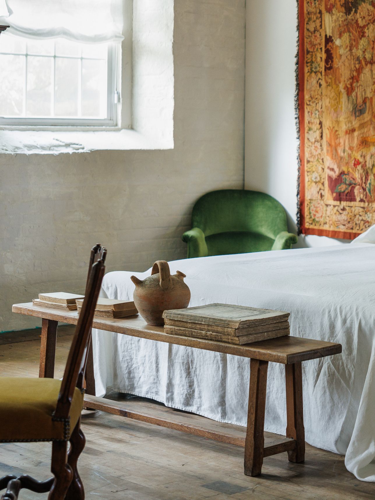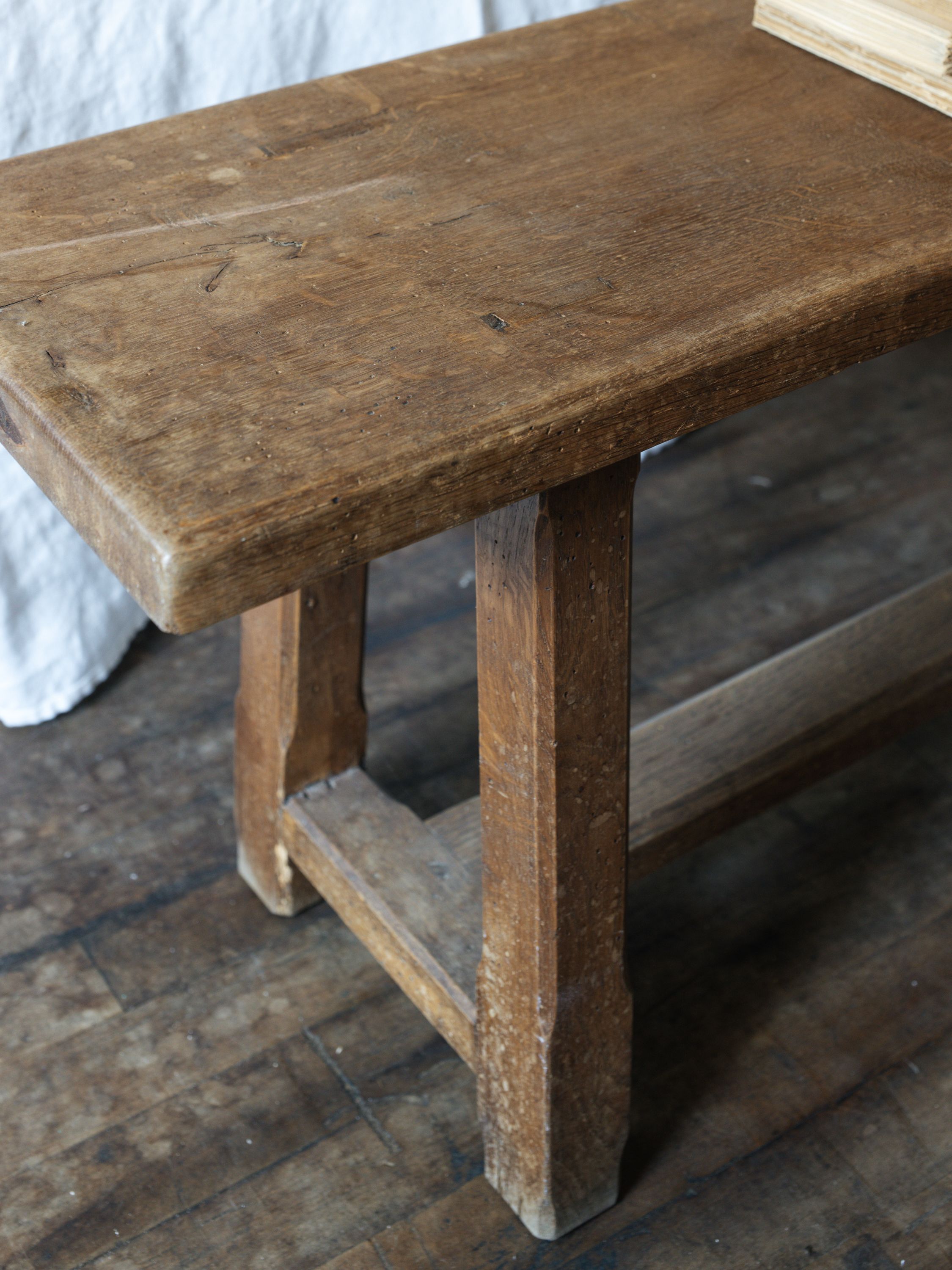 This French solid oak bench, in remarkable condition, features unusual rectangular through tenons and a stretcher across the legs, this piece is showcasing some old world woodworking skills. Sylvie would put two of these benches on either side of a long farmhouse table for dinner with friends, or along the foot of her bed. Two available.