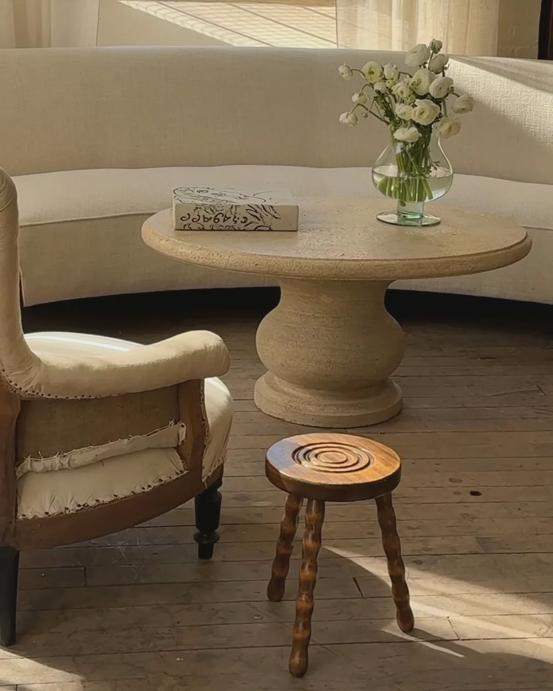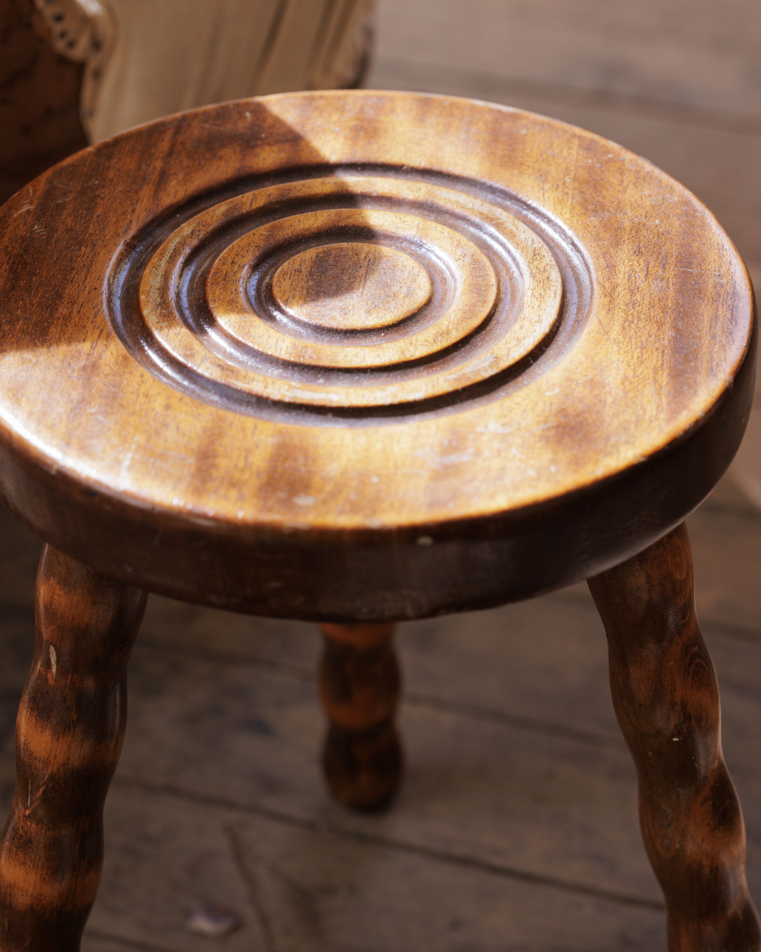 A true market find, this highly ornate mid-century French tripod stool was discovered in a bustling street market in Uzès, tucked among a sea of other stools. A masterpiece of turned wood and thoughtful craftsmanship, its sculptural form and sturdy design make it a standout. Whether styled as a petite side table, a minimal nightstand, or left as a striking standalone piece, this one-of-a-kind treasure won’t stick around for long.