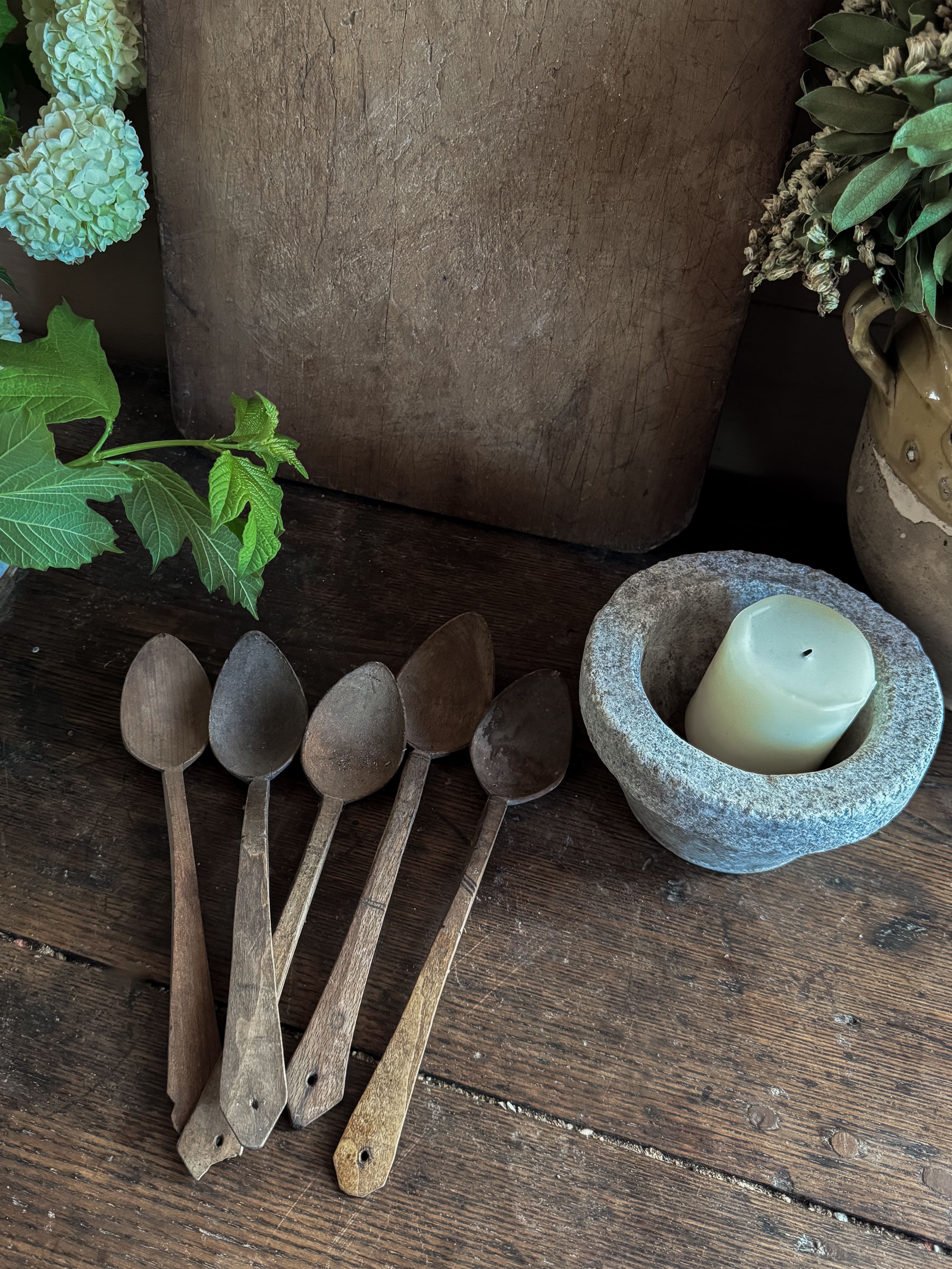 Tumble down the rabbit hole with our set of Hungarian Vintage Wood Spoons, a primitive addition to your kitchen counter top. Sourced from the heart of Hungary, each spoon is hand carved by local artisans. This set of 5 spoons is only for decoration dear collector, thou shall not consume food off them.