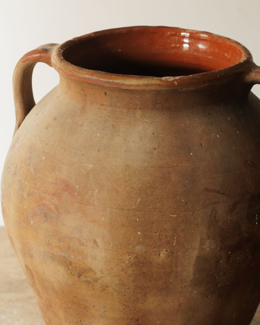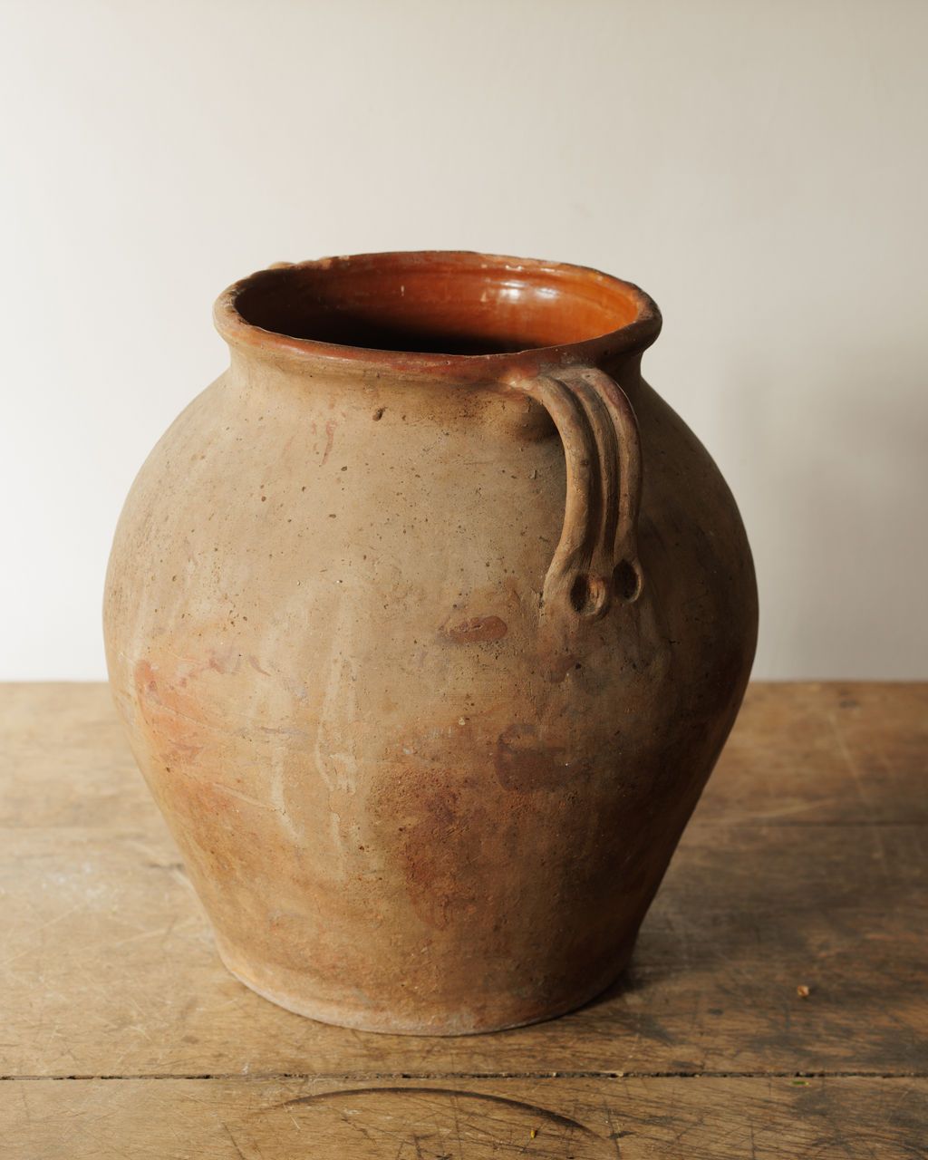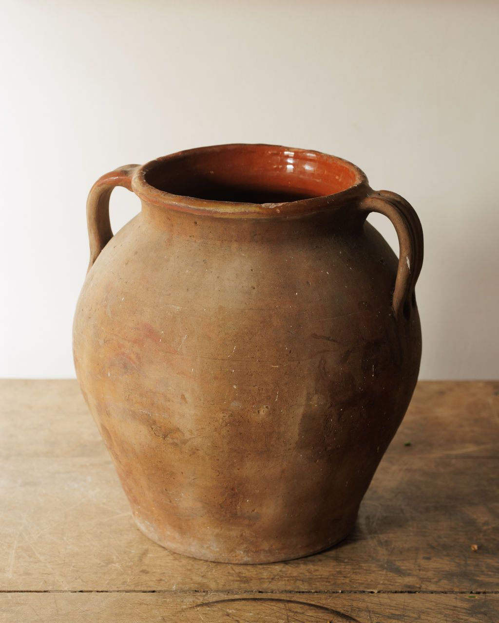 Curves for days. This handled pot was found in Avignon and features a warm terracotta body with a glossy glazed interior, once used to store preserved foods or oils in a French kitchen. Sylvie fills it with wildflowers or sets it on a shelf just as it is, admiring that classic silhouette. Exactly as pictured.