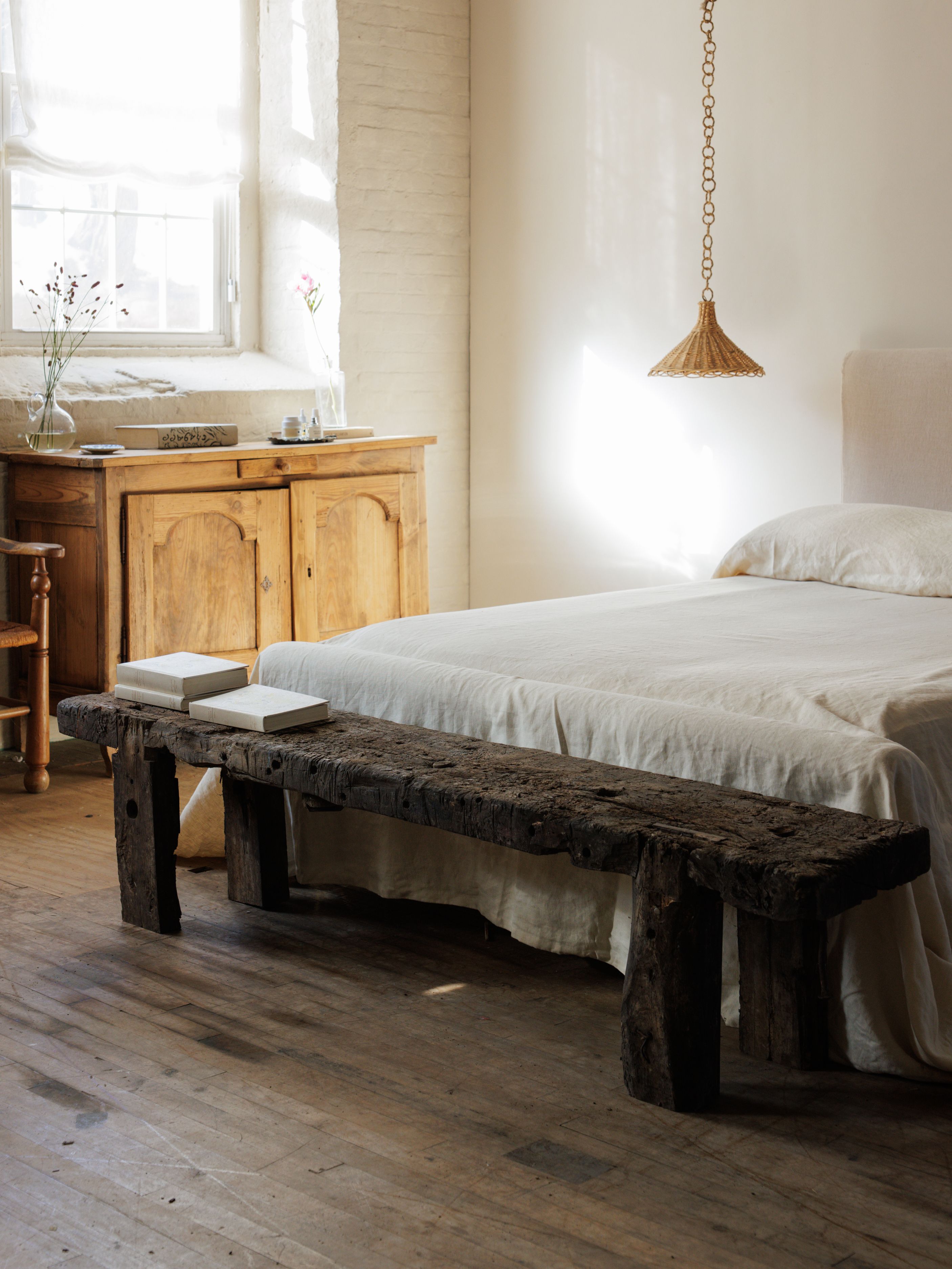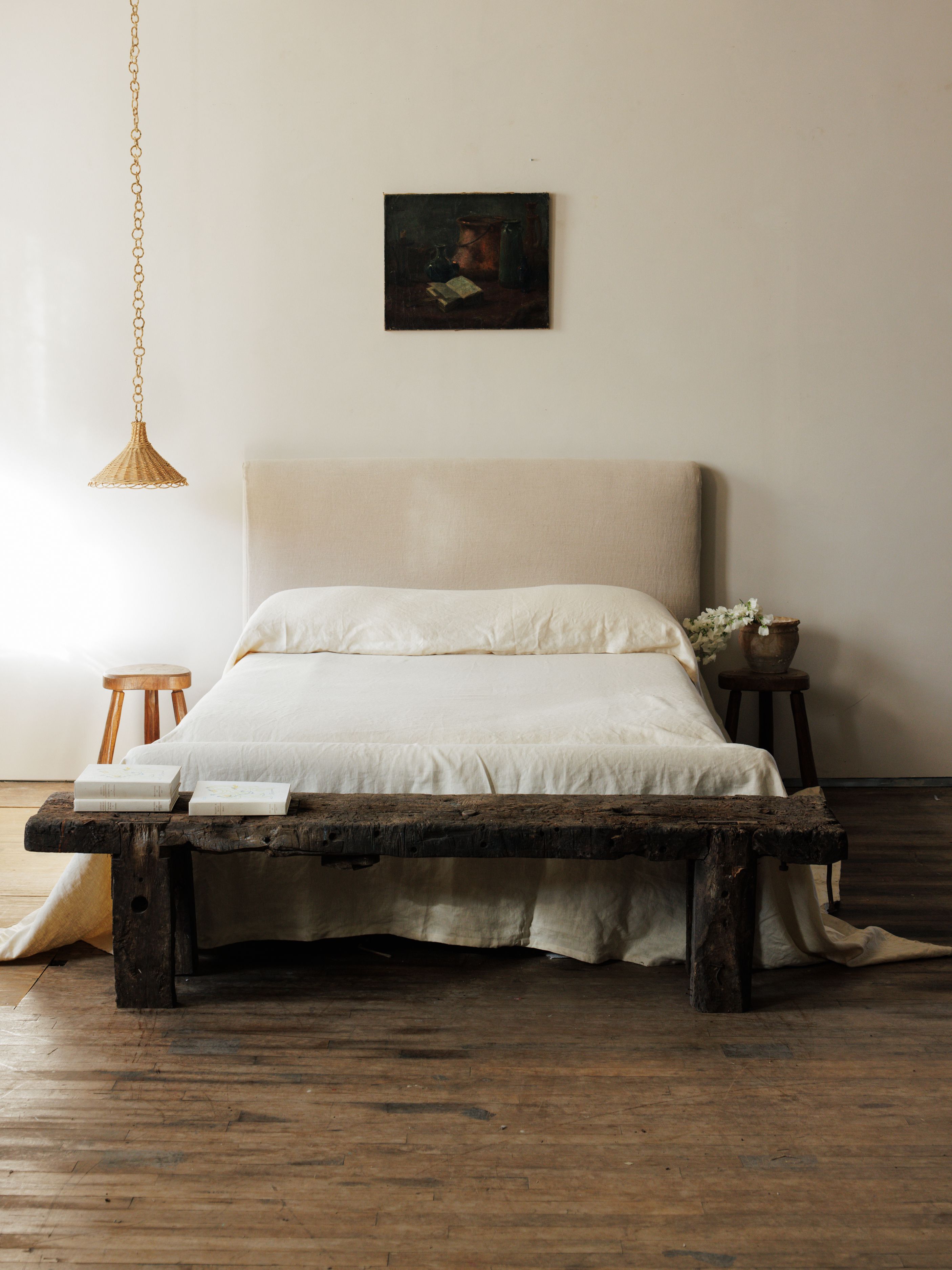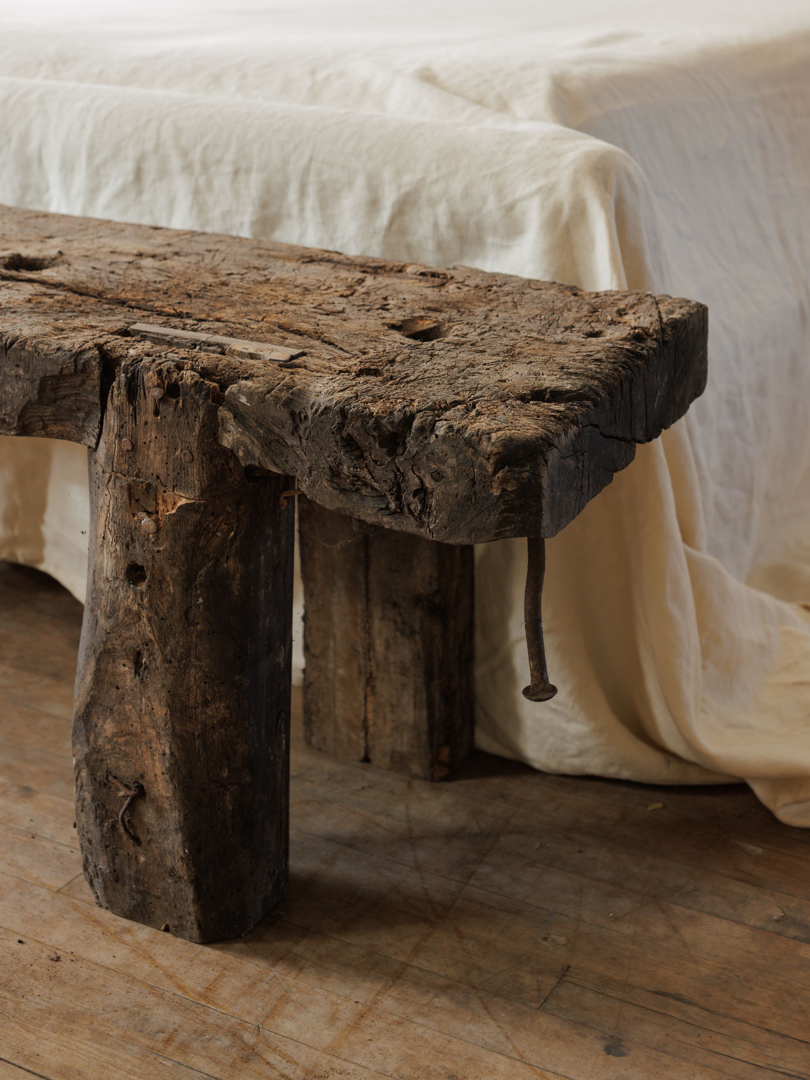 Found in Aveyron, this 19th-century French workbench has lived a long life. Cut down to perfection, its thick, weathered slab rests on legs that still bear the marks of heavy use - saw cuts, iron hardware, deep grooves from decades of work. The patina is rich, darkened by time, with every crack and knot telling its own story. Now, it’s ready for a new chapter - as a bench at the foot of a bed, a grounding piece in an entryway, or a wabi sabi coffee table.