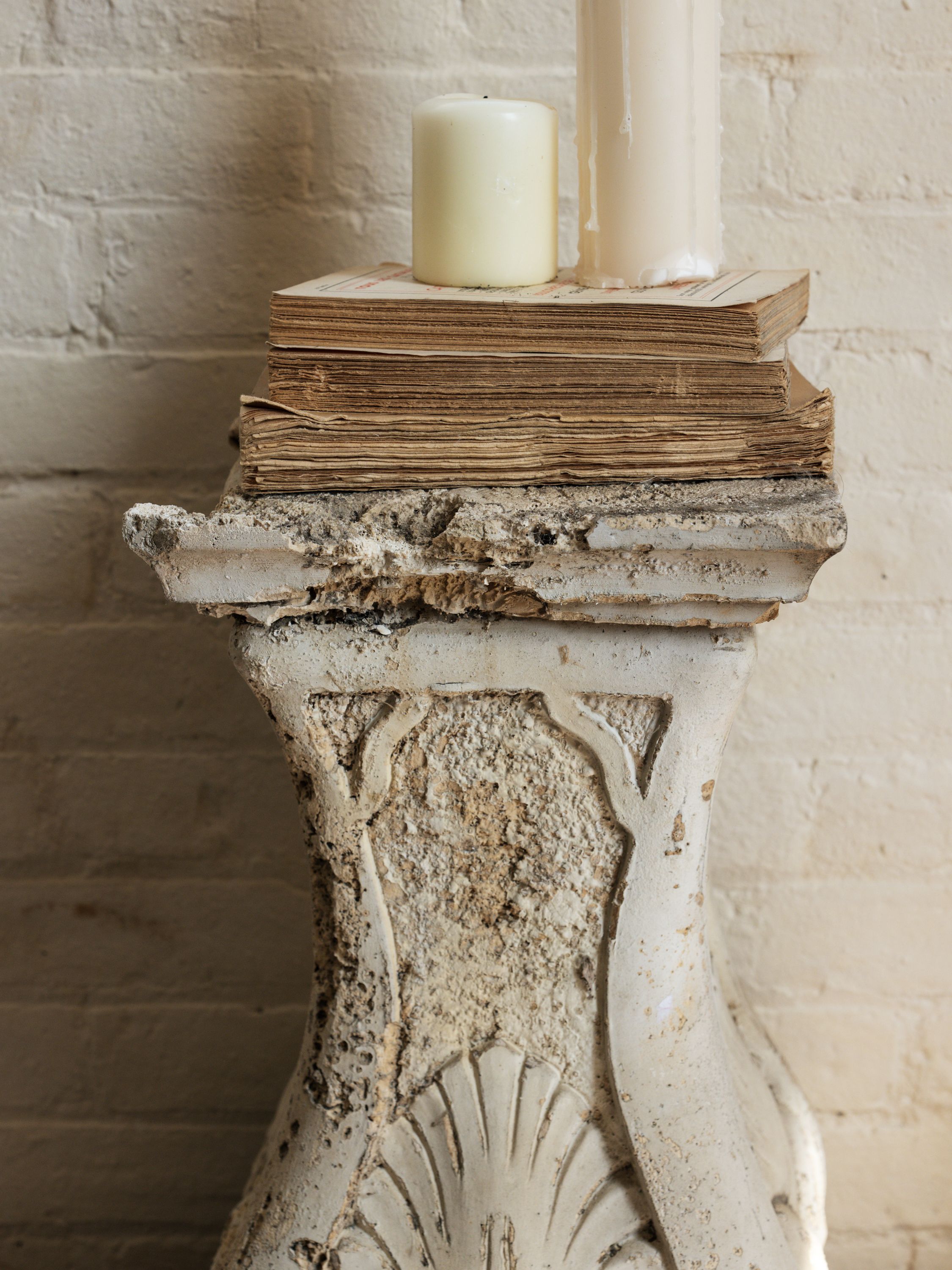 This Art Deco style white pedestal, originally designed as a garden ornament, showcases a beautiful shell motif and a richly weathered, porous surface. It’s ideal for displaying large vessels or sculptures, making a bold statement in an entryway or garden corner.