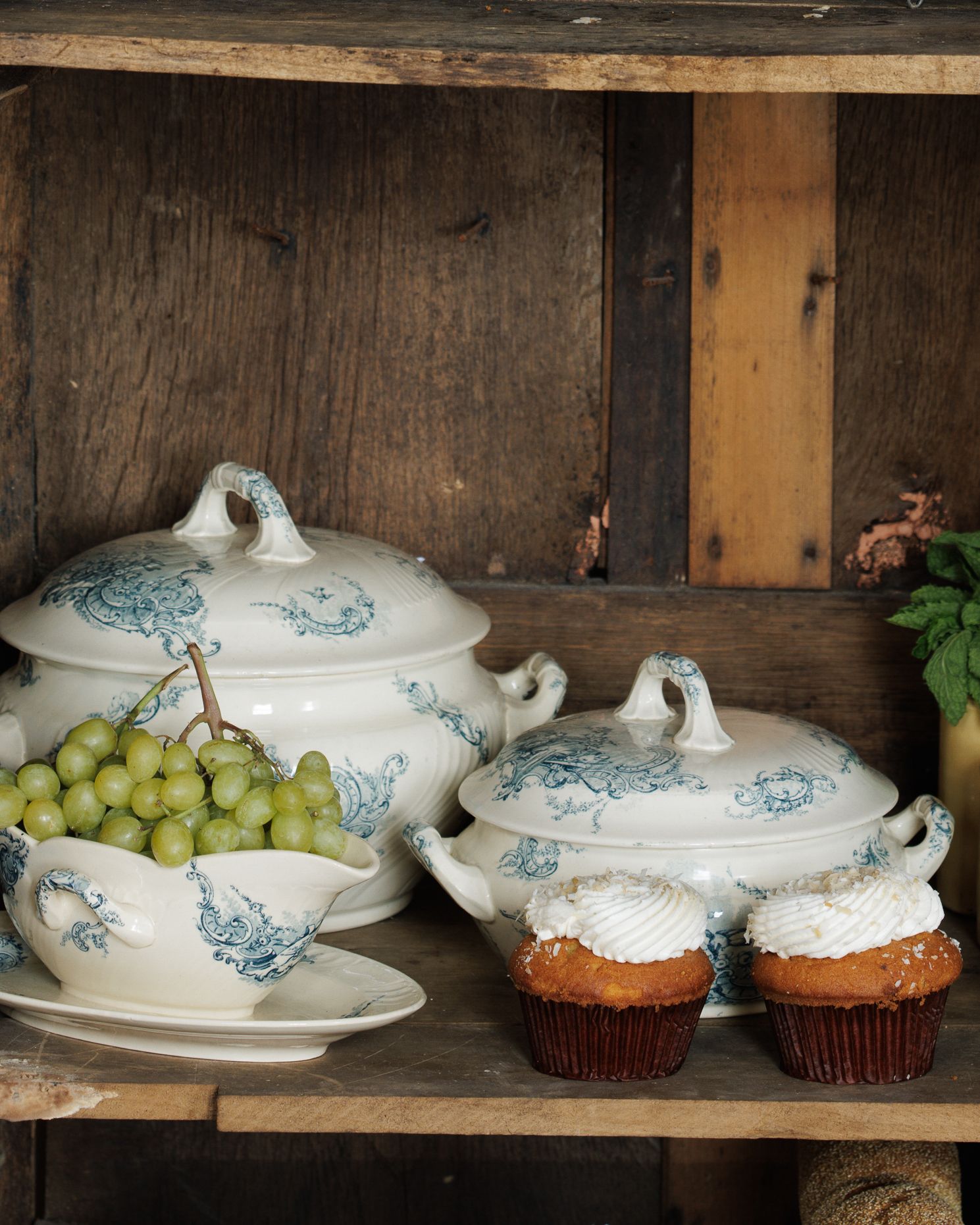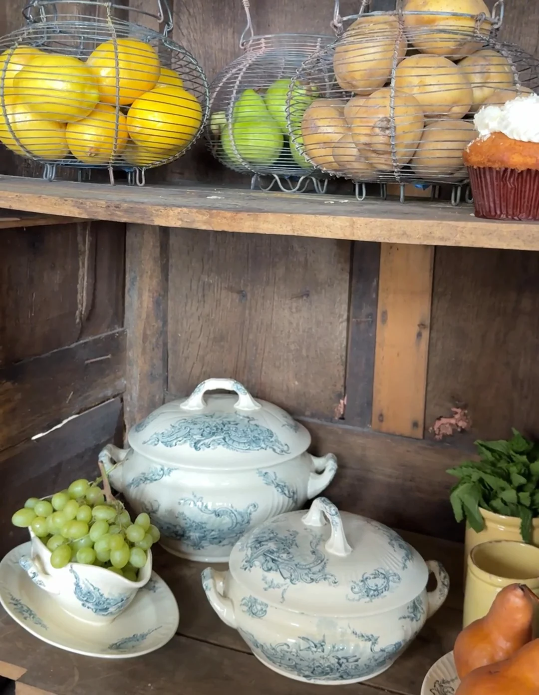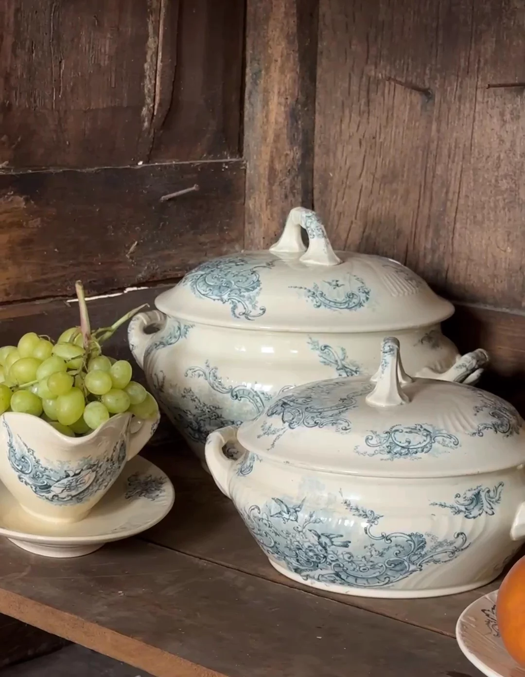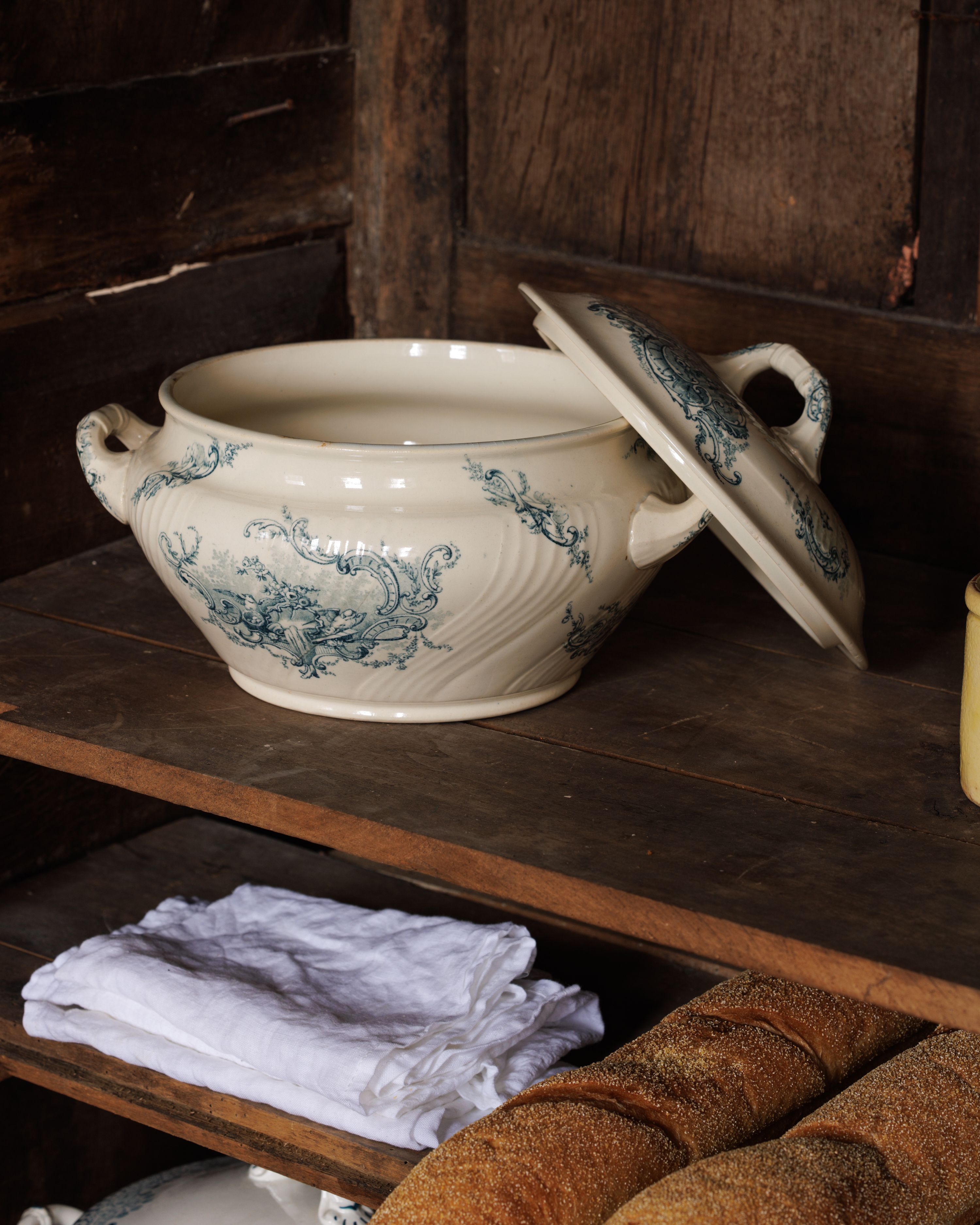 Found in Villeneuve-lès-Avignon, this late 19th-century French tureen is decorated in deep blue scrollwork, with a pedestal base, looped handles, and a matching lid. The glaze has softened over time, and there are faint signs of age throughout - exactly what we look for. We found two. Sylvie keeps one on her counter filled with lemons, the other on a shelf where it earns its keep just by sitting there. Two sizes available. Exactly as pictured