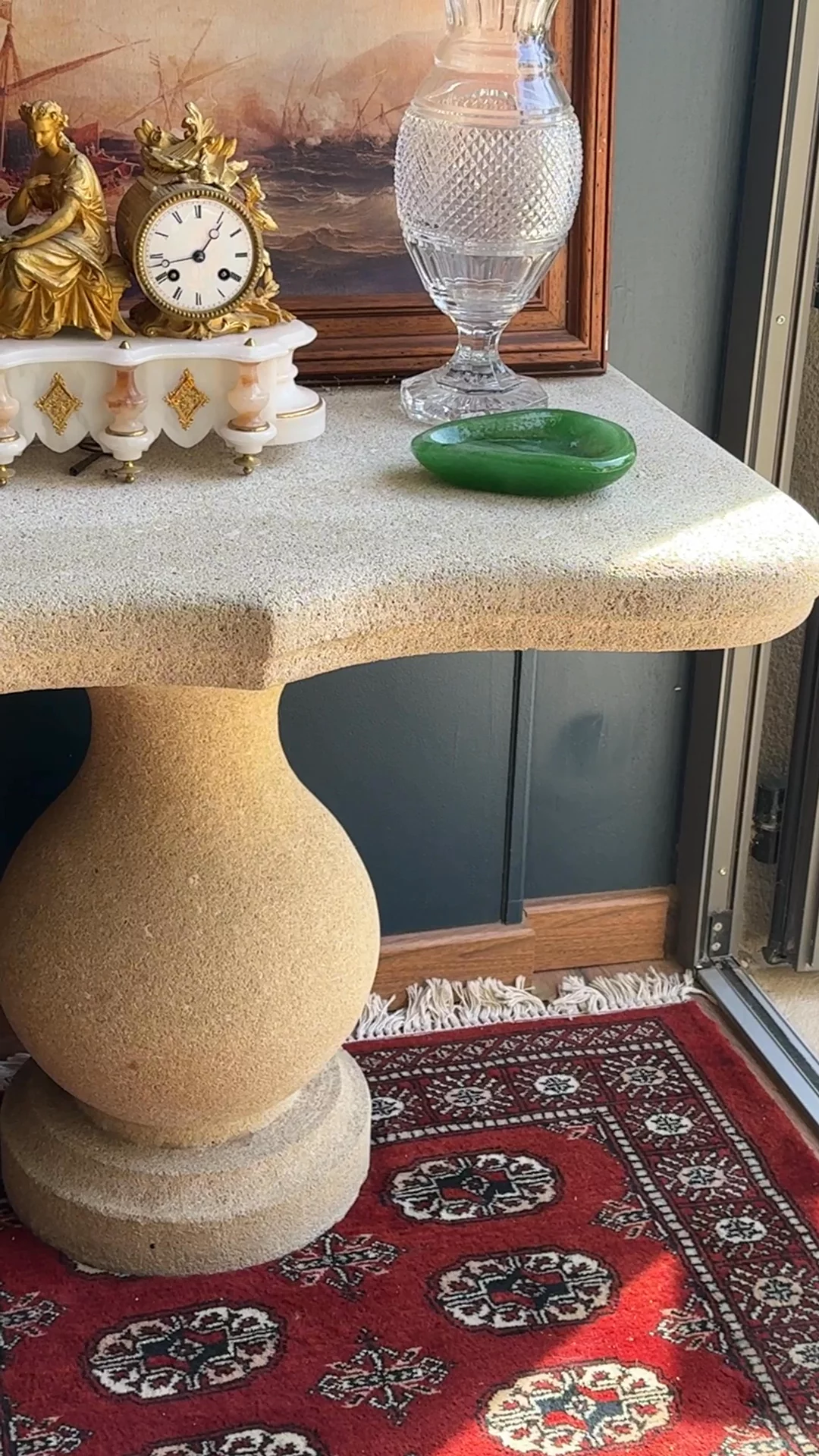 Carved from St. Gens stone, pulled straight from the Rhône River in Beaucaire, this console has the kind of presence you don’t come across often. A local stone carver made it for his own home in the early 20th century, shaping the heavy base by hand and leaving just enough softness in the edges to show its age. The texture, the weight, the history - it’s all there. Perfect as an entryway piece or as pedestal for your favorite oversized vessel. A true Provençal relic, built to stand the test of time.