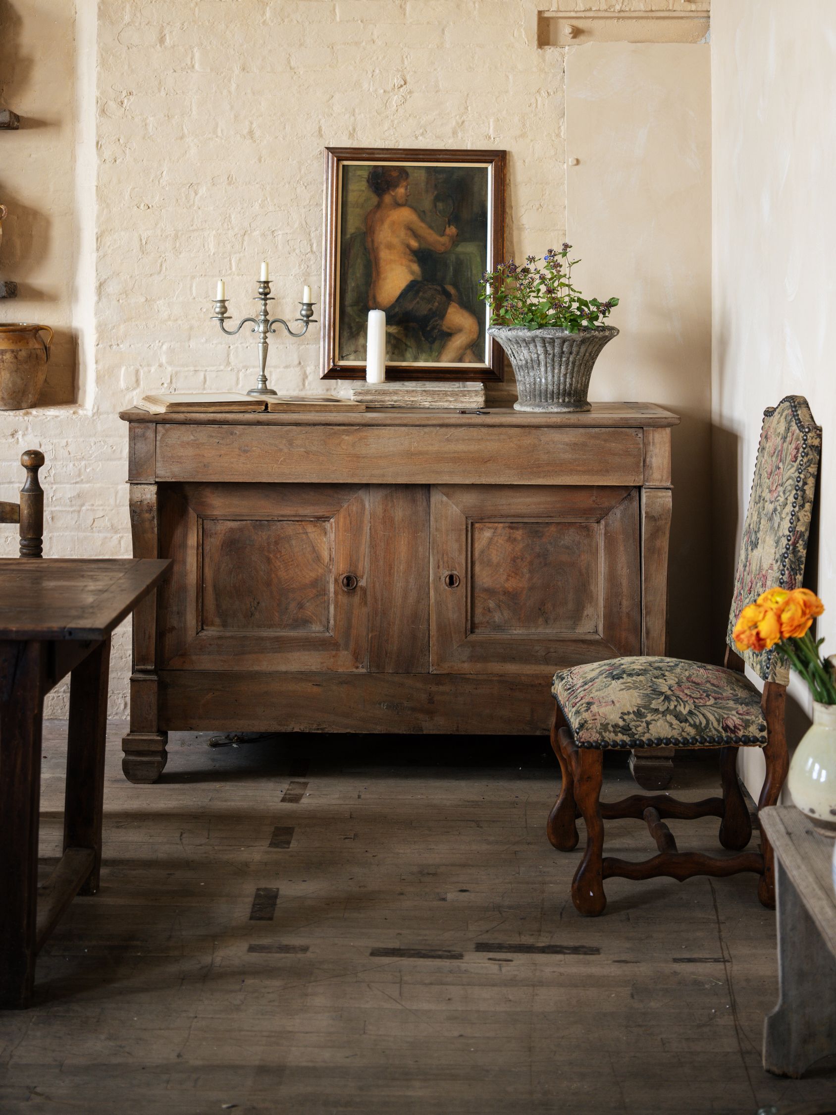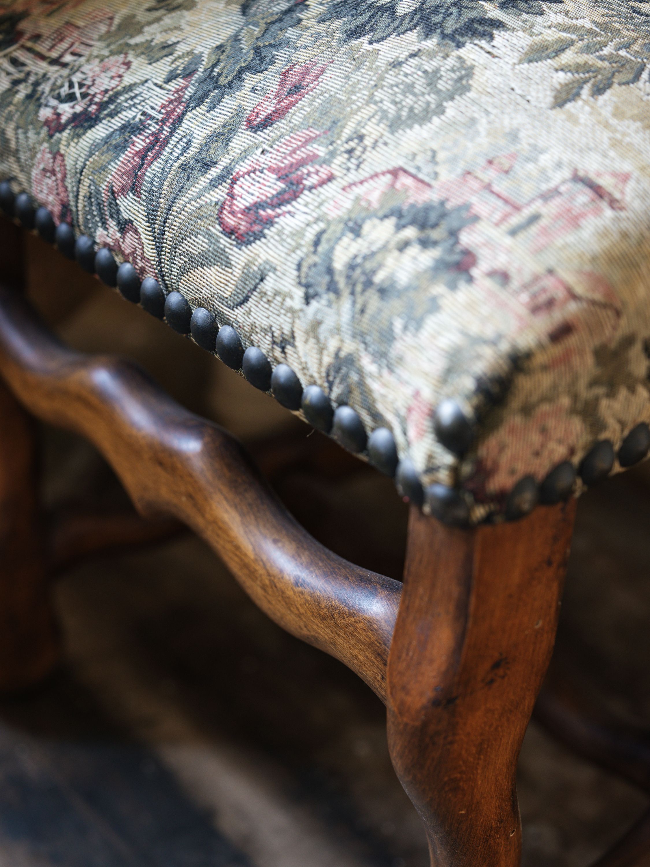 What's better than a chair upholstered in a tapestry? We'll wait...These tall-back dining chairs, featuring an intricately woven woodland tapestry scene are beautifully worn with threadbare spots adding to its character. Perfect for a dining room or as statement accent chair. Expect variations in wear and tear, patina and coloring.